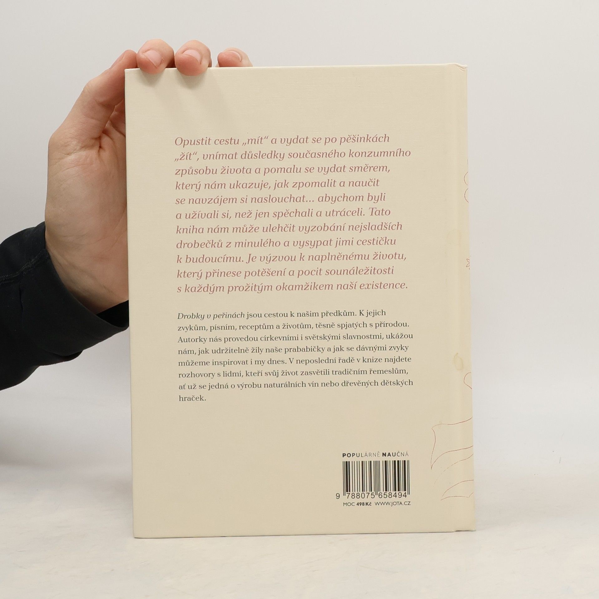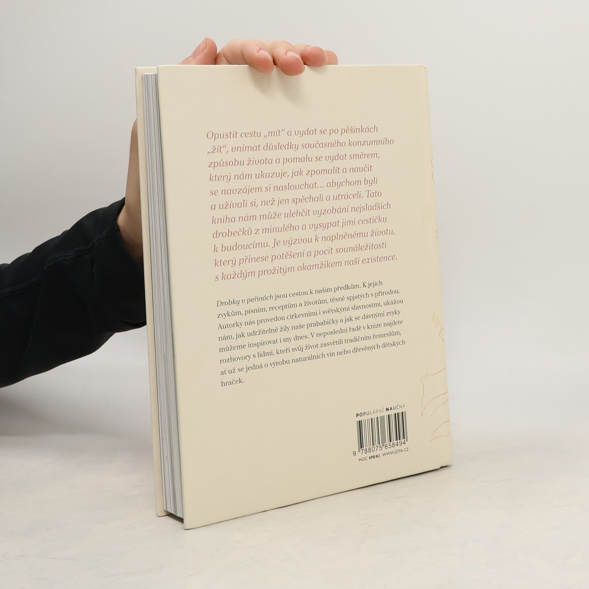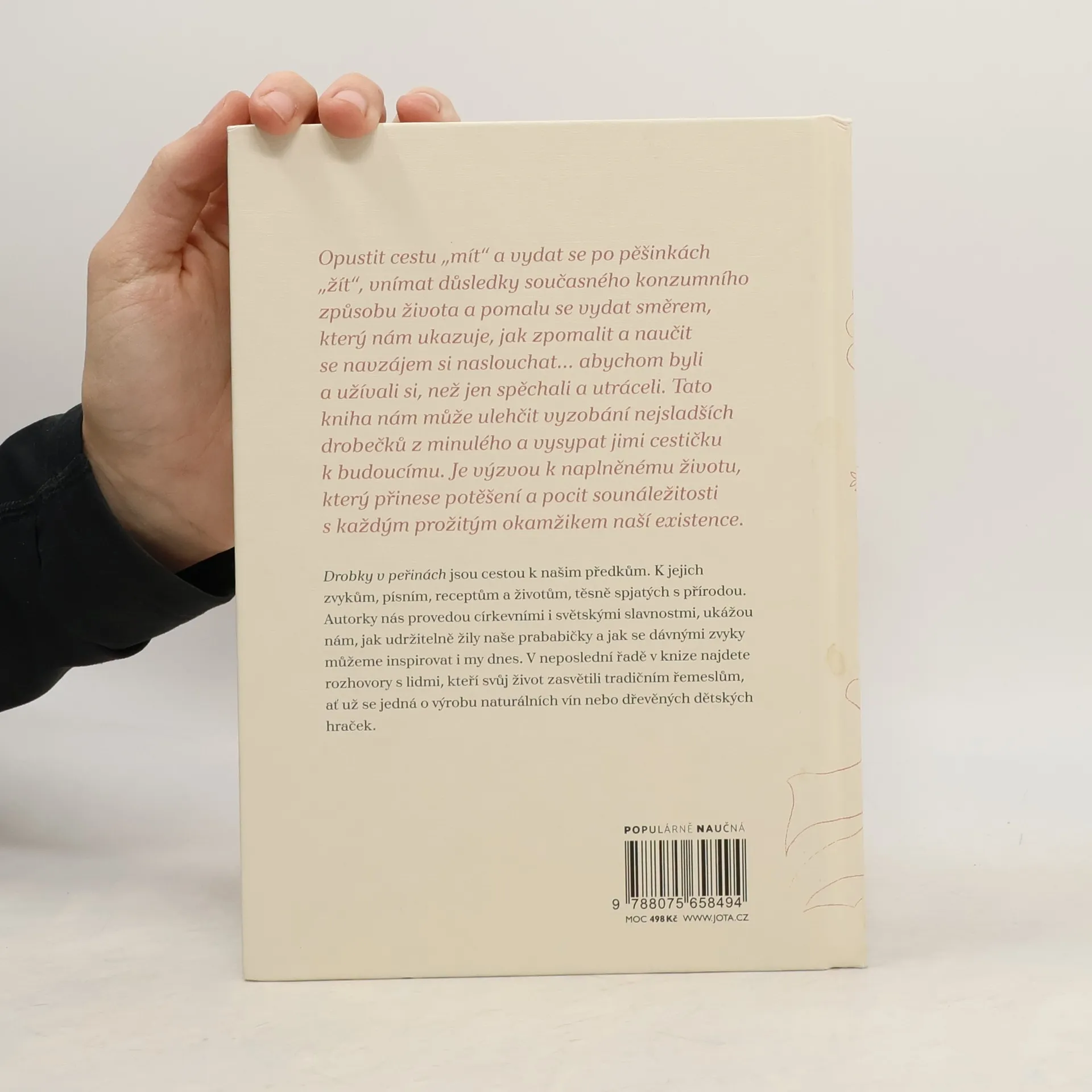 Autorky knihy přibližují život našich předků a s lehkostí a vtipem nabádají k osvojení dávných zvyků a rituálů, které vedou k vědomějšímu a spokojenějšímu životu v souladu s přírodou. Kapitola Nuda nebude po celý rok vás provede zvykoslovným rokem, popisuje tradice spojené s různými slavnostmi a nabízí alternativy, jak prožít rok zvyků dnes. V kapitole Jaký kroj, tak se stroj se autorky zaměřují na inspiraci od babiček, které recyklovaly oděv a oblékaly staré kousky nově. Dotýkají se udržitelné módy, ekotextilu a nových cest současného módního průmyslu. Kniha obsahuje rozhovory s lidmi, kteří našli smysl v tradičním řemeslu a začali vyrábět naturální vína nebo dřevěné hračky podporující zdravý pohyb dětí. Autorky vyzývají k opuštění cesty „mít“ a zaměření na „žít“, vnímat důsledky globální existence a učit se naslouchat. Tato kniha usnadňuje vyzobání sladkých drobečků z minulosti a ukazuje cestu k budoucnosti. Je výzvou k naplněnému životu, který přináší potěšení a pocit sounáležitosti s každým prožitým okamžikem.