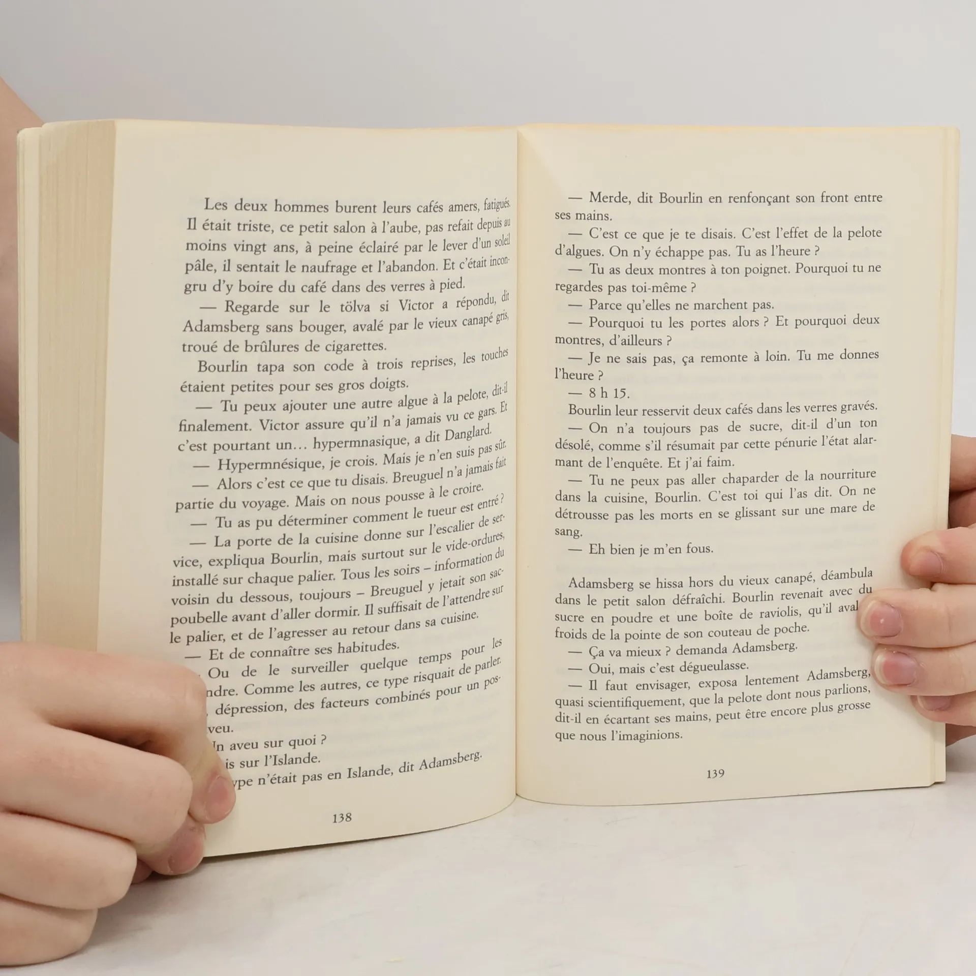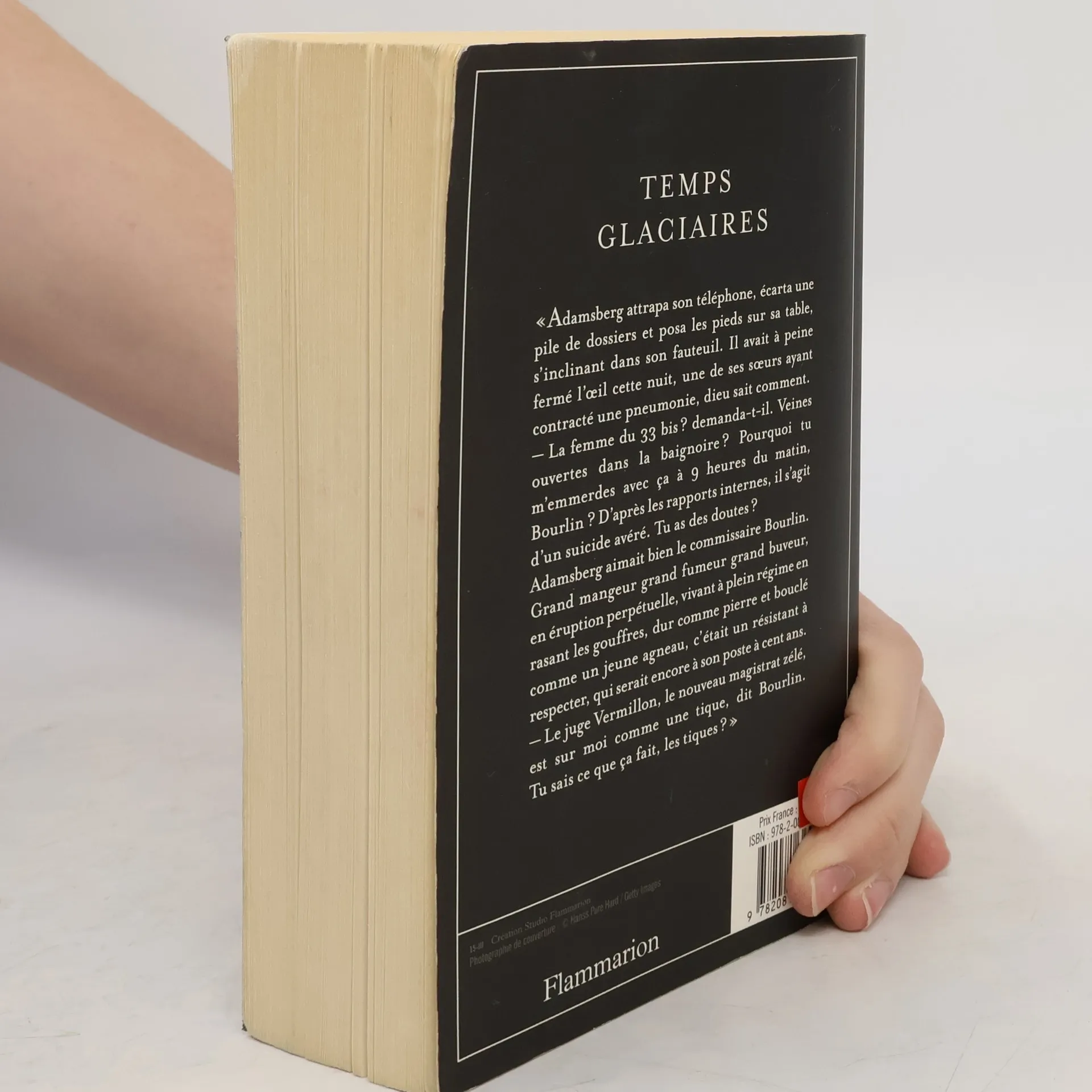 "Adamsberg attrapa son téléphone, écarta une pile de dossiers et posa les pieds sur sa table, s'inclinant dans son fauteuil. Il avait à peine fermé l'oeil cette nuit, une de ses soeurs ayant contracté une pneumonie, dieu sait comment. La femme du 33 bis ? demanda-t-il. Veines ouvertes dans la baignoire ? Pourquoi tu m'emmerdes avec ça à 9 heures du matin, Bourlin ? D'après les rapports internes, il s'agit d'un suicide avéré. Tu as des doutes ? Adamsberg aimait bien le commissaire Bourlin. Grand mangeur grand fumeur grand buveur, en éruption perpétuelle, vivant à plein régime en rasant les gouffres, dur comme pierre et bouclé comme un jeune agneau, c'était un résistant à respecter, qui serait encore à son poste à cent ans. Le juge Vermillon, le nouveau magistrat zélé, est sur moi comme une tique, dit Bourlin. Tu sais ce que ça fait, les tiques ?".