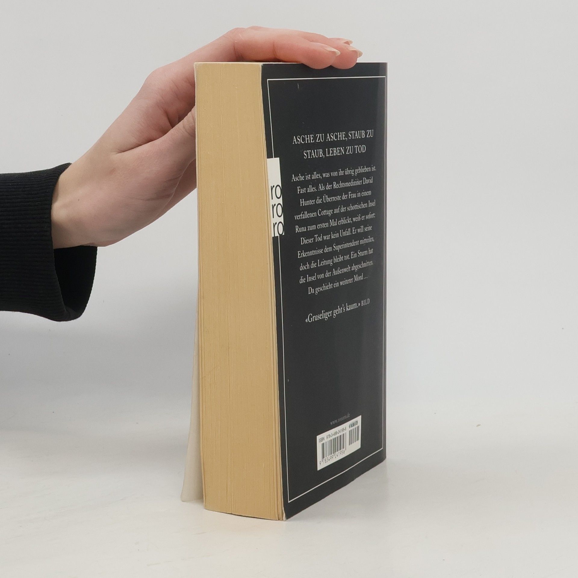 Asche zu Asche, Staub zu Staub, Leben zu Tod. Asche ist alles, was von ihr übrig geblieben ist. Fast alles. Als der Rechtsmediziner David Hunter die Überreste der Frau in einem verfallenen Cottage auf der schottischen Insel Runa zum ersten Mal erblickt, weiß er sofort: Dieser Tod war kein Unfall. Er will seine Erkenntnisse dem Superintendenten mitteilen, doch die Leitung bleibt tot. Ein Sturm hat die Insel von der Außenwelt abgeschnitten. Da geschieht ein weiterer Mord. «Gruseliger geht’s kaum.» (Bild)