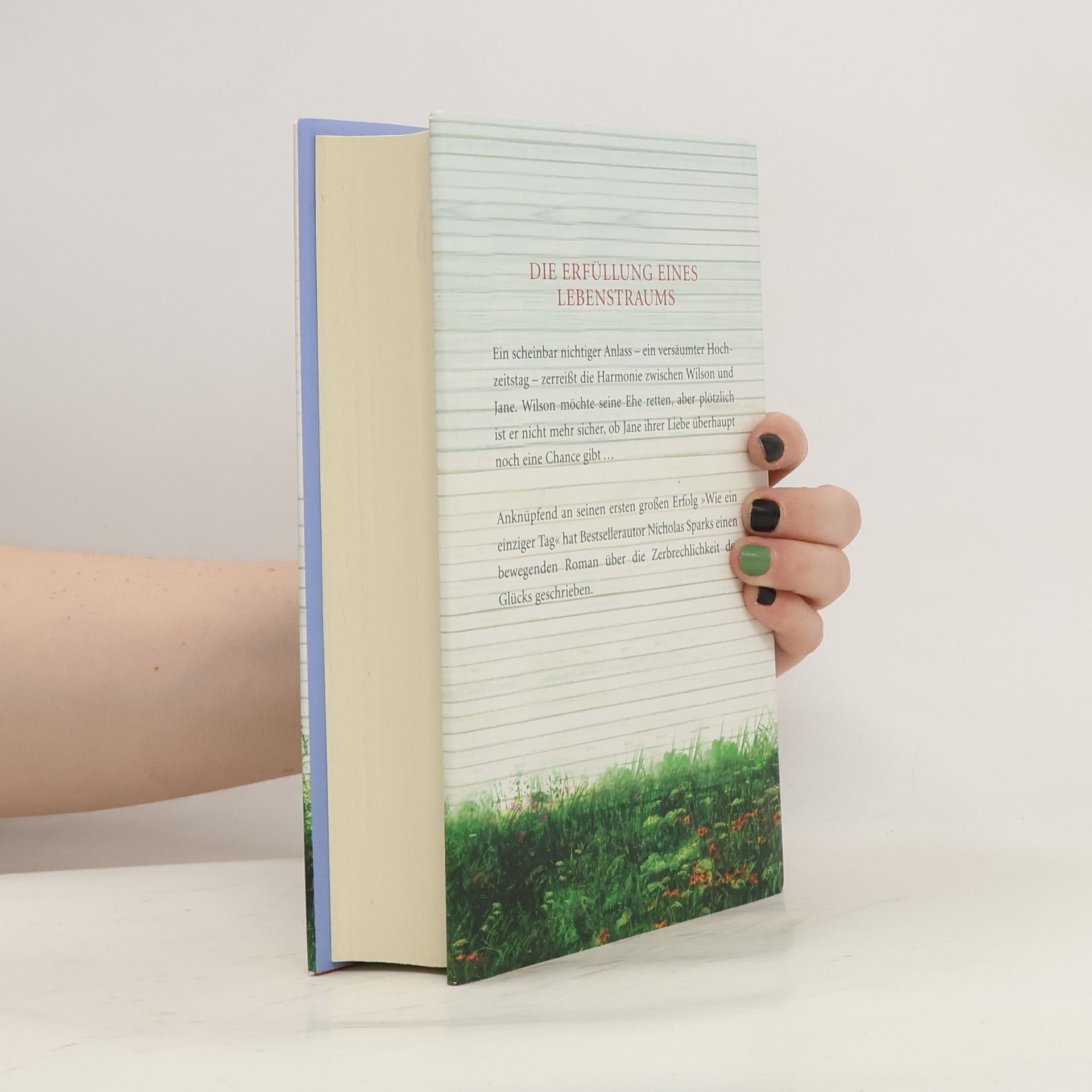 Die Erfüllung eines Lebenstraums Ein scheinbar nichtiger Anlass – ein versäumter Hochzeitstag – zerreißt die Harmonie zwischen Wilson und Jane. Wilson möchte seine Ehe retten – aber plötzlich ist er nicht mehr sicher, ob Jane ihrer Liebe überhaupt noch eine Chance geben will. Anknüpfend an seinen ersten großen Erfolg, „Wie ein einziger Tag“, hat Nicholas Sparks einen bewegenden Roman über die Zerbrechlichkeit des Glücks geschrieben. Seit knapp dreißig Jahren ist Wilson Lewis mit Jane verheiratet. Nach außen ist alles perfekt – mit drei erwachsenen Kindern und einem Haus in dem wunderschönen Städtchen New Bern haben sie sich fast jeden Traum erfüllt. Doch als Wilson ihren 29. Hochzeitstag vergisst, ist Janes Enttäuschung so maßlos, dass Wilson beginnt, an seiner Ehe zu zweifeln. Ist sie noch das, was sie einmal war? Hat er Jane zu sehr vernachlässigt, ihre Liebe für selbstverständlich genommen? Kann Jane ihn, den unromantisch veranlagten, praktisch denkenden Anwalt, überhaupt noch lieben? Wilson sucht Rat bei Janes Vater Noah, dessen einzigartige, fünfzig Jahre währende Liebe zu Allie jedem in ihrer Familie als Vorbild gilt. Bald versteht Wilson, dass er alles tun muss, um Janes Herz zurückzugewinnen. Er wird erneut um sie werben. und sie mit der Erfüllung ihres Lebenstraums überraschen.