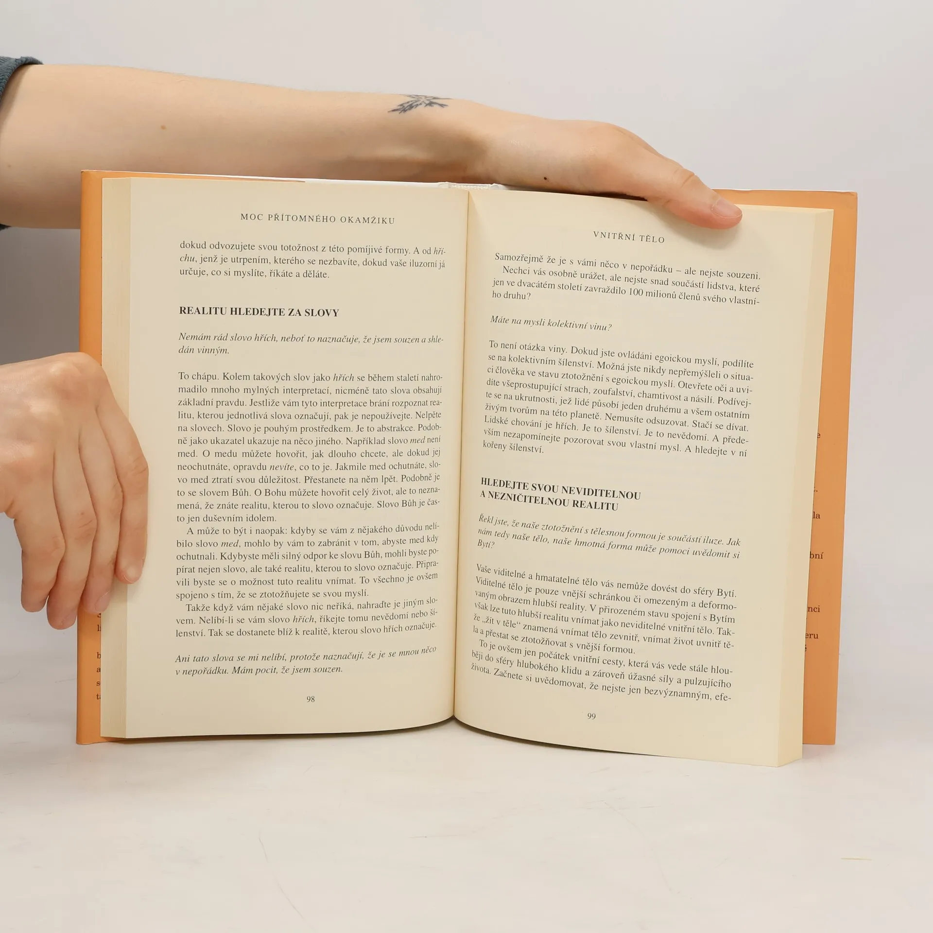 Při čtení této knihy mnoho z nás učiní nové objevy: nejsme svou myslí; můžeme se zbavit duševní bolesti; najdeme, jakmile se vzdáme přítomnému okamžiku. Dovíme se také, že jedním z klíčů k dosažení vnitřního klidu je naše tělo, stejně jako ticho a prostor kolem nás. To jsou brány, jimiž můžeme vstoupit do přítomnosti, kde neexistují žádné problémy. V přítomném okamžiku najdeme své skutečné já a hlubokou vnitřní radost. Pouze v přítomném okamžiku si uvědomíme, že už jsme úplní a dokonalí. Mnoho z nás zjistí, že naší největší překážkou na cestě k tomuto poznání jsou naše partnerské vztahy. Vstupujeme do ,,nového teritoria" a nic není takové, jak se nám to dosud jevilo. Pochopíme, že naše partnerské vztahy mohou být další branou k duchovnímu osvícení, pokud jich budeme užívat moudře, to jest k tomu, abychom se stali víc milujícími. Výsledek? Skutečné spojení mezi naším já a druhými lidmi. Naučíme-li se žít v přítomném okamžiku, budeme-li vnímat realitu ,,neviditelného Bytí" a svého ,,vnitřního těla", otevřeme se transformujícímu poznání, jež nám poskytuje tato kniha.