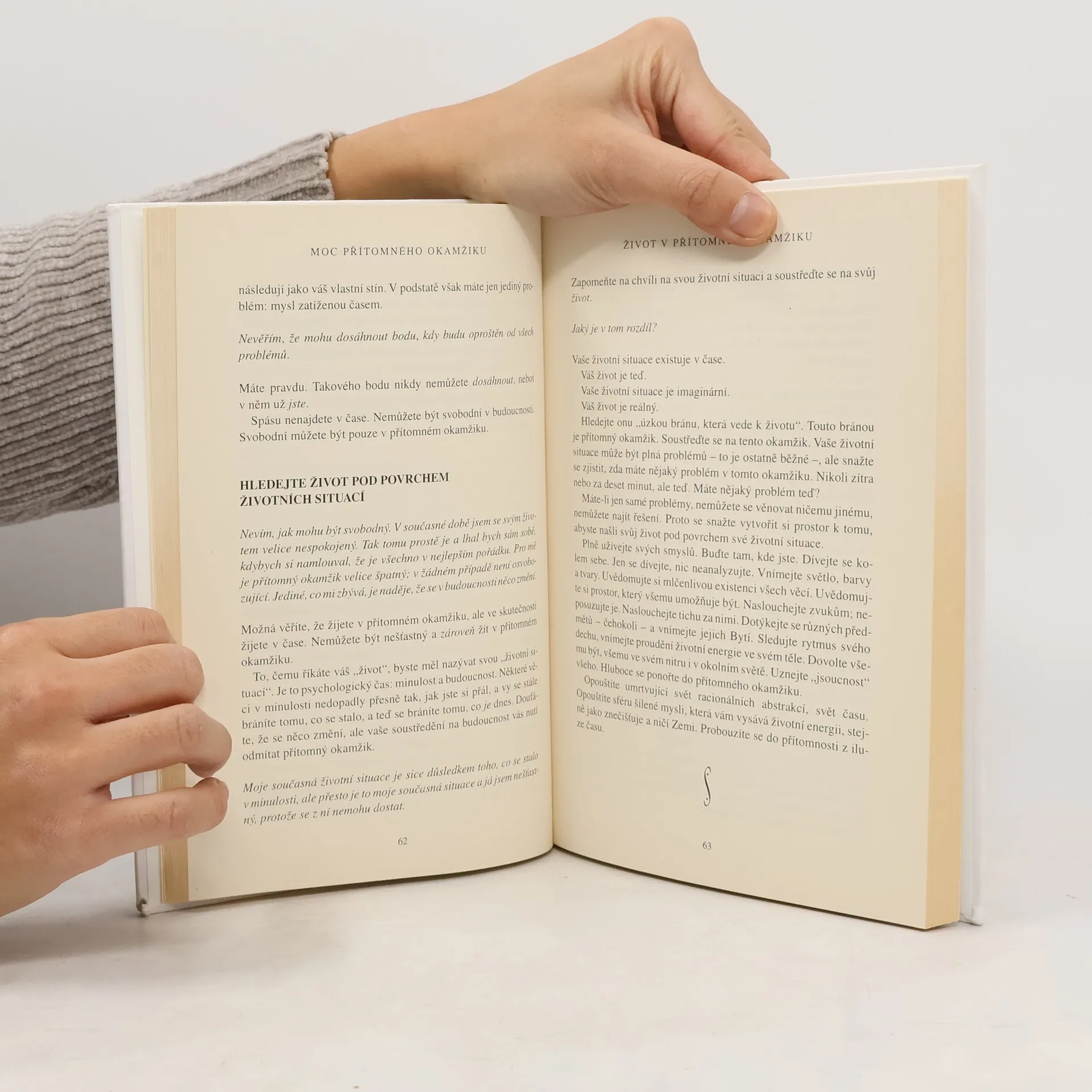 Při čtení této knihy mnoho z nás učiní nové objevy: nejsme svou myslí; můžeme se zbavit duševní bolesti; najdeme, jakmile se vzdáme přítomnému okamžiku. Dovíme se také, že jedním z klíčů k dosažení vnitřního klidu je naše tělo, stejně jako ticho a prostor kolem nás. To jsou brány, jimiž můžeme vstoupit do přítomnosti, kde neexistují žádné problémy. V přítomném okamžiku najdeme své skutečné já a hlubokou vnitřní radost. Pouze v přítomném okamžiku si uvědomíme, že už jsme úplní a dokonalí. Mnoho z nás zjistí, že naší největší překážkou na cestě k tomuto poznání jsou naše partnerské vztahy. Vstupujeme do ,,nového teritoria" a nic není takové, jak se nám to dosud jevilo. Pochopíme, že naše partnerské vztahy mohou být další branou k duchovnímu osvícení, pokud jich budeme užívat moudře, to jest k tomu, abychom se stali víc milujícími. Výsledek? Skutečné spojení mezi naším já a druhými lidmi. Naučíme-li se žít v přítomném okamžiku, budeme-li vnímat realitu ,,neviditelného Bytí" a svého ,,vnitřního těla", otevřeme se transformujícímu poznání, jež nám poskytuje tato kniha.