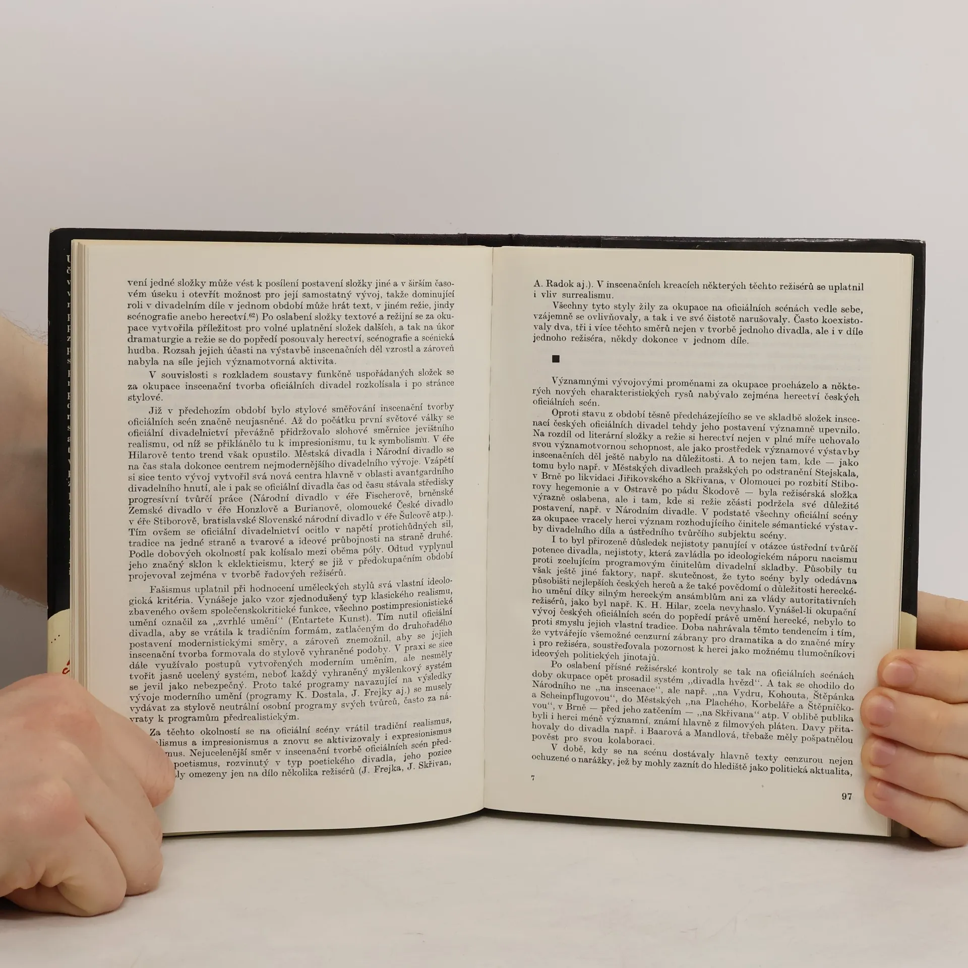 Nástup nových vývojových tendencí v čes. divadelnictví v letech 1939-1945. Osudy českého divadla v době fašistické okupace a druhé světové války. Ucelený panoramatický obraz vývoje divadla, který se nevyhýbá vylíčení slepých uliček ani klíčových vývojových jevů. Navazuje na akademické Dějiny českého divadla.