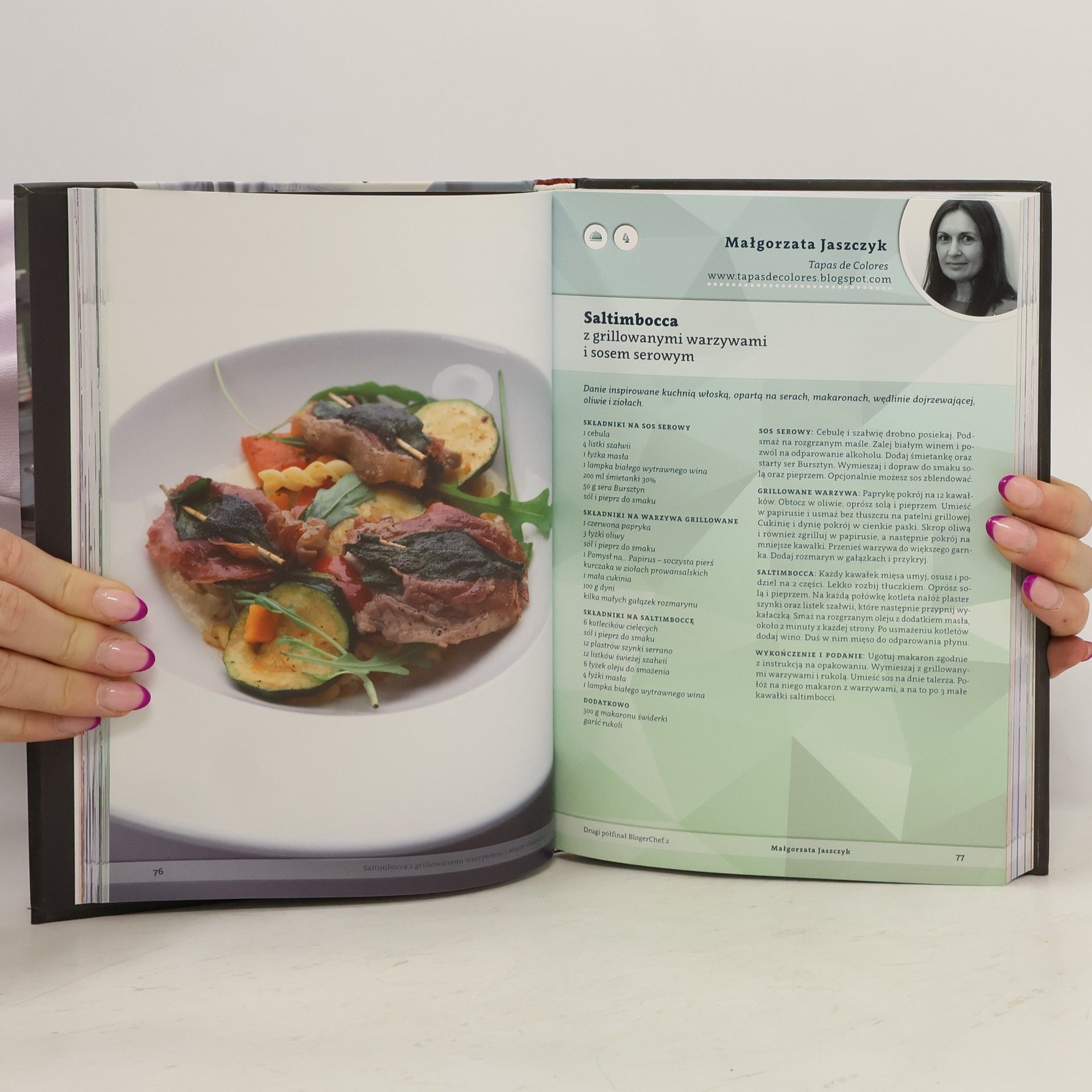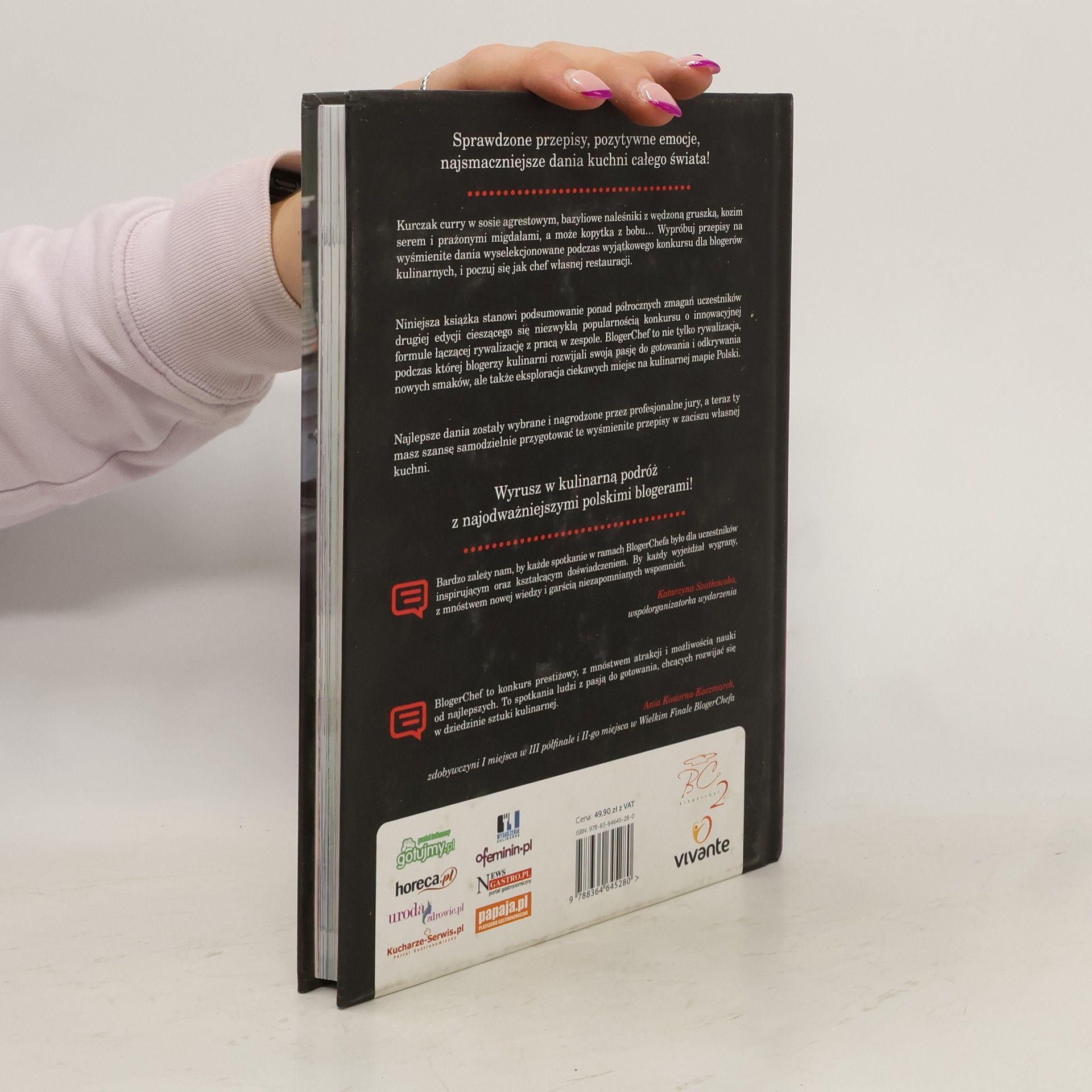 Oto książka, kt�ra stanowi podsumowanie ponad p�łrocznych zmagań uczestnik�w drugiej edycji cieszącego się niezwykłą popularnością konkursu o innowacyjnej formule łączącej rywalizację z pracą w zespole. BlogerChef to nie tylko ponad p�łroczne zmagania, podczas kt�rych blogerzy kulinarni rozwijali swoją pasję do gotowania i odkrywania nowych smak�w, ale także eksplorowali ciekawe miejsca na kulinarnej mapie Polski. Najlepsze dania zostały wybrane i nagrodzone przez profesjonalne jury, zaś teraz ty masz szansę samodzielnie przygotować te wyśmienite receptury w zaciszu własnej kuchni. Kurczak curry w sosie agrestowym, bazyliowe naleśniki z wędzoną gruszką, kozim serem i prażonymi migdałami, a może kopytka z bobu... możesz wybierać sponad kilkudziesięciu smakowitych i sprawdzonych przepis�w. Wypr�buj przepisy na wspaniałe dania wyselekcjonowane podczas wyjątkowego konkursu dla bloger�w kulinarnych i poczuj się jak chef własnej restauracji! 'Jestem pod wielkim wrażeniem i podziwiam profesjonalizm, atmosferę, warunki... To było niezapomniane przeżycie i cieszę się, że mogłam w nim uczestniczyć. Poza tym spotkanie w jednym miejscu ludzi o podobnej pasji jest bezcenne'.