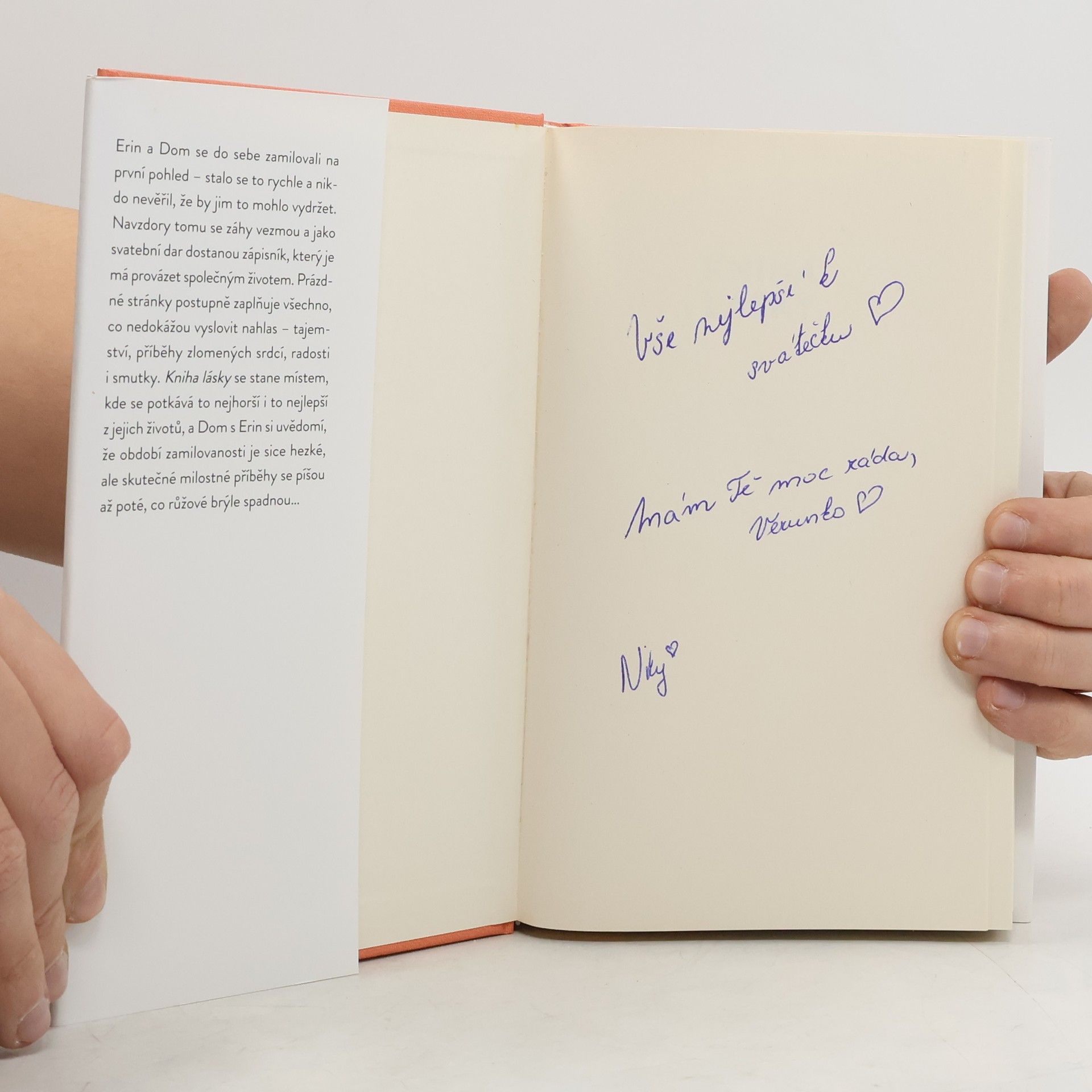 Dva lidé. Dvacet let. Jedna láska. Erin a Dom se do sebe zamilovali na první pohled – stalo se to rychle a nikdo nevěřil, že by jim to mohlo vydržet. Navzdory tomu se záhy vezmou a jako svatební dar dostanou zápisník, který je má provázet společným životem. Prázdné stránky postupně zaplňuje všechno, co nedokážou vyslovit nahlas – tajemství, příběhy zlomených srdcí, radosti i smutky. Zápisník se stane místem, kde se potkává to nejhorší i to nejlepší, co jeden v druhém vidí, a uvědomí si, že období zamilovanosti je sice krásné, ale že skutečné milostné příběhy se píšou až poté, co růžové brýle spadnou…