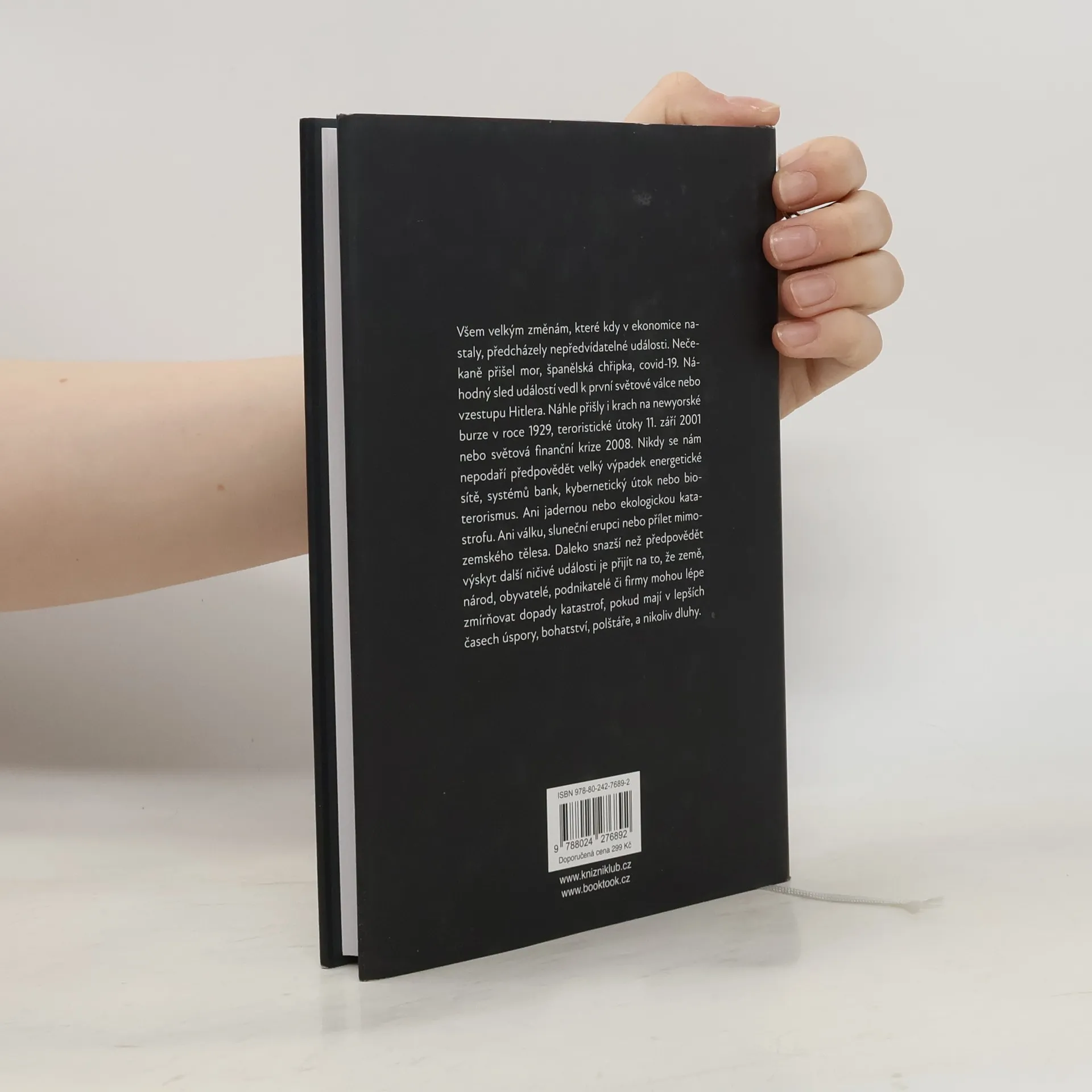 Velkým změnám, které kdy v ekonomice nastaly, předcházely nepředvídatelné události. Nečekaně přišel mor, španělská chřipka, covid-19. Náhodný sled událostí vedl k první světové válce nebo vzestupu Hitlera. Náhle přišly i krach na newyorské burze v roce 1929, teroristické útoky 11. září 2001 nebo světová finanční krize 2008. Nikdy se nám nepodaří předpovědět velký výpadek energetické sítě, systémů bank, kybernetický útok nebo bioterorismus. Ani jadernou nebo ekologickou katastrofu. Ani válku, sluneční erupci nebo přílet mimozemského tělesa. Daleko snazší než předpovědět výskyt další ničivé události je přijít na to, že země, národ, obyvatelé, podnikatelé či firmy mohou lépe zmírňovat dopady katastrof, pokud mají v lepších časech úspory, bohatství, polštáře, a nikoliv kupu dluhů.