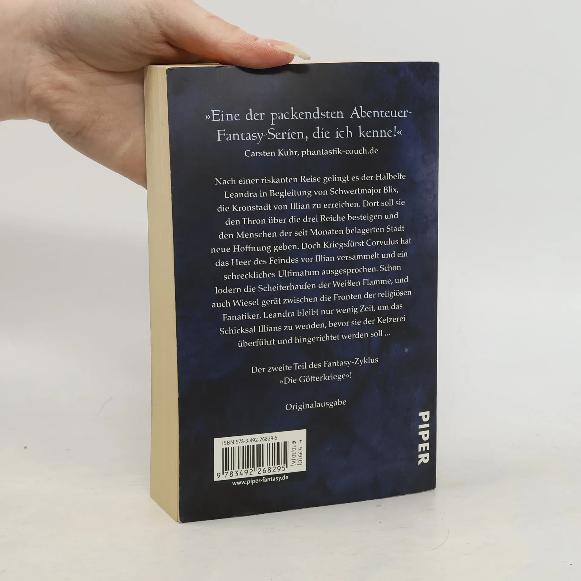 Der zweite Band der »Götterkriege« steht im Zeichen einer uralten Verschwörung: Nach einer abenteuerlichen Reise erreicht die Halbelfe Leandra in Begleitung von Schwertmajor Blix die Kronstadt von Illian. Dort soll sie den Thron über die drei Reiche besteigen und den Menschen der seit Monaten belagerten Stadt neue Hoffnung geben. Doch Kriegsfürst Corvulus hat das Heer des Feindes vor Illian versammelt und ein schreckliches Ultimatum ausgesprochen. Schon lodern in der Kronstadt die Scheiterhaufen der Weißen Flamme, und auch Schurke Wiesel gerät zwischen die Fronten der religiösen Fanatiker. Leandra bleibt nur wenig Zeit, um das Schicksal Illians zu wenden, bevor sie der Ketzerei überführt und hingerichtet werden soll …