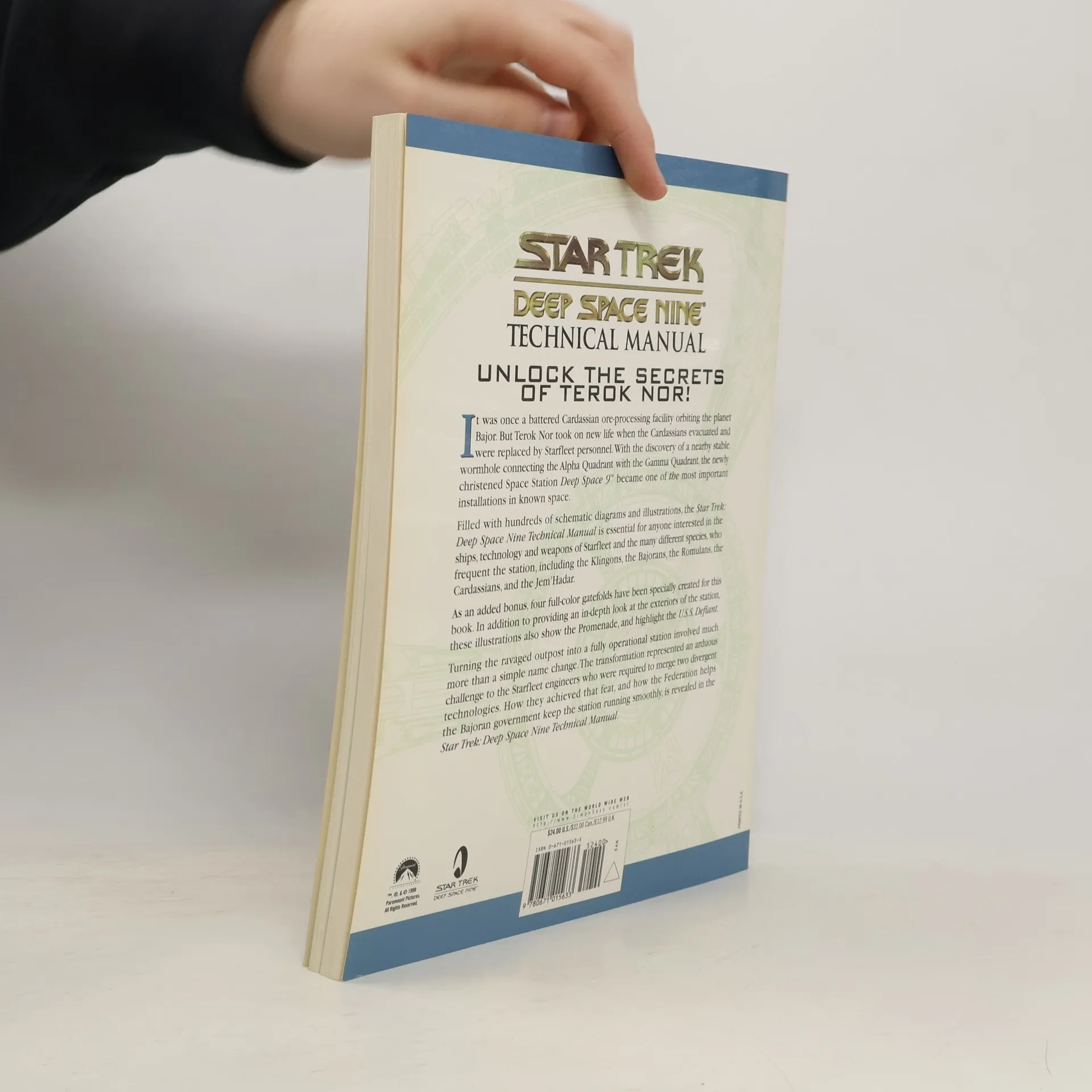 UNLOCK THE SECRETS OF TEROK NOR! It was once a battered Cardassian ore-processing facility orbiting the planet Bajor. But Terok Nor took on new life when the Cardassians evacuated and were replaced by Starfleet personnel. With the discovery of a nearby stable wormhole connecting the Alpha Quadrant with the Gamma Quadrant, the newly christened Space Station Deep Space 9 became one of the most important installations in known space. Filled with hundreds of schematic diagrams and illustrations, the "Star Trek: Deep Space Nine Technical Manual" is essential for anyone interested in the ships, technology and weapons of Starfleet and the many different species, who frequent the station, including the Klingons, the Bajorans, the Romulans, the Cardassians, and the Jem'Hadar. As an added bonus, four full-color gatefolds have been specially created for this book. In addition to providing an in-depth look at the exteriors of the station, these illustrations also show the Promenade, and highlight the U.S.S. Defiant. Turning the ravaged outpost into a fully operational station involved much more than a simple name change. The transformation represented an arduous challenge to the Starfleet engineers who were required to merge two divergent technologies. How they achieved that feat, and how the Federation helps the Bajoran government keep the station running smoothly, is revealed in the "Star Trek: Deep Space Nine Technical Manual".