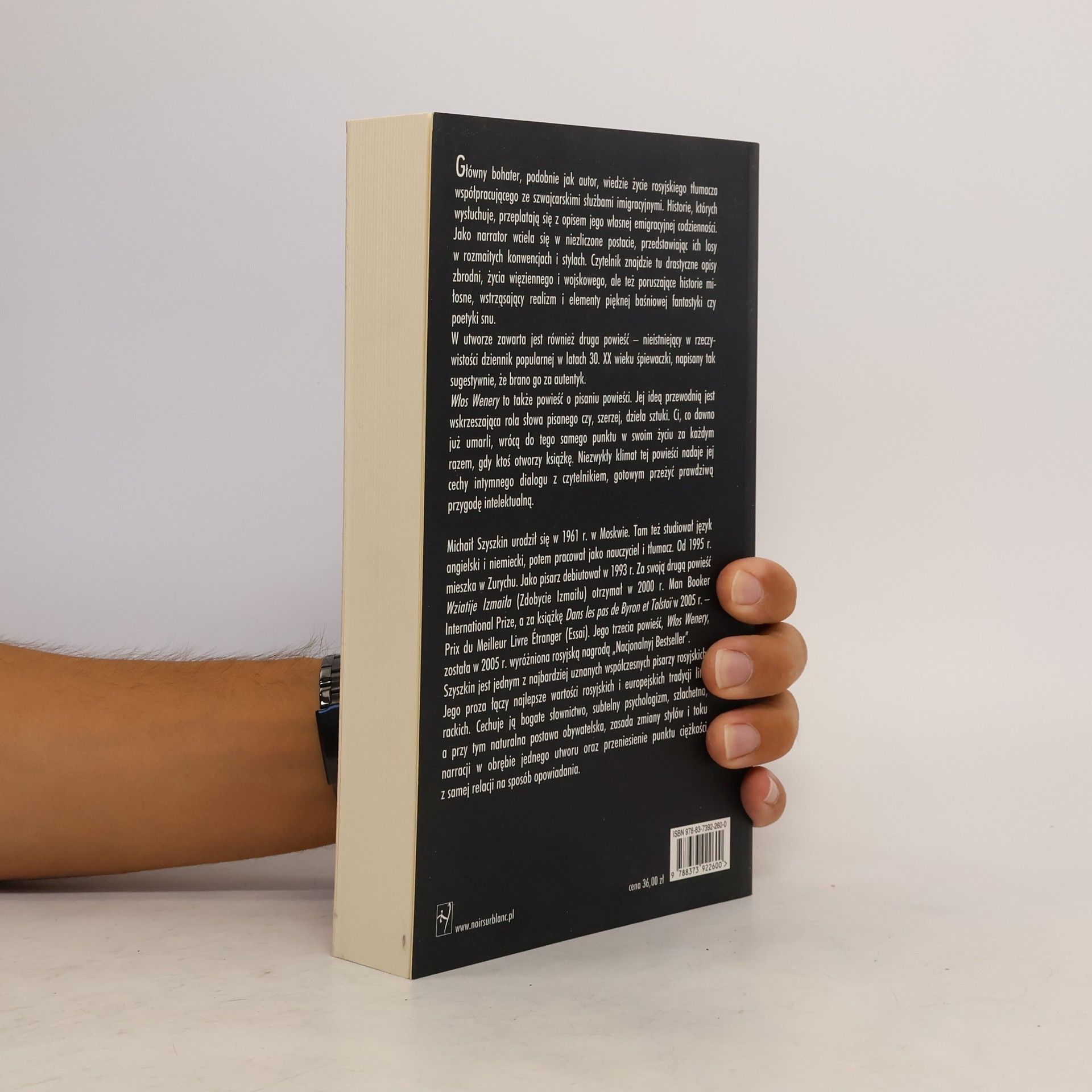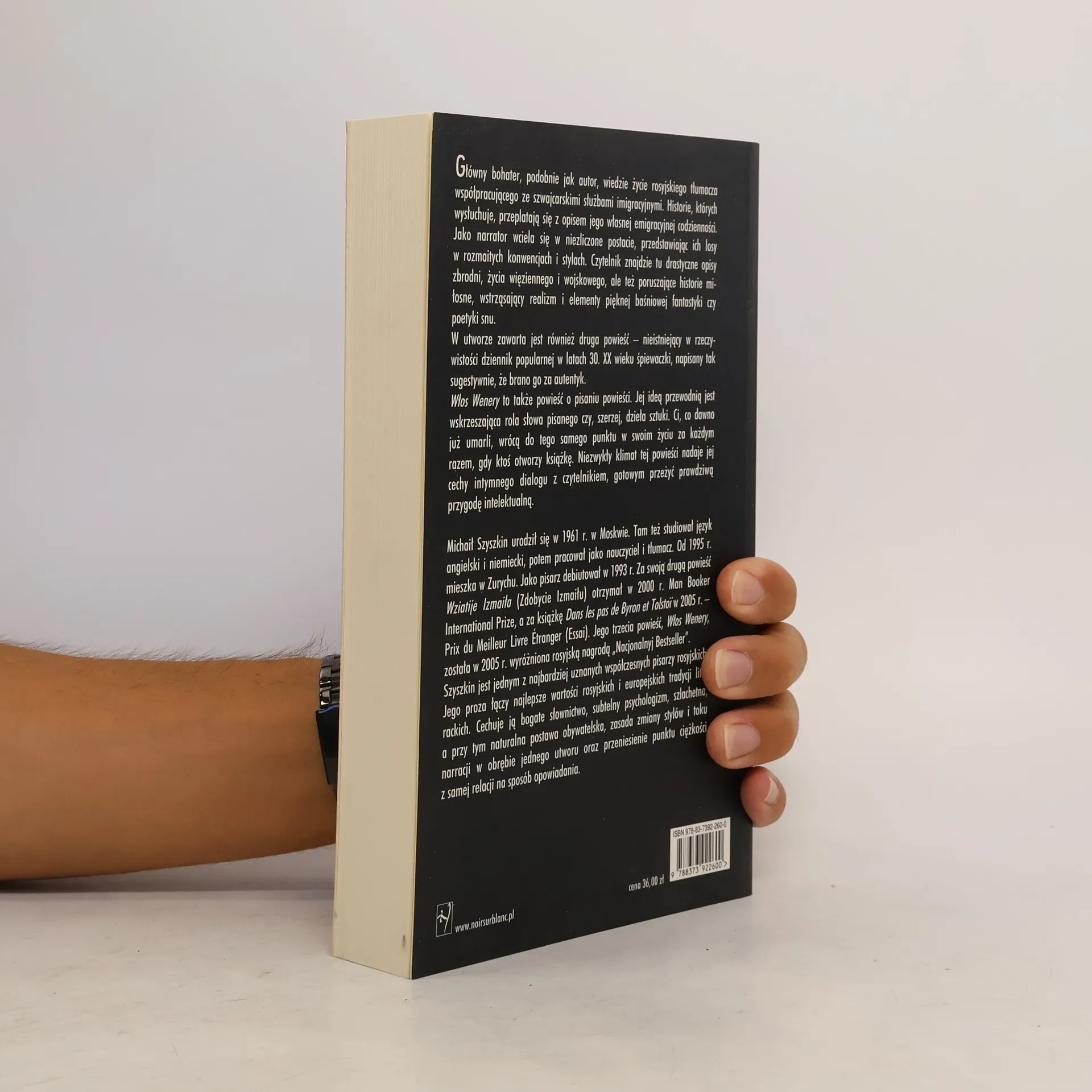 Główny bohater, podobnie jak autor, prowadzi życie rosyjskiego tłumacza współpracującego ze szwajcarskimi służbami emigracyjnymi. Historie osób ubiegających się o azyl, które wysłuchuje, tworzą wiele odrębnych opowiadań, przeplatając się z jego codziennością, treścią książki, którą czyta, oraz listami do tajemniczego Nabuchodonnozora, wzbogaconymi o osobiste wspomnienia. Jako pierwszy narrator wciela się w różne postacie, przedstawiając ich losy w różnych konwencjach i stylach. Czytelnik znajdzie tu drastyczne opisy zbrodni, życie więzienne i wojskowe, a także poruszające historie miłosne, realistyczne opisy oraz elementy baśniowej fantastyki i snu. W utworze zawarta jest druga powieść – dziennik popularnej w latach 30. XX wieku śpiewaczki, który sugestywnie oddaje psychikę dziewczęcą i kobiecą oraz życie Rostowa nad Donem w czasach carskich, a potem Moskwy i Paryża lat 20. Włos Wenery to także powieść o pisaniu powieści, ukazująca wskrzeszającą rolę słowa pisanego i dzieła sztuki. Michaił Szyszkin, ur. w 1961 roku, ukończył studia anglistyczne i germanistyczne w Moskwie, był dziennikarzem i nauczycielem. Debiutował w 1993 roku, a jego druga powieść zdobyła rosyjską Nagrodę Bookera w 2000 roku. Trzecia powieść, Włos Wenery, została wyróżniona rosyjską nagrodą „Bolszaja Kniga” w 2006 roku.