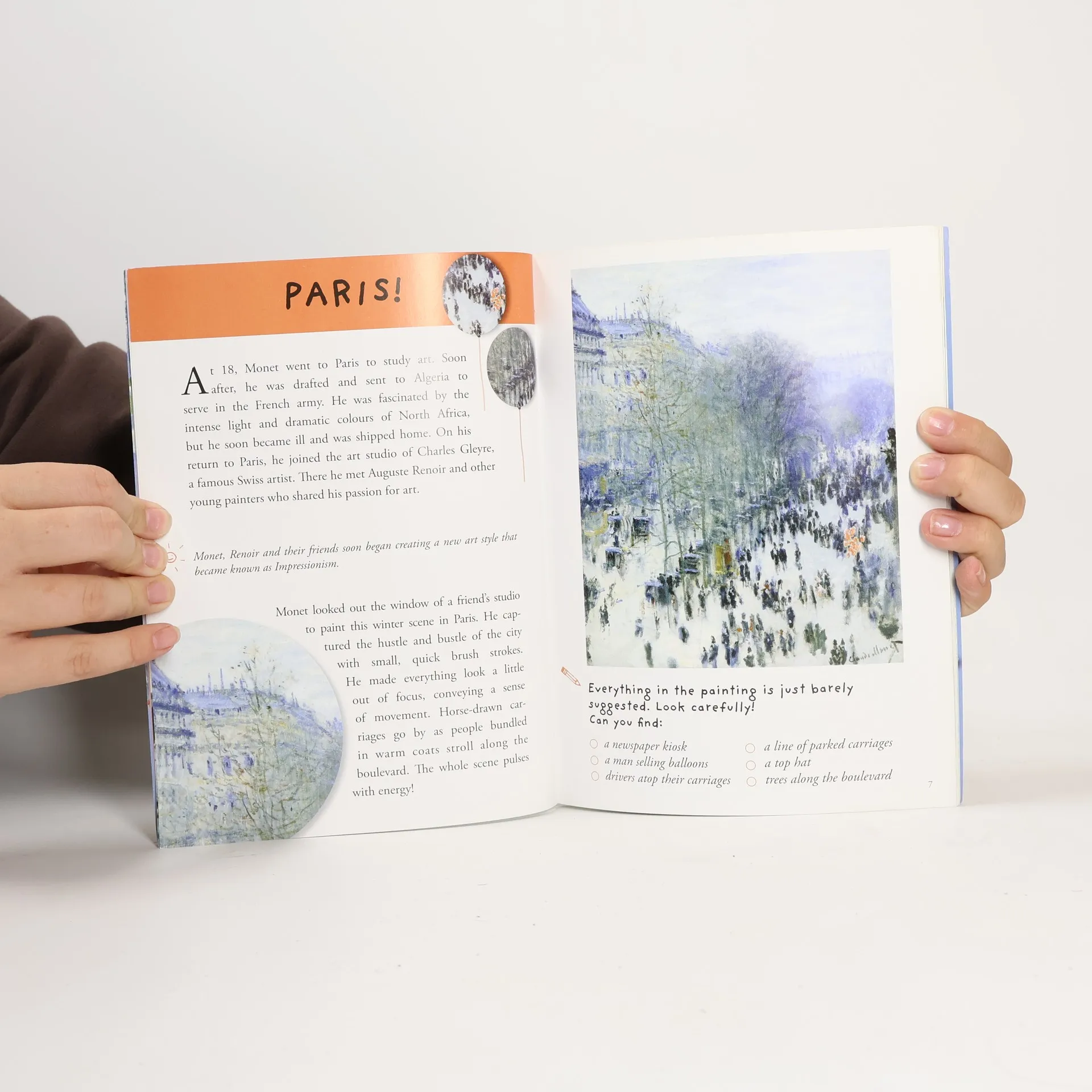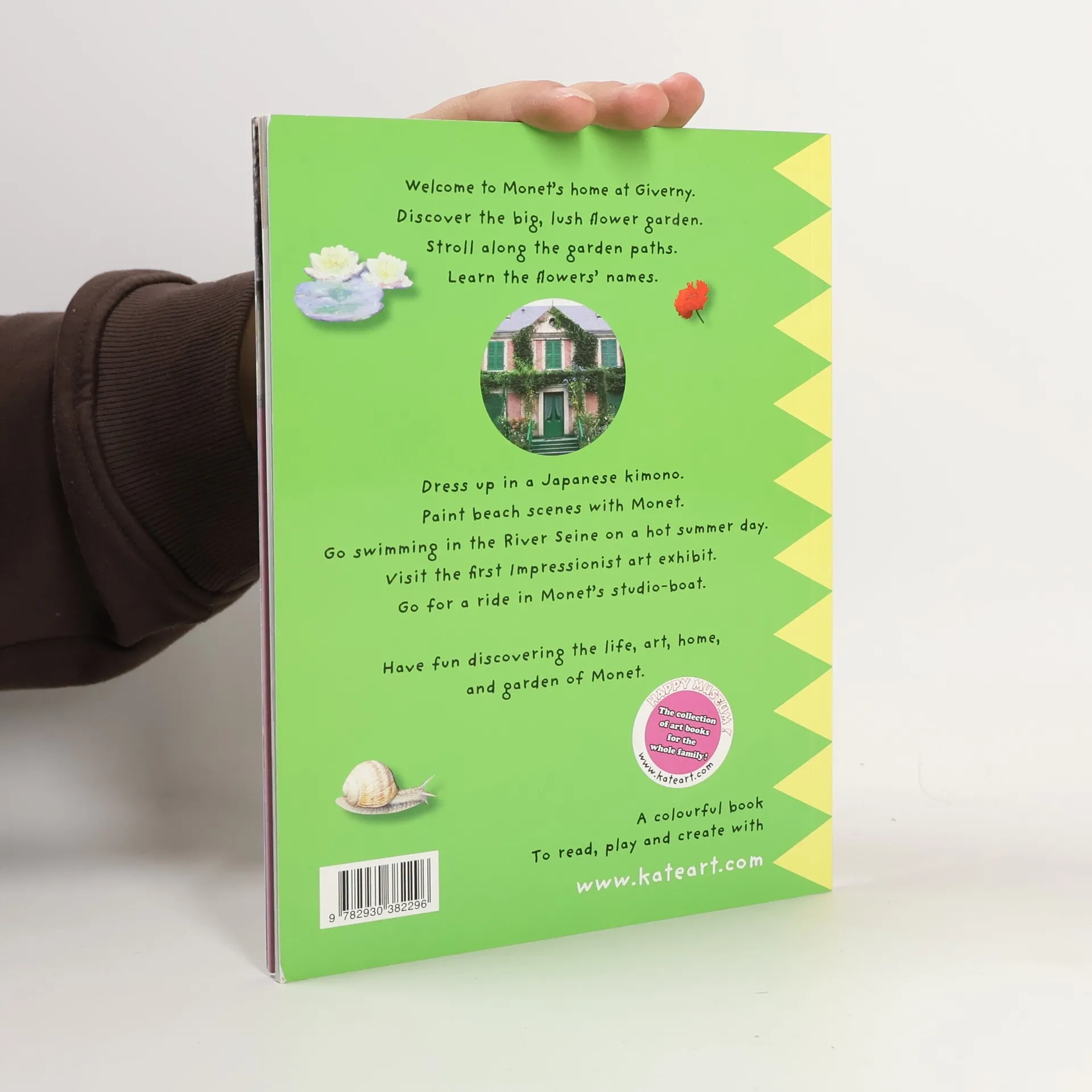 Welcome to Monets home at Giverny. Discover the big, lush flower garden. Stroll along the garden paths. Learn the flowers names. Dress up in a Japanese kimono. Paint beach scenes with Monet. Go swimming in the Seine River on a hot summer day. Visit the first Impressionist art exhibit. Go for a ride in Monets studio-boat. Have fun discovering the life, art, home and garden of Monet.