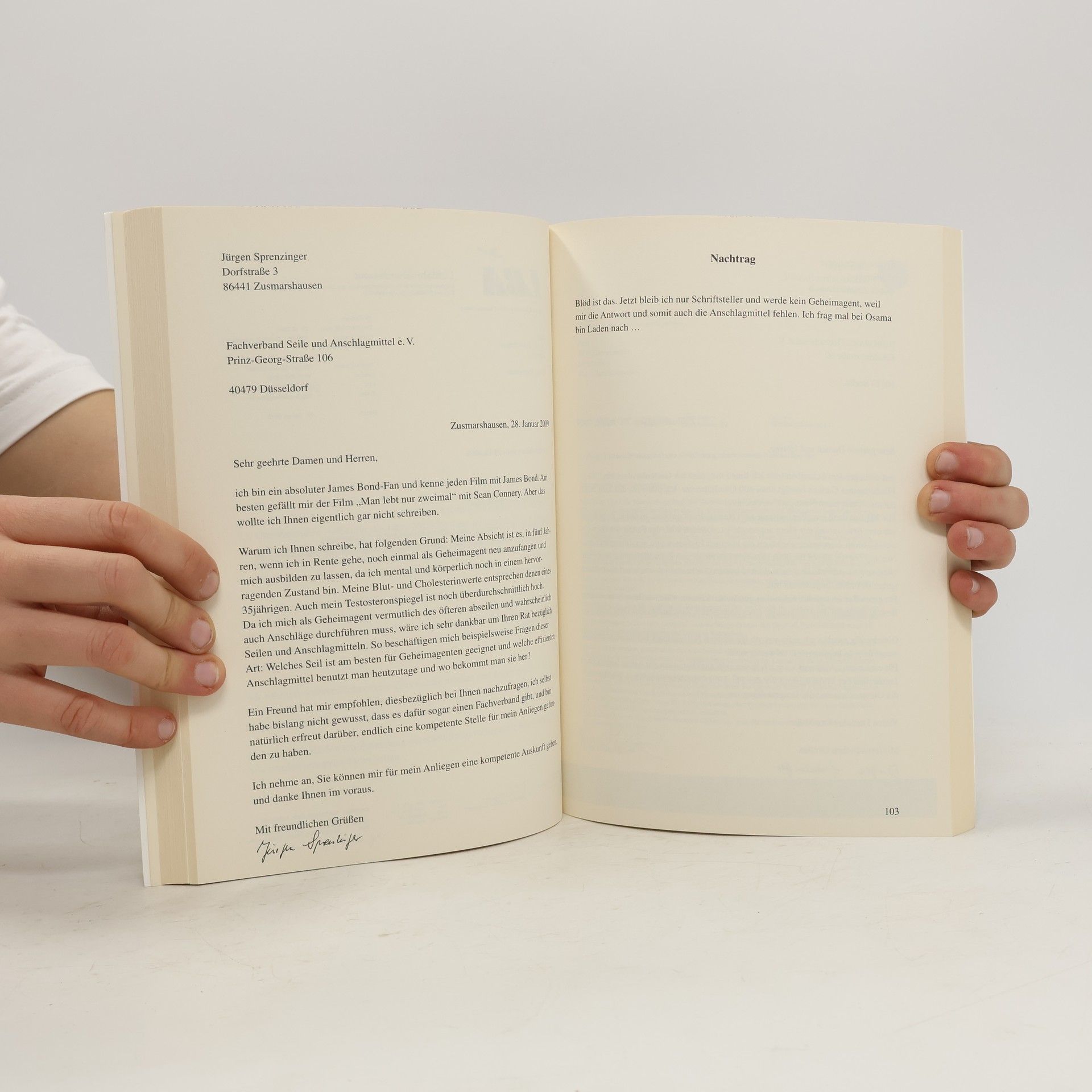 Wer würde nicht gerne dem Finanzamt mitteilen, dass es mit den Steuerzahlungen nun vorbei ist? Oder das Gesundheitsministerium in Kenntnis setzen, dass man seine eigene Krankenkasse gründen will? Sprenzinger tut es. Seine skurrilen Eingaben an Behörden und Verbände stellen die Welt auf den Kopf. Eine großartige Eulenspiegelei!