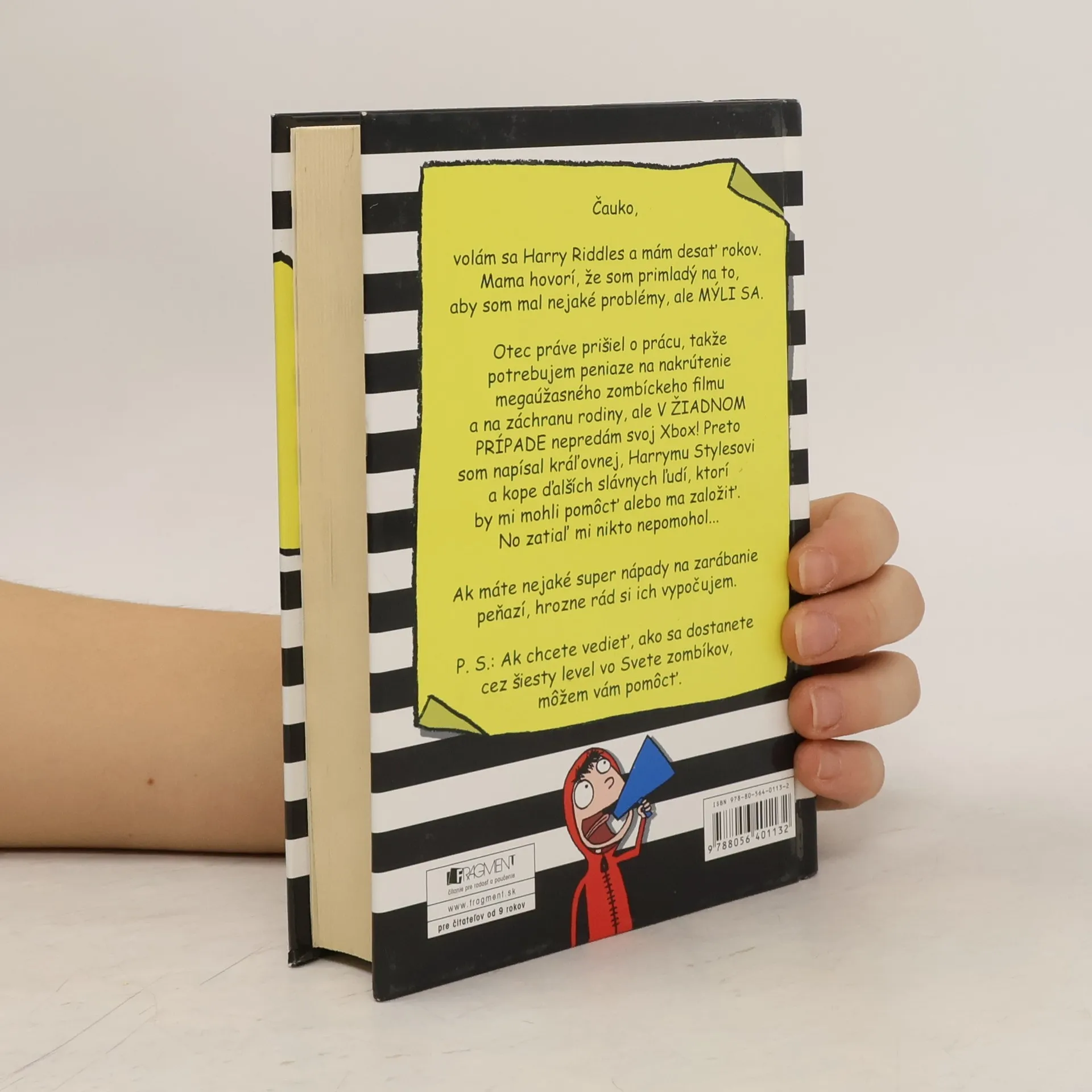 Čauko, volám sa Harry Riddles a mám desať rokov. Mama hovorí, že som primladý na to, aby som mal nejaké problémy, ale MÝLI SA! Otec práve prišiel o prácu, takže potrebujem peniaze na nakrútenie megaúžasného zombíckeho filmu a na záchranu rodiny, ale V ŽIADNOM PRÍPADE nepredám svoj Xbox! Preto som napísal kráľovnej, Harrymu Stylesovi a kope ďalších slávnych ľudí, ktorí by mi mohli pomôcť alebo ma založiť. No zatiaľ mi nikto neodpovedal... Ak máte nejaké super nápady na zarábanie peňazí, hrozne rád si ich vypočujem. P. S.: Ak chcete vedieť, ako sa dostanete cez šiesty level vo Svete zombíkov, môžem vám pomôcť.