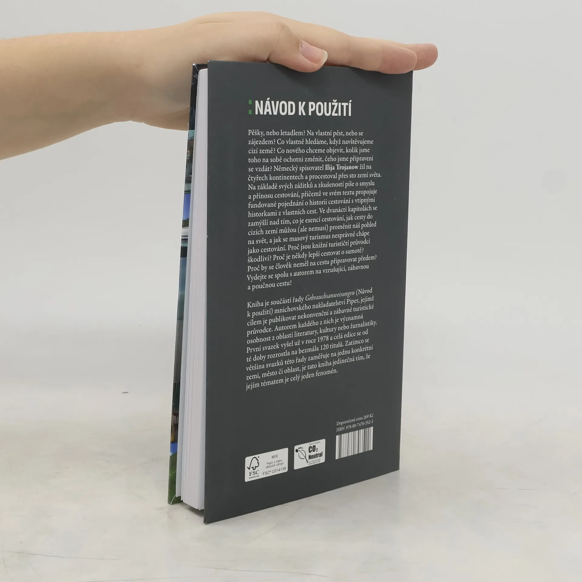 Pěšky, nebo letadlem? Na vlastní pěst, nebo se zájezdem? Co vlastně hledáme, když navštěvujeme cizí země? Co nového chceme objevit, kolik jsme toho na sobě ochotni změnit, čeho jsme připraveni se vzdát? Německý spisovatel Ilija Trojanow žil na čtyřech kontinentech a procestoval přes sto zemí světa. Na základě svých zážitků a zkušeností píše o smyslu a přínosu cestování, přičemž ve svém textu propojuje fundované pojednání o historii cestování s vtipnými historkami z vlastních cest. Ve dvanácti kapitolách se zamýšlí nad tím, co je esencí cestování, jak cesty do cizích zemí můžou (ale nemusí) proměnit náš pohled na svět, a jak se masový turismus nesprávně chápe jako cestování. Proč jsou knižní turističtí průvodci škodliví? Proč je někdy lepší cestovat o samotě? Proč by se člověk neměl na cestu připravovat předem? Vydejte se spolu s autorem na vzrušující, zábavnou a poučnou cestu! Svazek je součástí řady Gebrauchsanweisungen (Návod k použití) mnichovského nakladatelství Piper, jejímž cílem je publikovat nekonvenční a zábavné turistické průvodce. Autorem každého průvodce je významná osobnost z oblasti literatury, kultury nebo žurnalistiky. První svazek vyšel už v roce 1978 a celá edice se od té doby rozrostla na bezmála 120 titulů. Zatímco se většina svazků této řady zaměřuje na jednu konkrétní zemi, město či oblast, je tato kniha jedinečná tím, že jejím tématem je celý jeden fenomén.