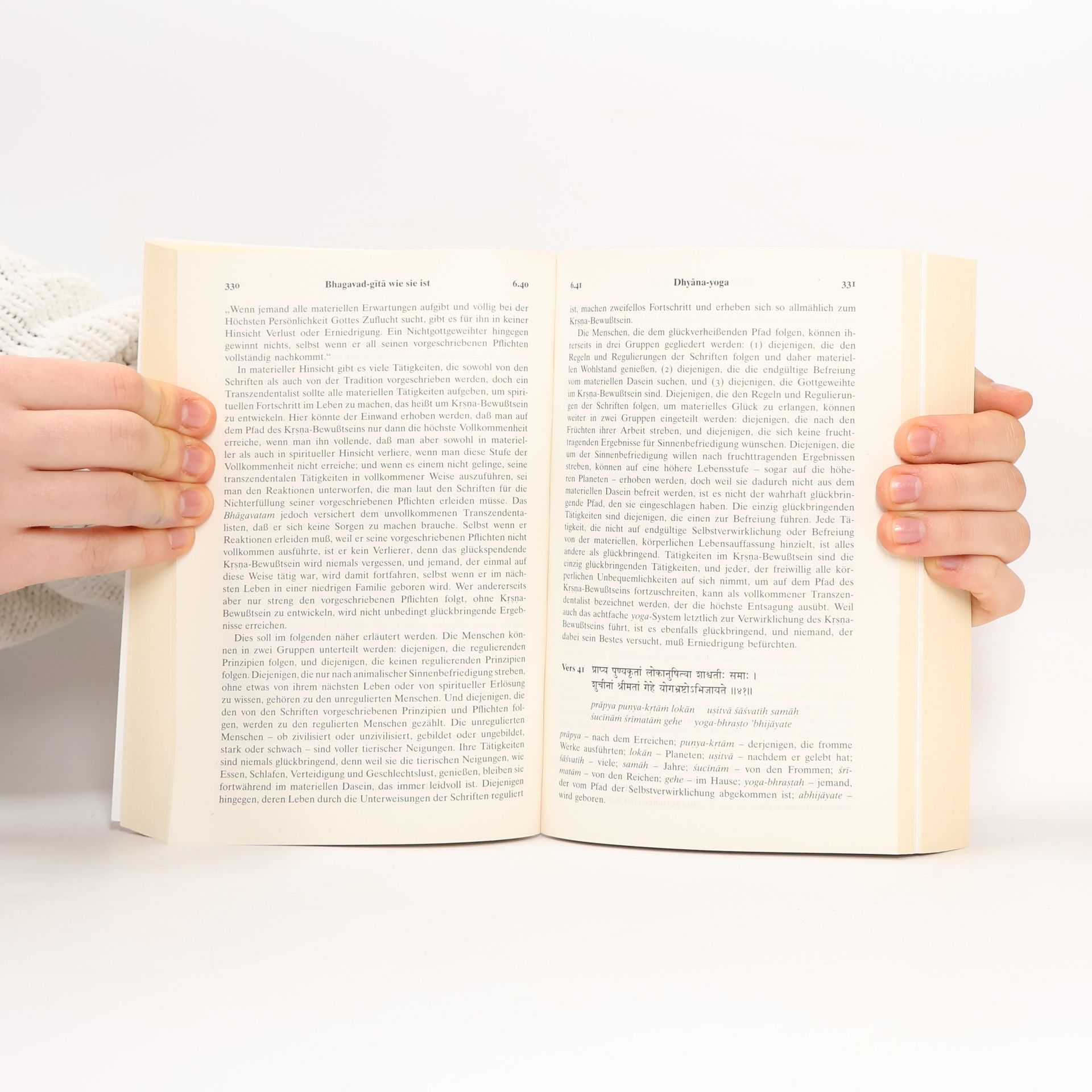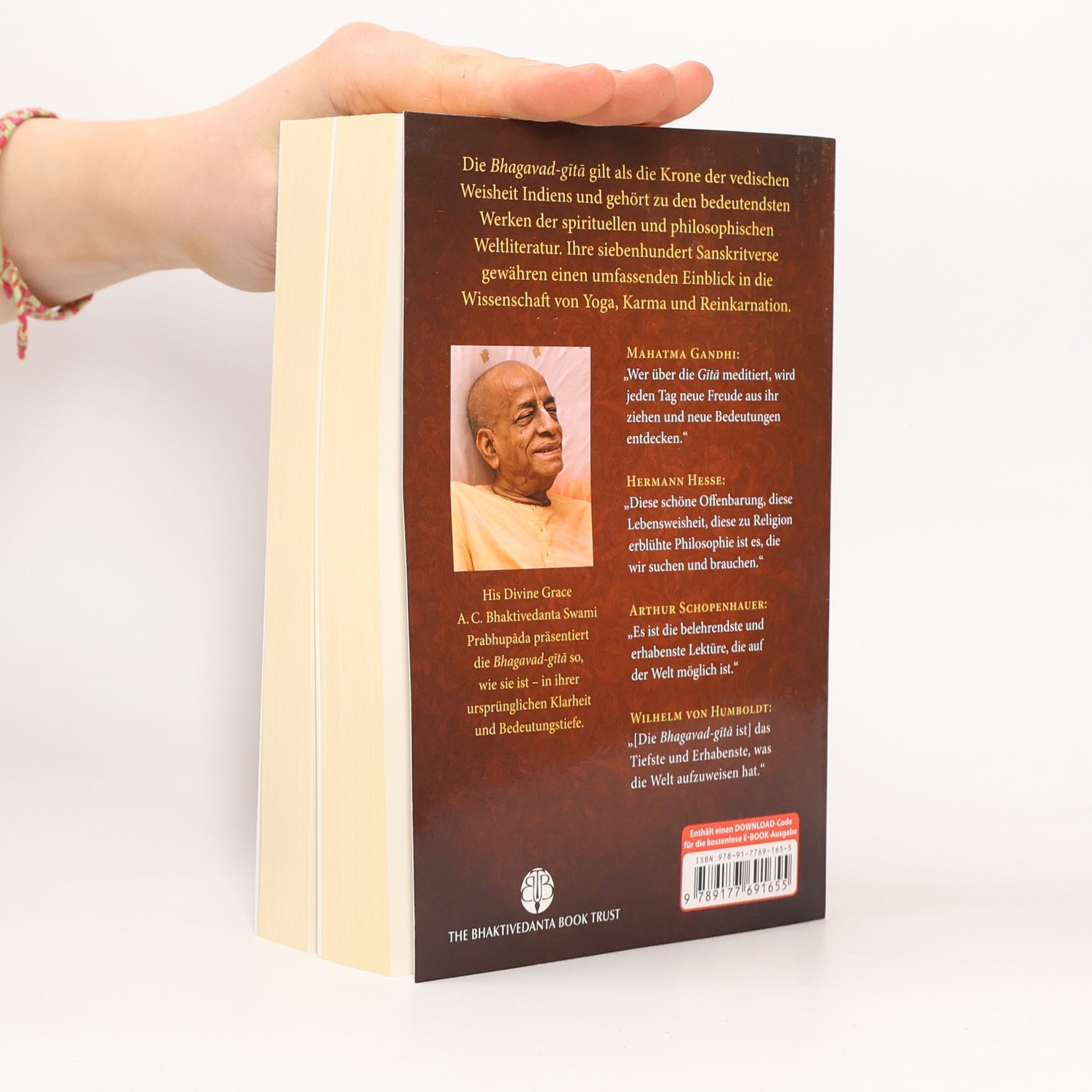 Die Bhagavad-gita (wörtlich: der «Gesang Gottes») ist der bedeutendste und bekannteste Klassiker der indischen Literatur. Sie bildet den Kern der gesamten vedischen Weisheit und enthält eine zeitlose Botschaft von universaler Gültigkeit – eine Botschaft, die alle Religionen und Philosophien der Welt miteinschliesst. Die Bhagavad-gita ist ein Dialog zwischen Krishna, dem Höchsten Herrn, und Seinem vertrauten Freund und Schüler Arjuna. In 700 Versen offenbart Krishna die göttliche Weisheit von Yoga, Karma, Reinkarnation, Meditation, Selbstverwirklichung und Gotteserkenntnis. Krishnas Worte richten sich an alle Menschen, die ihre unwandelbare spirituelle Natur, das letztliche Ziel ihres Daseins und ihre ewige Beziehung zu Gott wiedererkennen möchten. Die vorliegende Bhagavad-gita stellt für den spirituell Suchenden wie auch für den Studenten der Philosophie und Indologie ein Standardwerk dar. Sie beinhaltet: Original-Sanskritverse mit lateinischer Transliteration • vollständige deutsche Übersetzung aller 700 Verse • ausführliche Erläuterungen • umfassendes Glossar mit Erklärungen der wichtigsten Sanskritbegriffe • Anleitung zur Aussprache des Sanskrit • umfangreiches Vers- und Stichwortverzeichnis