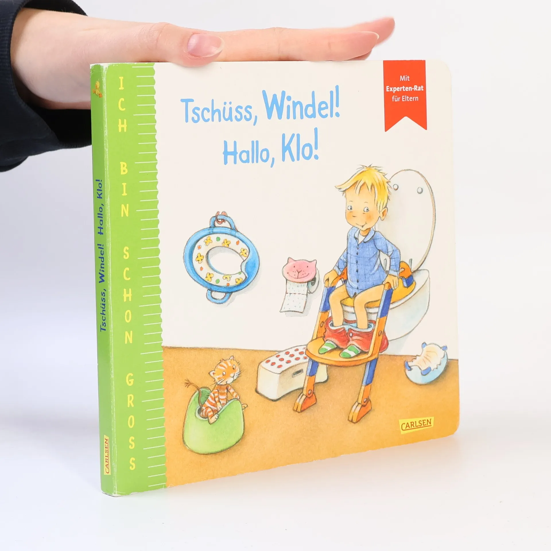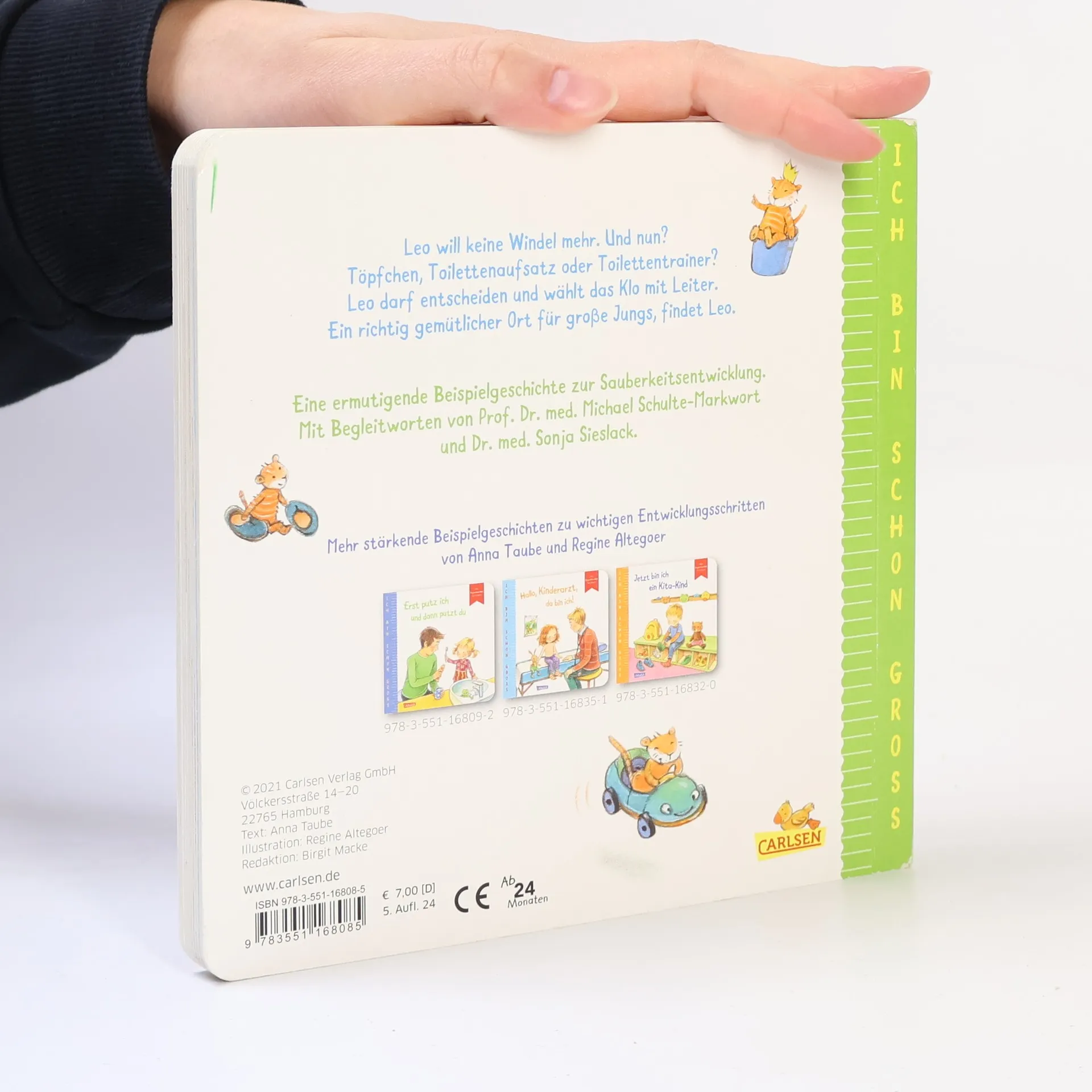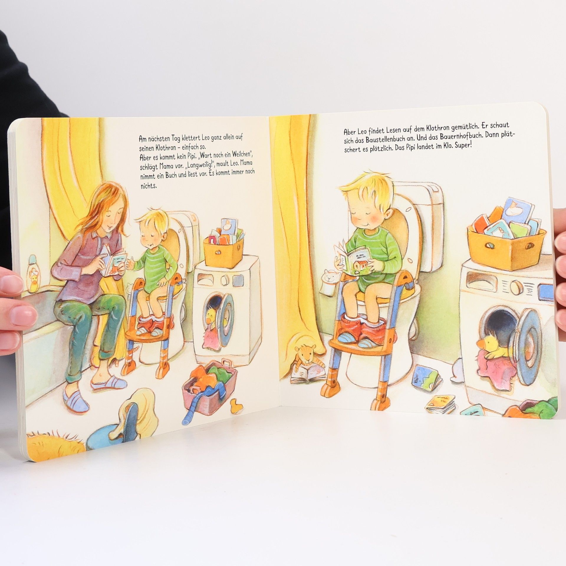 Ermutigende erste Geschichte über Trockenwerden, Windelverzicht, Toilettenentspannung Leo ist schon groß - er will keine Windel mehr. Aber fürs Mama-Papa-Klo ist er noch zu klein. Und nun? Töpfchen, Toilettenaufsatz oder Toilettentrainer? Leo darf entscheiden und wählt das Klo mit Leiter. Ein richtig gemütlicher Ort für große Jungs, findet Leo. Jetzt braucht er nur noch rechtzeitig zu merken, wann das Pipi kommt. Mit ein paar kleinen Malheuren, die nicht weiter schlimm sind, und mit etwas Erinnerungshilfe von Mama und Papa, klappt es von Tag zu Tag besser. Windeln braucht Leo jetzt nicht mehr. Und die Hosen bleiben auch fast immer trocken. Mehr Beispielgeschichten für Kinder ab 2 Jahren zu wichtigen Entwicklungsschritten in der Reihe Ich bin schon groß: Hallo, Kinderarzt, da bin ich! Jetzt bin ich ein Kita-Kind Erst putz ich und dann putzt du Mit Extra-Eltern-Tipp-Seite zum Heraustrennen, Reflektieren und Aufbewahren - verfasst von erfahrenen Expert*innen, die Kinder ganz besonders gut verstehen.