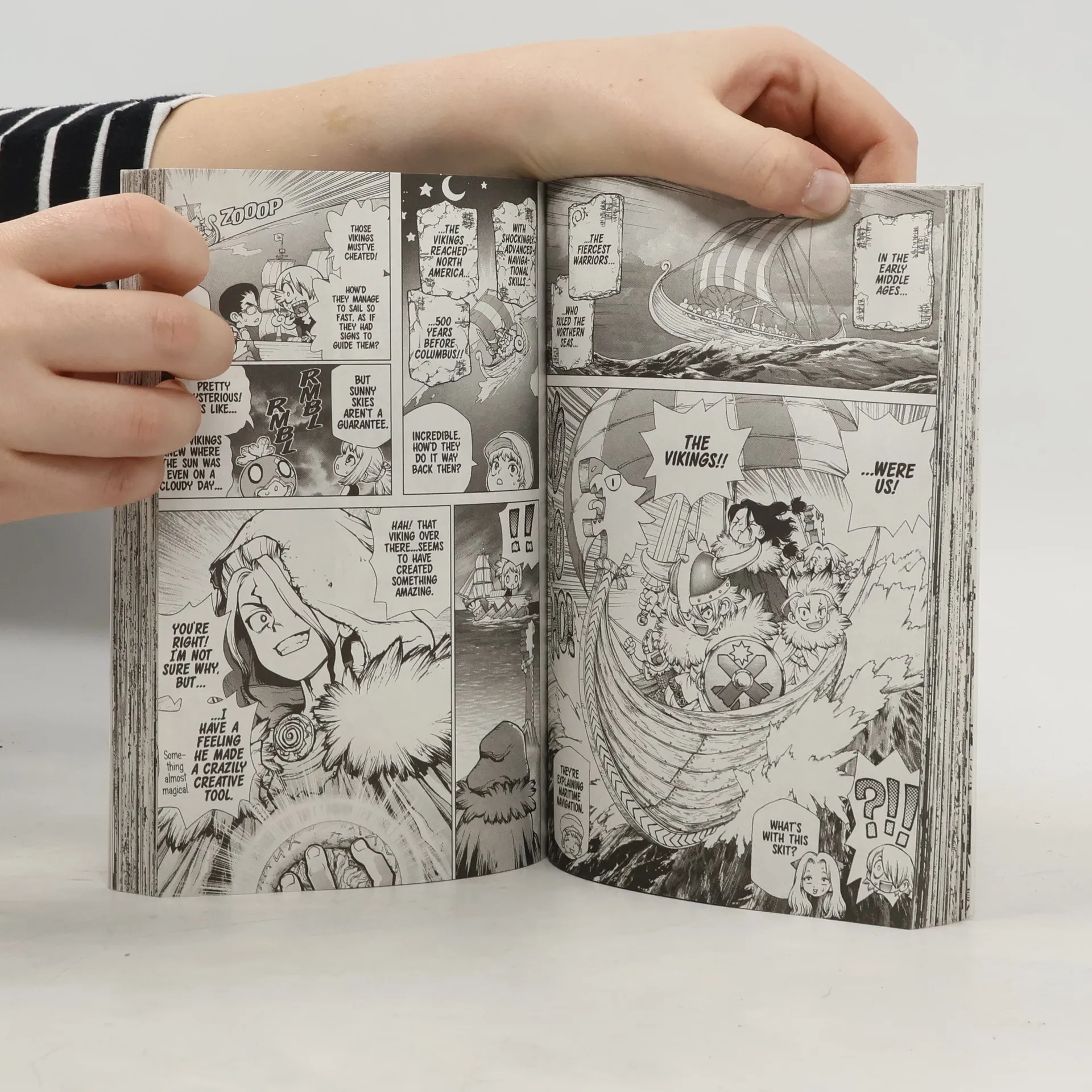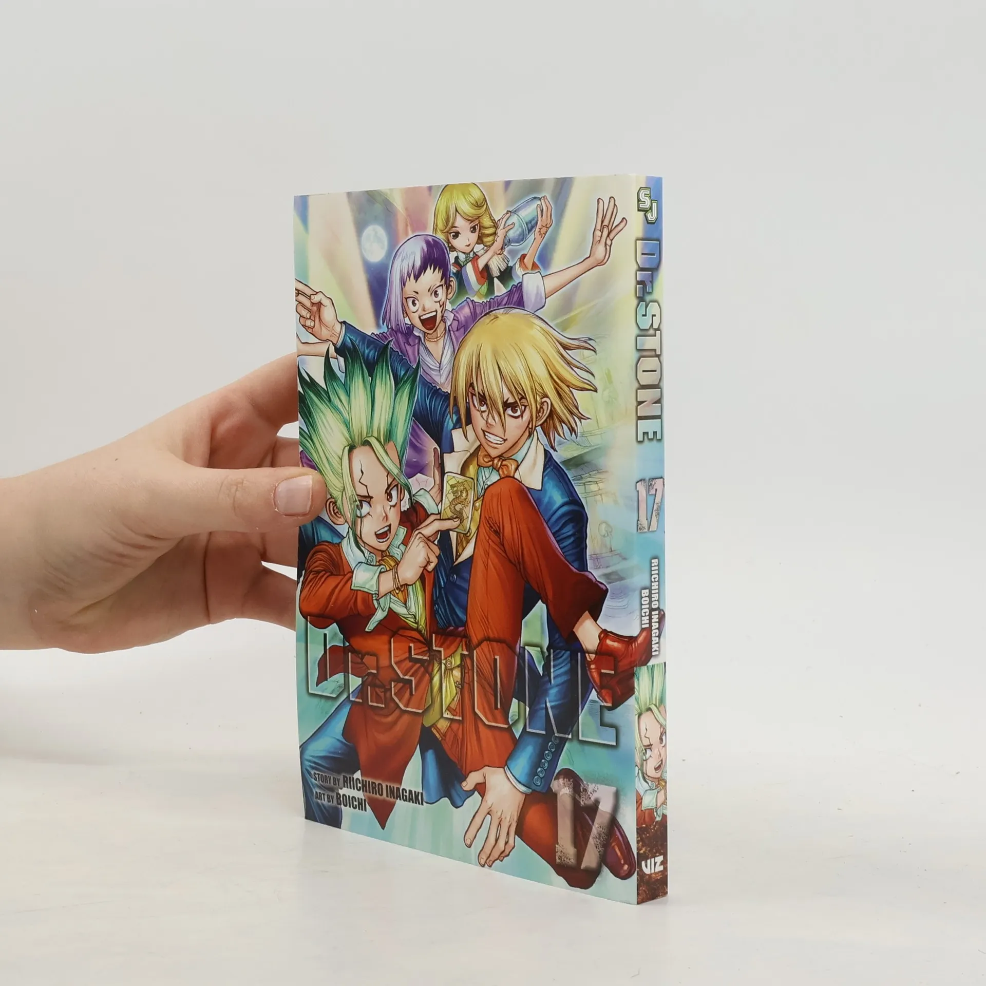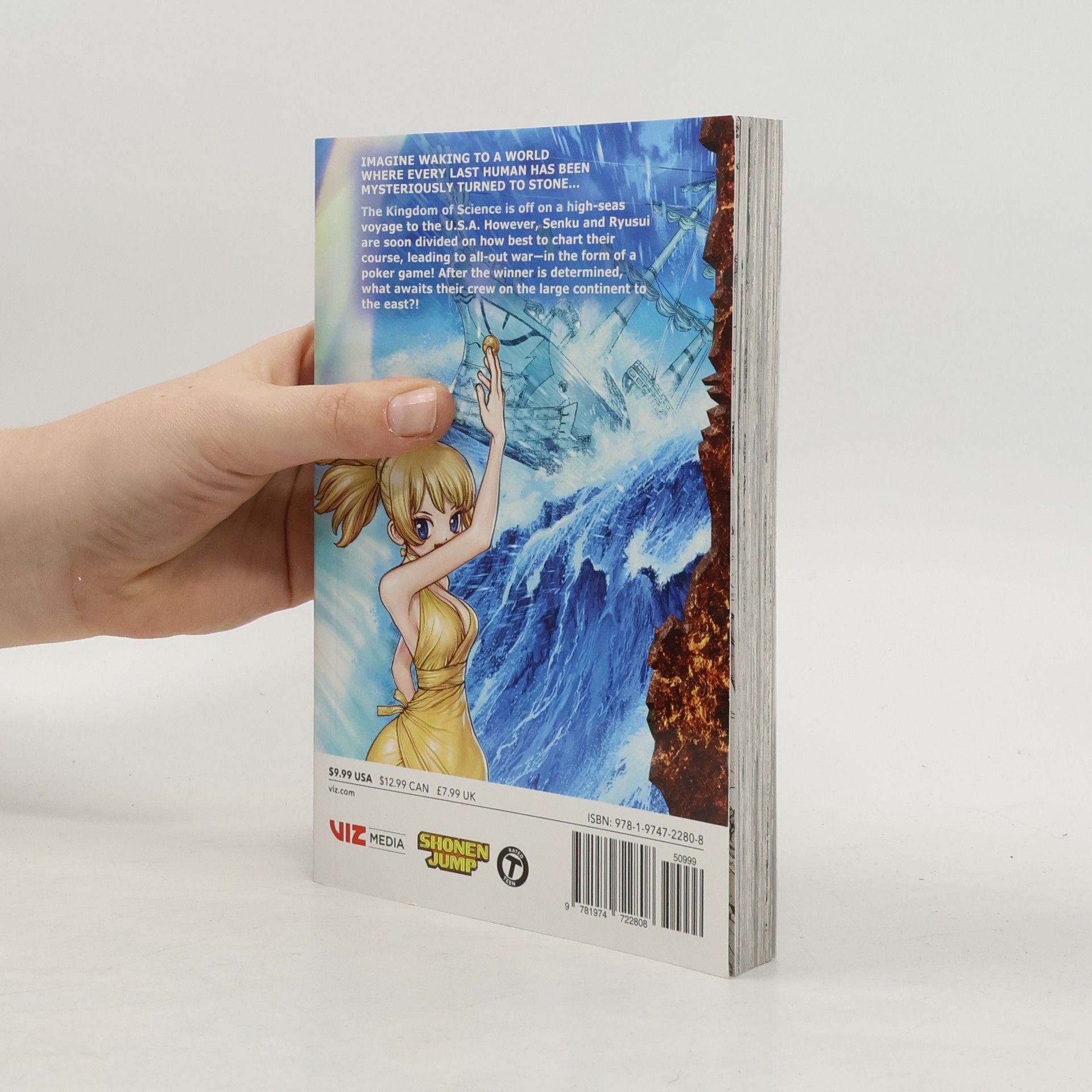 Imagine waking to a world where every last human has been mysteriously turned to stone...One fateful day, all of humanity turned to stone. Many millennia later, Taiju frees himself from the petrification and finds himself surrounded by statues. The situation looks grim-until he runs into his science-loving friend Senku! Together they plan to restart civilization with the power of science!The Kingdom of Science is off on a high-seas voyage to the U.S.A. However, Senku and Ryusui are soon divided on how best to chart their course, leading to all-out war-in the form of a poker game! After the winner is determined, what awaits their crew on the large continent to the east?!