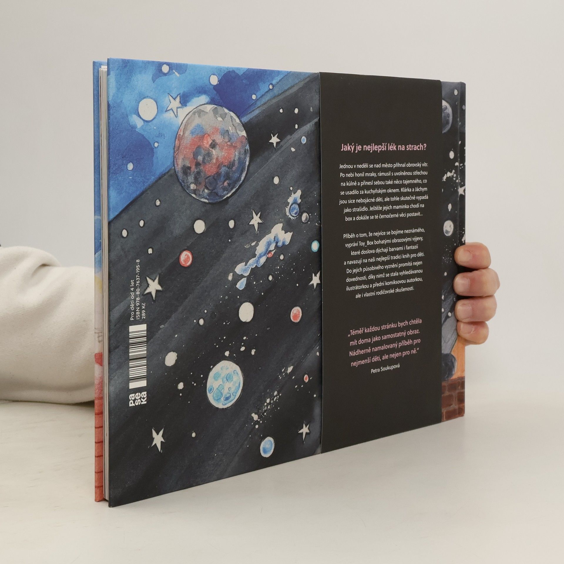 Co je nejlepší lék na strach? Jednou v neděli se nad město přihnal obrovský vítr. Po nebi honil mraky, rámusil s uvolněnou střechou na kůlně a přinesl také něco tajemného, temného, co se usadilo za kuchyňským oknem. Klárka a Jáchym jsou sice nebojácní, ale tohle skutečně vypadá jako strašidlo. Ještěže jejich maminka chodí na box a dokáže se té černočerné věci postavit… Příběh o tom, že nejvíce se bojíme neznámého, vypráví Toy_Box bohatými obrazovými výjevy, které doslova dýchají barvami i fantazií a navazují na naši nejlepší tradici knih pro děti. Do jejich působivého vyznění promítá nejen dovednosti, díky nimž se stala vyhledávanou ilustrátorkou a přední komiksovou autorkou, ale i vlastní rodičovské zkušenosti.