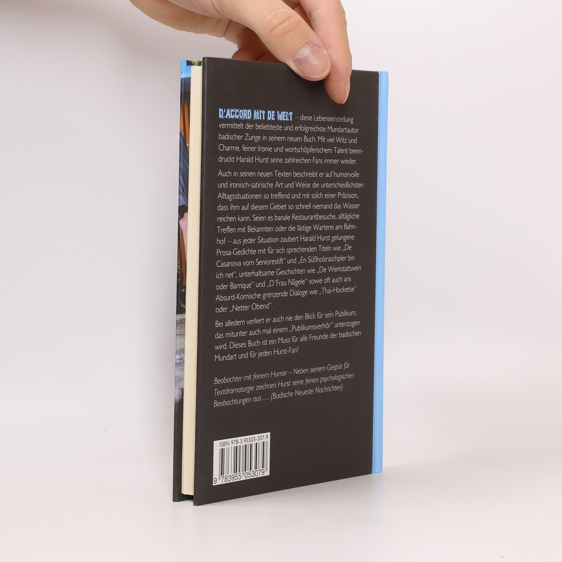 D’accord mit de Welt“– diese Lebenseinstellung vermittelt der beliebteste und erfolgreichste Mundartautor badischer Zunge in seinem neuen Buch. Mit viel Witz und Charme, feiner Ironie und wortschöpferischem Talent beeindruckt Harald Hurst seine zahlreichen Fans immer wieder. Auch in seinen neuen Texten beschreibt er auf humorvolle und ironisch-satirische Art und Weise die unterschiedlichsten Alltagssituationen so treffend und mit solch einer Präzision, dass ihm auf diesem Gebiet so schnell niemand das Wasser reichen kann. Seien es banale Restaurantbesuche, alltägliche Treffen mit Bekannten oder die lästige Warterei am Bahnhof – aus jeder Situation zaubert Harald Hurst gelungene Prosa-Gedichte mit für sich sprechenden Titeln wie „De Casanova vom Seniorestift“ und „En Süßholzraschpler bin ich net“, unterhaltsame Geschichten wie „De Werkstattwein oder Barrique“ und „D´Frau Nägele“ sowie oft auch ans Absurd-Komische grenzende Dialoge wie „Thai-Hocketse“ oder „Netter Obend“. Bei alledem verliert er auch nie den Blick für sein Publikum, das mitunter auch mal einem „Publikumsverhör“ unterzogen wird. Dieses Buch ist ein Muss für alle Freunde der badischen Mundart und für jeden Hurst-Fan!