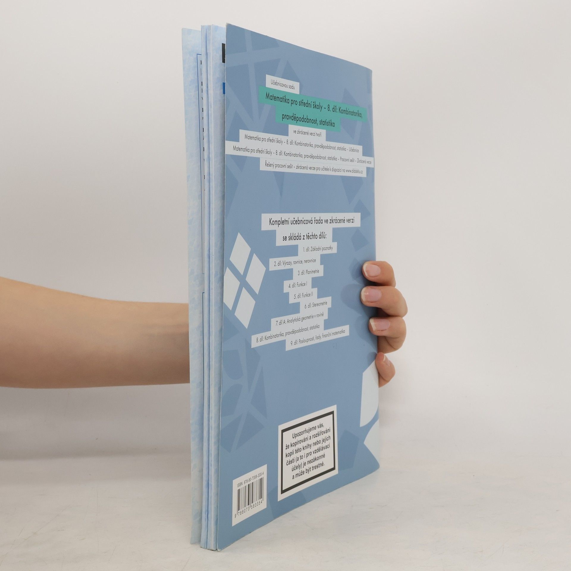 Osmý díl učebnicové řady je tvořen třemi samostatnými celky, z nichž se každý věnuje jiné oblasti. První z nich, věnovaný kombinatorice, seznamuje žáky postupně s permutacemi, variacemi, kombinacemi a řešením kombinatorických úloh i rovnic. Druhý celek je věnován úvodu do teorie pravděpodobnosti, žáci se seznámí s definicí pravděpodobnosti a jejím použitím. Poslední celek se zabývá základními pojmy popisné statistiky a jejich využitím v běžném životě.