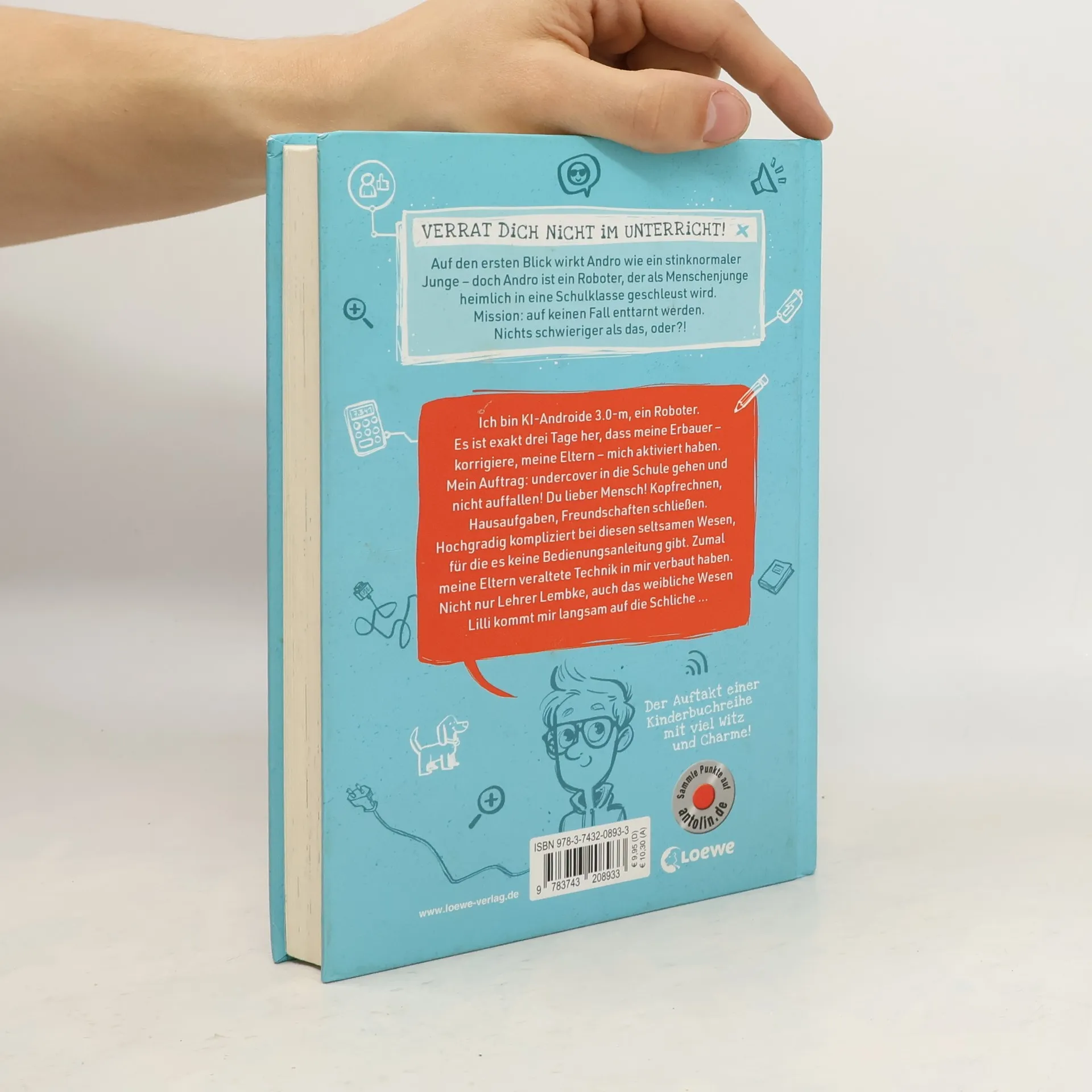 Ein Roboter in geheimer Mission Auf den ersten Blick wirkt Andro wie ein ganz normaler Junge – doch Andro ist ein Roboter, der als Menschenjunge heimlich in eine Schulklasse geschleust wird. Mission: Die Menschen erforschen und auf keinen Fall enttarnt werden.Ich bin KI-Androide 3.0-m. Es ist exakt drei Tage her, dass meine Erbauer – korrigiere, meine Eltern – mich aktiviert haben. Mein Auftrag: Undercover in die Schule gehen und nicht auffallen! Kopfrechnen, Hausaufgaben, Freundschaften schließen. Hochgradig kompliziert bei diesen seltsamen Wesen, für die es keine Bedienungsanleitung gibt. Zumal meine Eltern veraltete Technik in mir verbaut haben. Nicht nur Lehrer Lembke, auch das weibliche Wesen Lilli kommt mir langsam auf die Schliche…