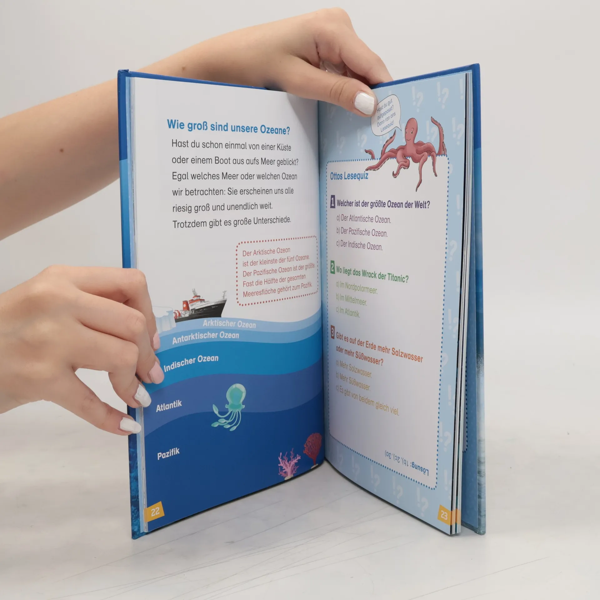 Ozeane und Meere bedecken mehr als 70 Prozent der Erdoberfläche - und sie bergen jede Menge Geheimnisse. Otto, der schlaue Oktopus, erforscht gemeinsam mit den Leseanfängern im Buch aus der Reihe WAS IST WAS Erstes Lesen diesen aufregenden Lebensraum. Sie lernen die drei großen Ozeane kennen, erfahren, wie tief ein Mensch tauchen kann, was ein U-Boot ausmacht und dass Korallenriffe die größten Bauwerke der Welt sind. Sogar ein Abstecher an die Pole steht auf dem Plan! Lustige Lesequizze am Ende jedes Kapitels und am Ende des Buchs fragen das Gelernte auf unterhaltsame Art ab und vertiefen das neuerworbene Wissen.