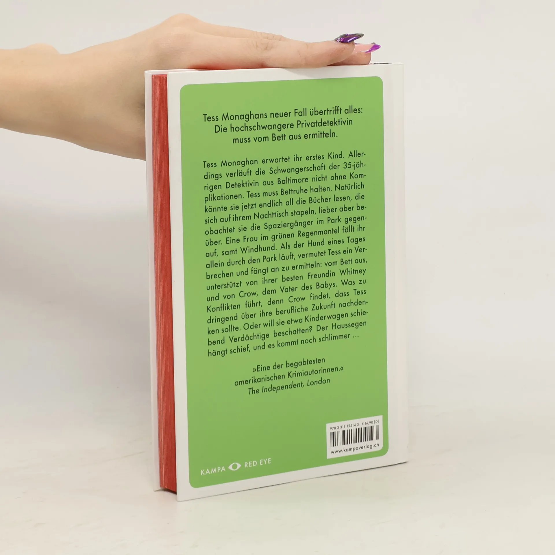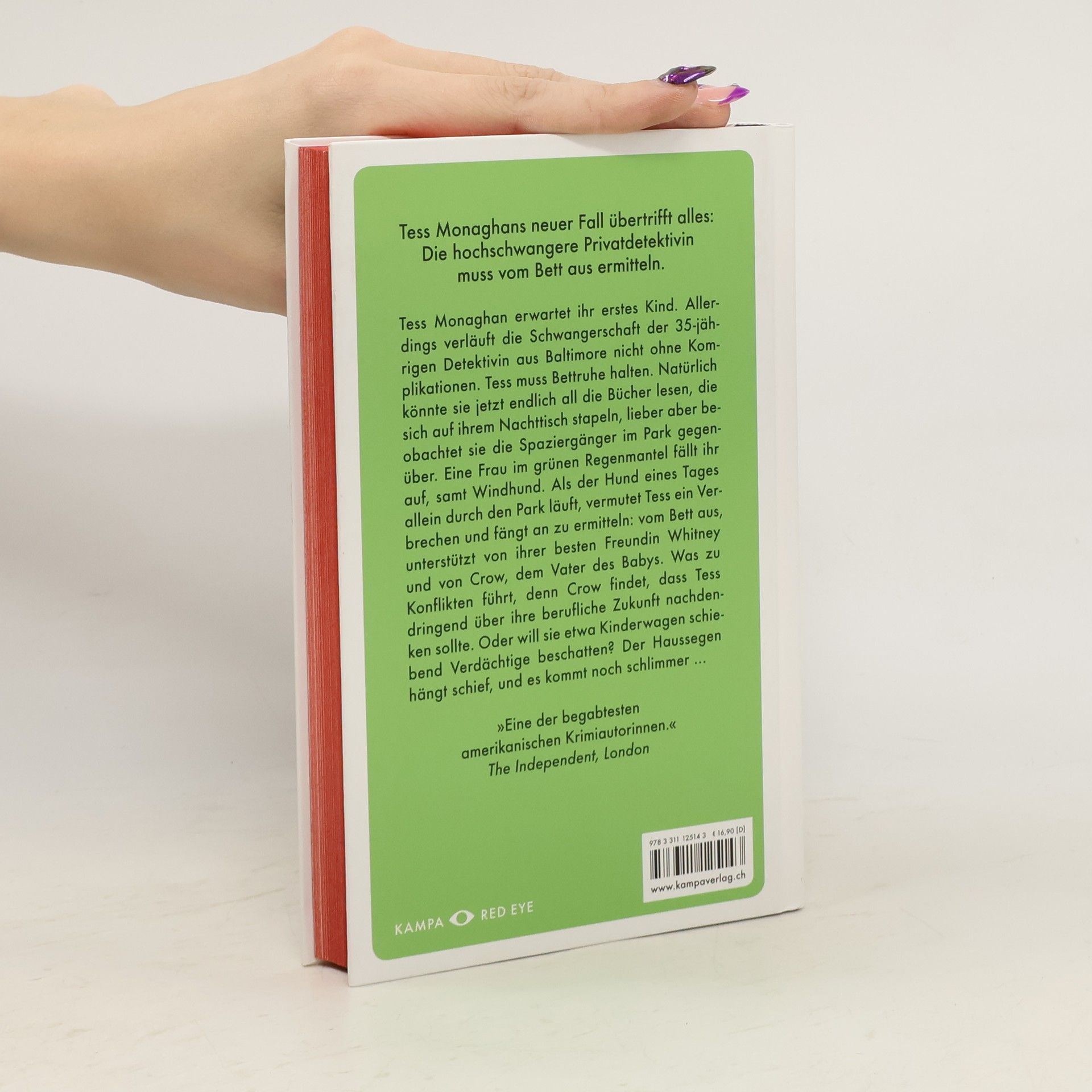 Mit ihren 35 Jahren gilt Privatdetektivin Tess Monaghan als Risikoschwangere. Wenn sie nicht ein Kind »in der Größe einer Bratwurst« zur Welt bringen wolle, wie ihre beste Freundin Whitney es wenig sensibel formuliert, solle sie besser den Anweisungen der Ärzte folgen und die verbleibenden zwölf Wochen vor der Geburt Bettruhe halten. Natürlich könnte sie jetzt all die verpassten Bücher und Filme nachholen, lieber beobachtet sie aber aus dem Fenster die Spaziergänger im Park gegenüber. Eine junge Frau in einem grünen Regenmantel und mit einem Windhund fällt ihr ins Auge. Als der Hund eines Tages allein herumläuft, vermutet Tess ein Verbrechen und fängt an zu ermitteln: vom Bett aus, mit der besten Freundinals Assistentin und mit Crow, dem Vater des Babys, der jetzt nicht nur Essen holen, sondern auch Informationen beschaffen muss. Was zu Konflikten führt, denn der sonst so moderne Crow findet, dass Tess über ihre berufliche Zukunft nachdenken sollte. Oder will sie später Kinderwagen schiebend Verdächtige beschatten? Der Haussegen hängt schief, und es kommt noch viel schlimmer ...