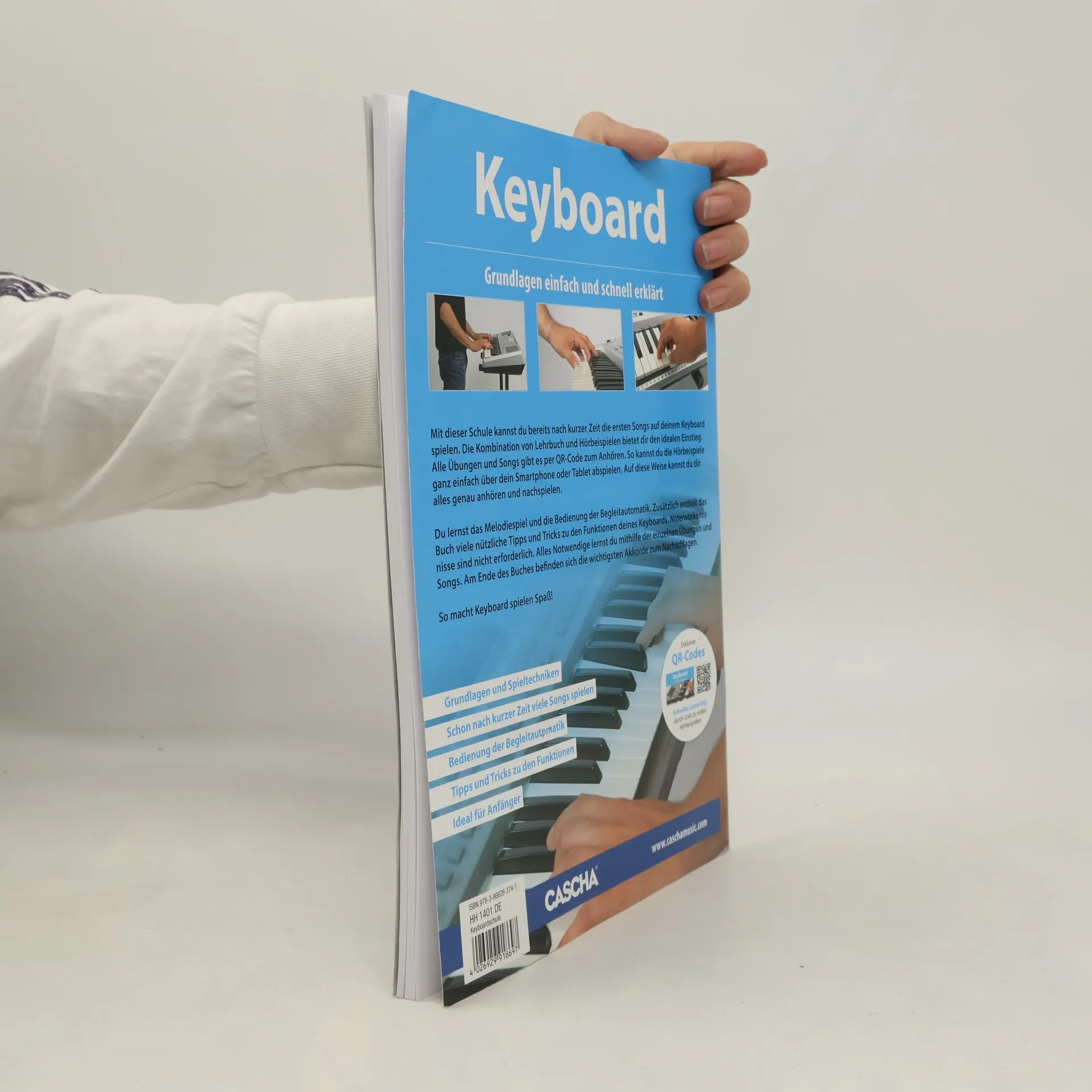 Mit dieser Schule kannst du bereits nach kurzer Zeit die ersten Songs auf deinem Keyboard spielen. Die Kombination von Lehrbuch und Hörbeispielen bietet dir den idealen Einstieg. Alle Übungen und Songs gibt es per QR-Code zum Anhören. So kannst du die Hörbeispiele ganz einfach über dein Smartphone oder Tablet abspielen. Auf diese Weise kannst du dir alles genau anhören und nachspielen. Du lernst das Melodiespiel und die Bedienung der Begleitautomatik. Zusätzlich enthält das Buch viele nützliche Tipps und Tricks zu den Funktionen deines Keyboards. Notenvorkenntnisse sind nicht erforderlich. Alles Notwendige lernst du mithilfe der einzelnen Übungen und Songs. Am Ende des Buches befinden sich die wichtigsten Akkorde zum Nachschlagen. So macht Keyboard spielen Spaß!