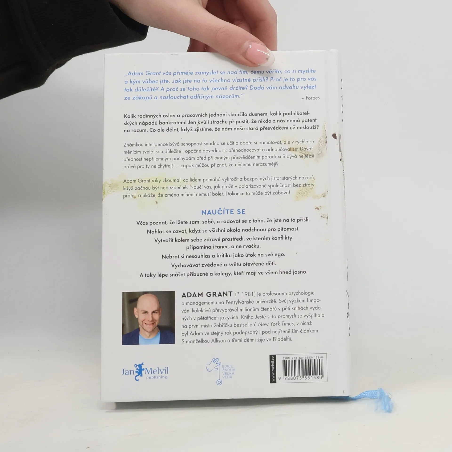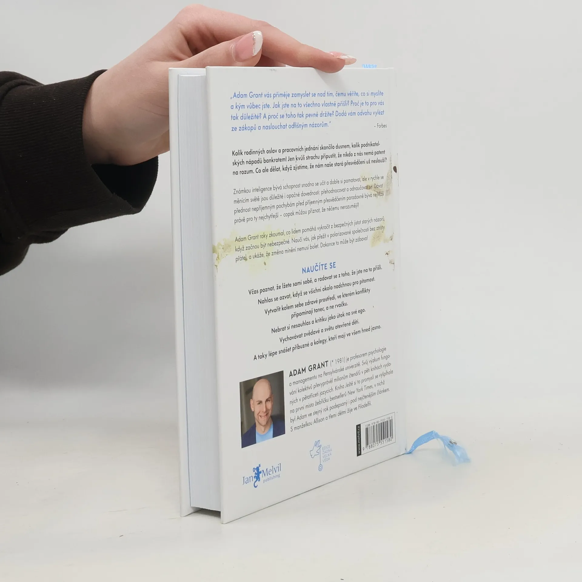 Inteligence je obvykle vnímána jako schopnost myslet a učit se, ale v rychle se měnícím světě je důležitější jiný soubor kognitivních dovedností: schopnost přehodnocovat a odnaučovat se. Dávat přednost nepohodlí pochybností před zažitým přesvědčením. Nenaslouchat pouze názorům, které nám dělají dobře, ale dát prostor myšlenkám, které nás nutí k zamyšlení. Nevnímat něčí nesouhlas jako útok na své ego. Samotná inteligence však problém neřeší: čím jsme bystřejší, tím slepější můžeme být vůči svým vlastním omezením. Organizační psycholog Adam Grant vás v této knize naučí, jak mít otevřenou mysl. Na základě provokativních myšlenek a pečlivých důkazů zkoumá, jak se radovat z toho, že se mýlíme. Jen tak se však můžeme stát celoživotním nadšeným studentem světa. Vždyť je osvobozující, že nemusíme věřit všemu, co si myslíme, ani přijímat vše, co zrovna cítíme! Vzdejme se názorů, které nám už neslouží, a dejme přednost mentální flexibilitě před hloupou důsledností.