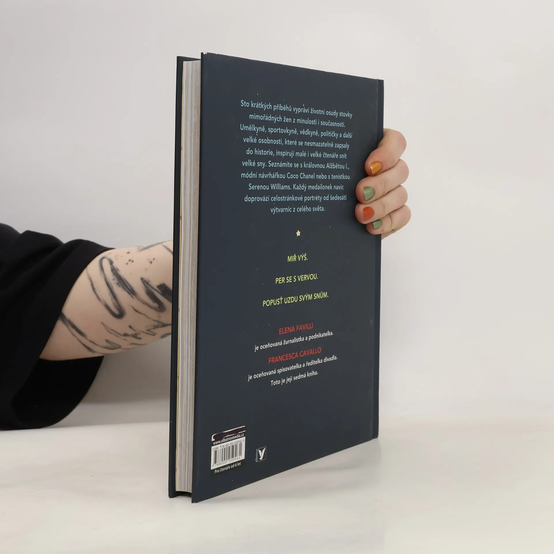"Sněte, ještě než půjdete spát! Světový bestseller představuje životy inspirativních žen napříč dějinami." Sto krátkých příběhů vypráví životní osudy stovky mimořádných žen z minulosti i současnosti. Umělkyně, sportovkyně, vědkyně, političky a další velké osobnosti, které se nesmazatelně zapsaly do historie, inspirují malé i velké čtenáře snít velké sny. Seznámíte se s královnou Alžbětou I., módní návrhářkou Coco Chanel nebo s tenistkou Serenou Williams. Každý medailonek navíc doprovází celostránkové portréty od šedesáti výtvarnic z celého světa.