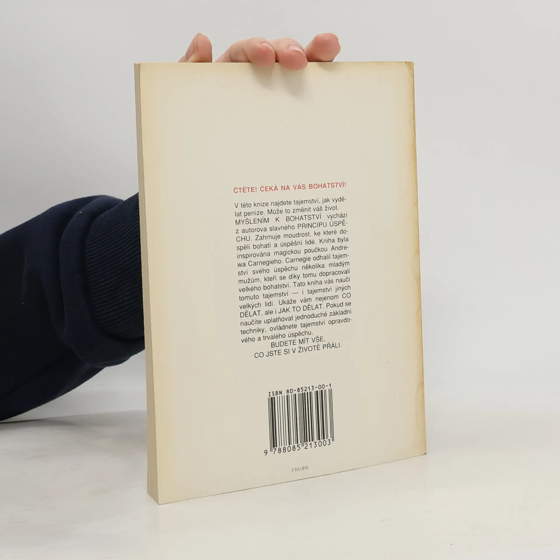 První vydání amerického bestselleru. Kniha nás naučí rozvíjet všechny dobré vlastnosti jako je vůle, rozhodnost, vytrvalost a pevný charakter. Je to návod na bohatství nejenom materiální, ale především bohatství vnitřní. Poukazuje na naše skryté kvality, na náš talent a podává návod, jak ho využít. Dozvíte se, jak si vytvořit správný okruh spolupracovníků, jak podnikat, jak začít, jak vytrvalostí dovést své záměry k úspěšnému konci. Všechno materiální má začátek v myšlence, to je základní idea této knihy od Napoleona Hilla. V této knize najdete tajemství, jak vydělat peníze. Může to změnit váš život. MYŠLENÍM K BOHATSTVÍ vychází z autorova slavného PRINCIPU ÚSPĚCHU. Zahrnuje moudrost, ke které dospěli bohatí a úspěšní lidé. Kniha byla inspirována magickou poučkou Andrewa Carnegieho. Carnegie odhalil tajemství svého úspěchu několika mladým mužům, kteří se díky tomu dopracovali velkého bohatství. Tato kniha vás naučí tomuto tajemství — i tajemství jiných velkých lidí. Ukáže vám nejenom CO DĚLAT, ale i JAK TO DĚLAT. Pokud se naučíte uplatňovat jednoduché základní techniky, ovládnete tajemství opravdového a trvalého úspěchu. BUDETE MÍT VŠE, CO JSTE SI V ŽIVOTĚ PŘÁLI.