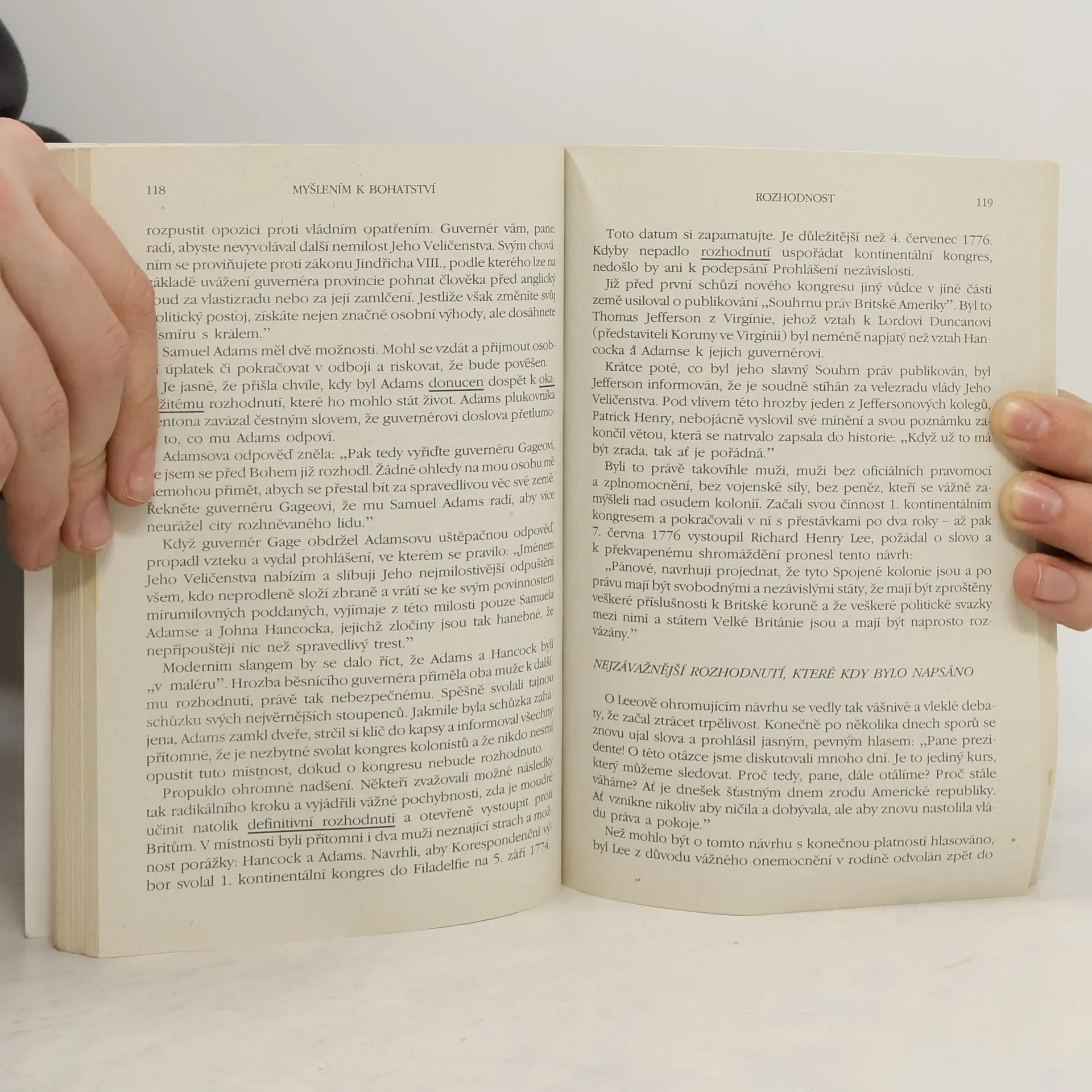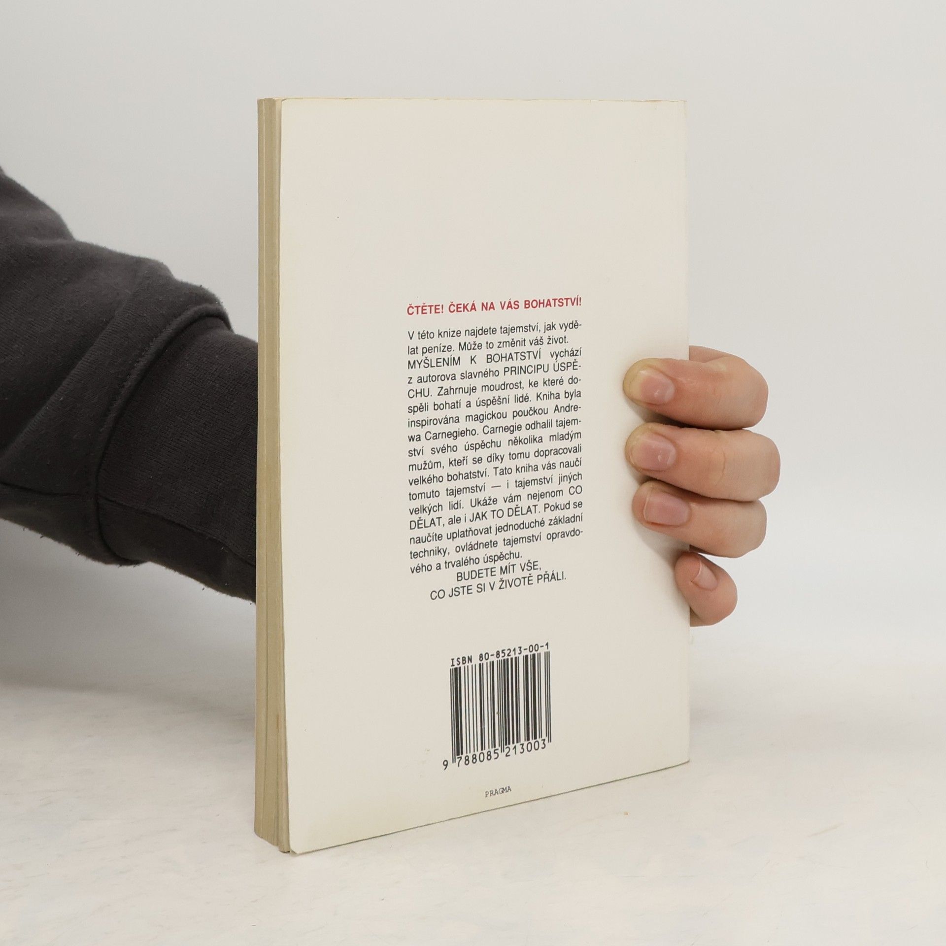 První vydání amerického bestselleru. Kniha nás naučí rozvíjet všechny dobré vlastnosti jako je vůle, rozhodnost, vytrvalost a pevný charakter. Je to návod na bohatství nejenom materiální, ale především bohatství vnitřní. Poukazuje na naše skryté kvality, na náš talent a podává návod, jak ho využít. Dozvíte se, jak si vytvořit správný okruh spolupracovníků, jak podnikat, jak začít, jak vytrvalostí dovést své záměry k úspěšnému konci. Všechno materiální má začátek v myšlence, to je základní idea této knihy od Napoleona Hilla. V této knize najdete tajemství, jak vydělat peníze. Může to změnit váš život. MYŠLENÍM K BOHATSTVÍ vychází z autorova slavného PRINCIPU ÚSPĚCHU. Zahrnuje moudrost, ke které dospěli bohatí a úspěšní lidé. Kniha byla inspirována magickou poučkou Andrewa Carnegieho. Carnegie odhalil tajemství svého úspěchu několika mladým mužům, kteří se díky tomu dopracovali velkého bohatství. Tato kniha vás naučí tomuto tajemství — i tajemství jiných velkých lidí. Ukáže vám nejenom CO DĚLAT, ale i JAK TO DĚLAT. Pokud se naučíte uplatňovat jednoduché základní techniky, ovládnete tajemství opravdového a trvalého úspěchu. BUDETE MÍT VŠE, CO JSTE SI V ŽIVOTĚ PŘÁLI.