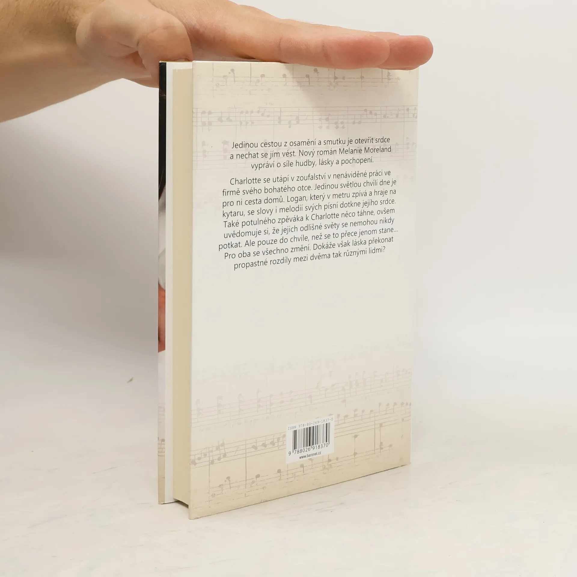 Jedinou cestou z osamění a smutku je otevřít srdce a nechat se jím vést. Nový román Melanie Moreland vypráví o síle hudby, lásky a pochopení. Charlotte se utápí v zoufalství v práci u bohatého otce, kterou nenávidí. Jedinou světlou chvílí dne je pro ni cesta domů. Montgomery, který v metru zpívá a hraje na kytaru, se slovy i melodií svých písní dotkne jejího srdce. Také potulného zpěváka k Charlotte něco táhne, ale uvědomuje si, že jejich odlišné světy se nemohou nikdy potkat. Ale pouze do chvíle, kdy se to přece jenom stane… Pro oba se všechno změní. Dokáže však láska překonat propastné rozdíly mezi dvěma tak různými lidmi?