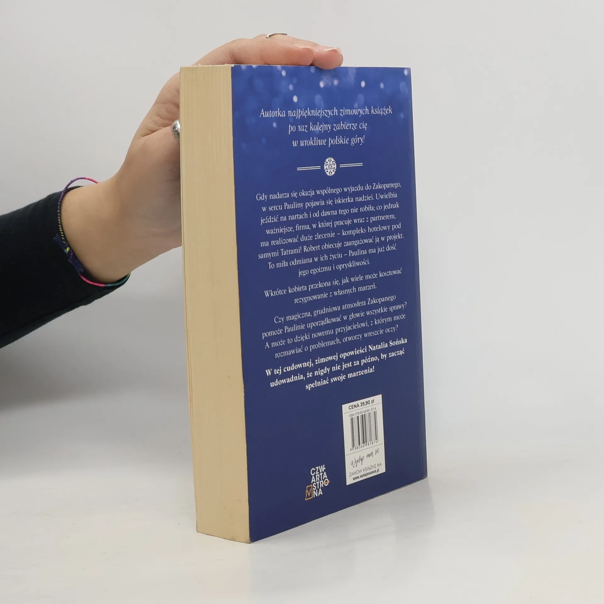 Autorka najpiękniejszych zimowych książek po raz kolejny zabiera nas na urokliwe południe Polski. Gwarantujemy, że po lekturze tej książki zapragniesz pojechać w góry! Gdy nadarza się okazja wspólnego wyjazdu do Zakopanego, w sercu Pauliny pojawia się iskierka nadziei. Uwielbia jeździć na nartach i od dawna tego nie robiła; co jednak ważniejsze, firma, w której pracuje wraz z partnerem, ma realizować duże zlecenie – kompleks hotelowy pod samymi Tatrami! Robert obiecuje zaangażować ją w projekt. To miła odmiana w ich życiu – Paulina ma już dość jego egoizmu i opryskliwości. Wkrótce kobieta przekona się, jak wiele może kosztować rezygnowanie z własnych marzeń. Czy magiczna, grudniowa atmosfera Zakopanego pomoże Paulinie uporządkować w głowie wszystkie sprawy? A może to dzięki nowemu przyjacielowi, z którym może rozmawiać o problemach, otworzy wreszcie oczy? W tej cudownej, zimowej opowieści Natalia Sońska udowadnia, że nigdy nie jest za późno, by zacząć spełniać swoje marzenia!