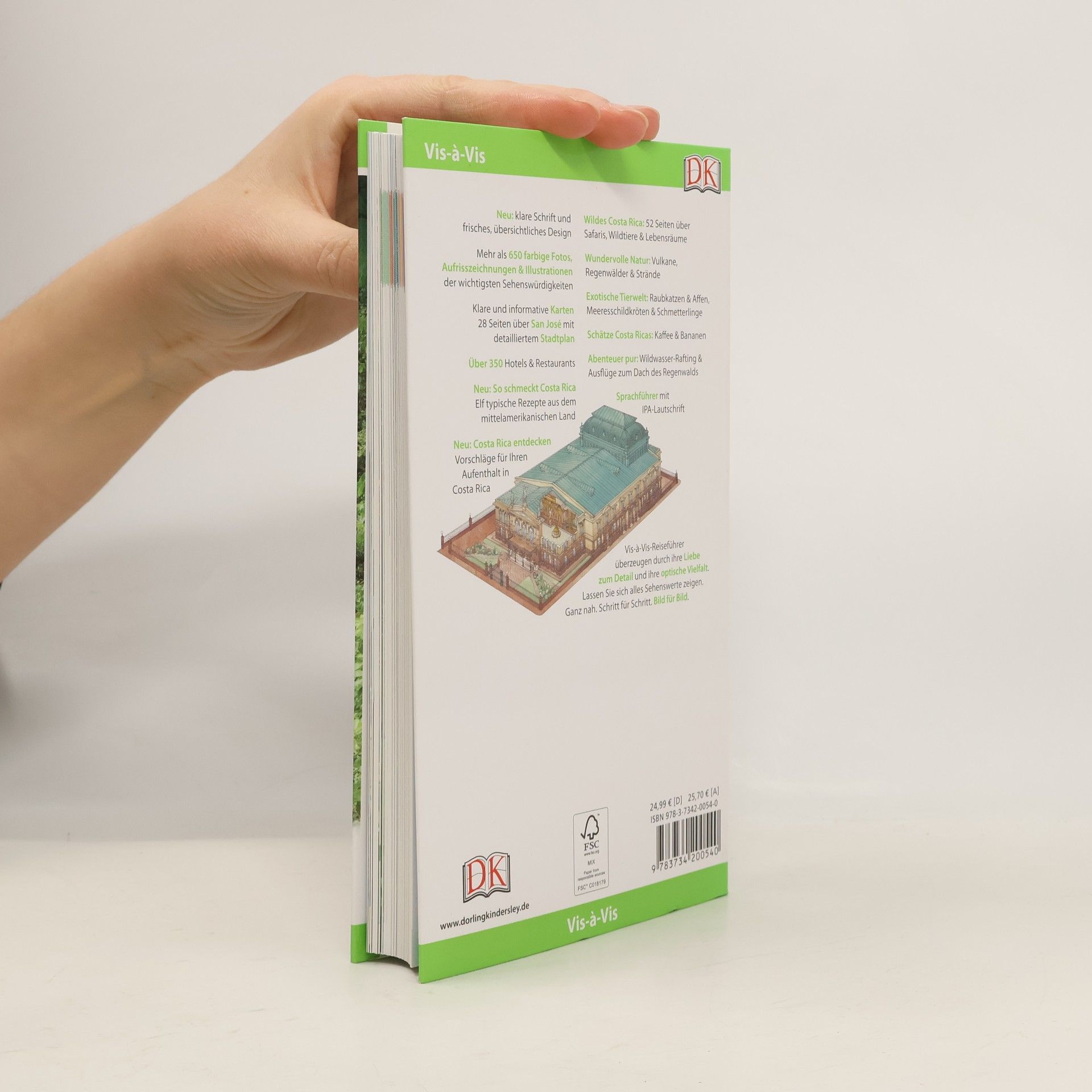 Costa Rica verheißt Abenteuer und Abwechslung: In zahlreichen Naturreservaten lassen sich Exoten wie Papageien, Schildkröten oder Totenkopfäffchen entdecken. Wunderschöne Strände laden zum Baden, Surfen und Tauchen ein, das Hochland bietet ideale Bedingungen zum Wandern. Im Vis-à-Vis Costa Rica finden Sie für jedes Vorhaben alle Informationen, die Sie benötigen: vom Veranstalter für Safaritouren über Hotels an der Karibikküste bis zum traditionellen Restaurant im Zentralen Hochland. Dank detailliertem Stadtplan und Aufrisszeichnungen von Sehenswürdigkeiten wie dem Nationaltheater finden Sie sich in der Hauptstadt San José mühelos zurecht. Die faszinierende Tierwelt und die beeindruckende Natur Costa Ricas werden auf 52 Seiten ausführlich beschrieben. Außerdem gibt es besondere Tipps und Hintergründe zu indigenem Kunsthandwerk, Schmuck und Kaffee. Erstmalig bei einem Reiseführer gibt es ein Mini-Kochbuch zum Herausnehmen mit typischen Gerichten des Landes. Die hervorragenden Abbildungen - exakte Schnittzeichnungen, dreidimensionale Grundrisse, Übersichtskarten und Stadtpläne - erleichtern Ihnen die Orientierung vor Ort. Der ausführliche Praxisteil bietet aktuelle Angaben zu Hotels, Restaurants, Shopping, Nachtleben und Unterhaltung sowie praktische Tipps zu Verkehrsmitteln, Öffnungszeiten und vieles mehr.