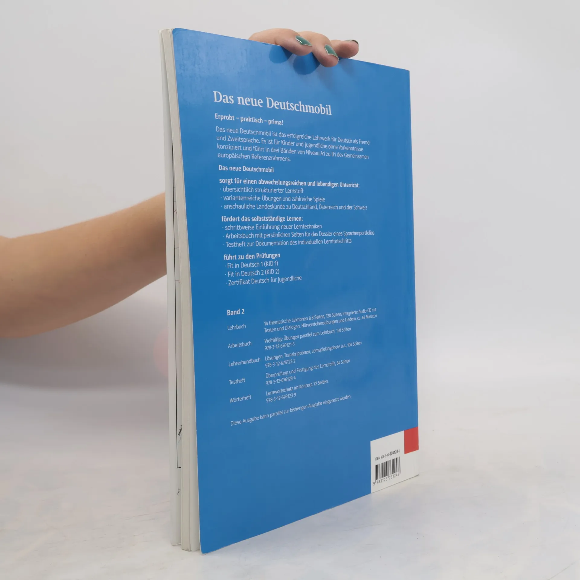 Učební komplet Das neue Deutschmobil je určen pro počáteční výuku němčiny. Cílovou skupinou jsou děti od 8 do 14 let navšech typech škol Skládá se ze tří dílů vždy po 14 lekcích. Jednotlivé díly odpovídají stupňům Společného evropského referenčního rámce (A1, A2 a B1) a dovedou ke zkoušce Fit in Deutsch 1, Fit in Deutsch 2 a Zertifikat Deutsch. Das neue Deutschmobil představuje praktický balíček, kde najdete vše, co je potřeba ke zdařilé výuce: - látka strukturovaná do malých učebních kroků - jasně a jednotně členěné lekce - pestrost, metodická rozmanitost a množství her. Učební techniky jsou zprostředkované krok za krokem, žáci s různými učebními styly mohou využít různých učebních cest. Pracovní sešit a sešit s testy vedou k samostatnému učení a dokumentují vlastní pokrok. Gramatika je integrována do témat lekcí a žáci se ji učí jakoby „mimochodem“. Komiks s rodinou Schlaumeierových na konci každé lekce podněcuje k hravému opakování. Počáteční fonetický kurz a fonetická cvičení v každé lekci zaručují úspěšné osvojení správné výslovnosti. V učebnici jsou zakomponovány reálie německy mluvících zemí. Učební komplet zahrnuje učebnici s integrovaným CD, pracovní sešit, metodickou příručku pro učitele, sešit s testy, a je opatřen schvalovací doložkou MŠMT. // Achtung: Falls auf dem Foto keine Anhänge abgebildet sind, sind diese nicht im Lieferumfang enthalten.