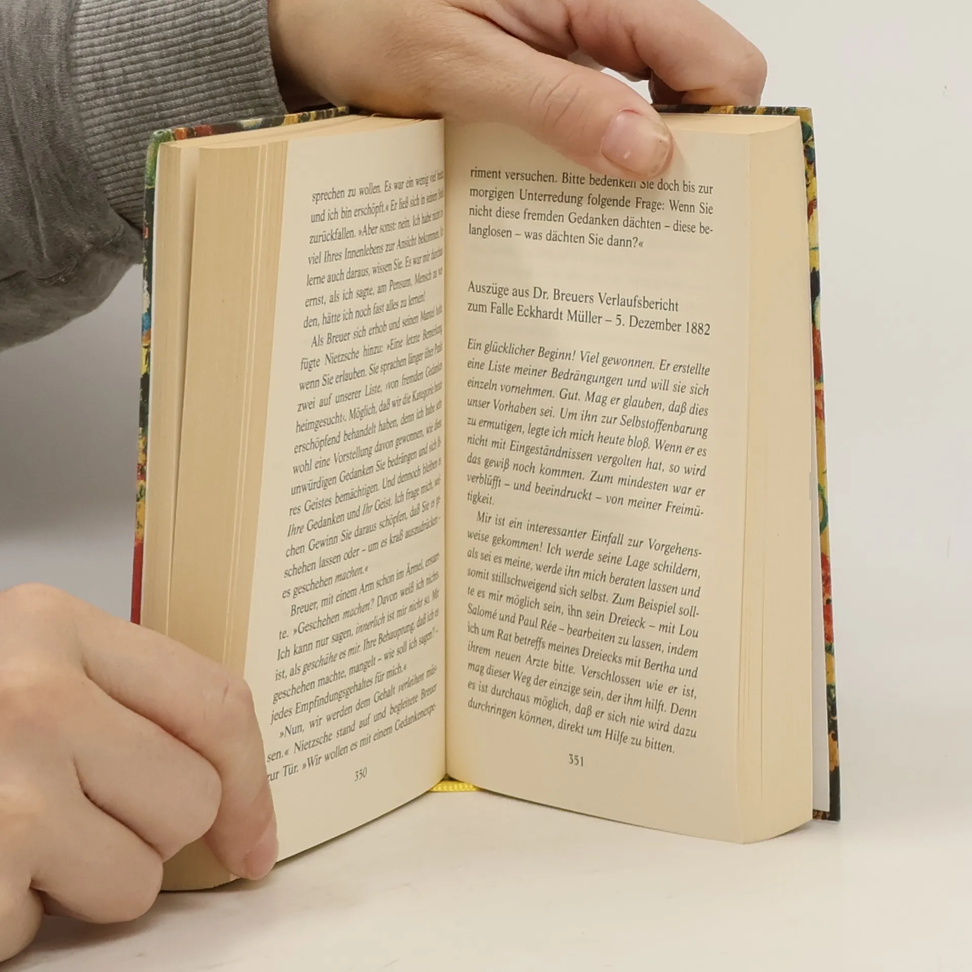 Eine Ménage à trois zwischen Lou Andreas Salomé, Nietzsche und der Psychoanalyse Die Geschenkausgabe mit der abgerundeten Ecke: anspruchsvolle Haptik, hochwertiges Papier, mit Lesebändchen, kleines Format. Das Wien des Fin de siècle: Die selbstbewusste junge Russin Lou Andreas Salomé drängt den angesehenen Arzt Josef Breuer, dem suizidgefährdeten Friedrich Nietzsche zu helfen und ihn von seiner zerstörerischen Obsession für sie zu kurieren. Breuer willigt ein und unterzieht Nietzsche einer neuartigen Heilungsmethode, deren Ausgang jedoch für beide unerwartet ist. Ausstattung: sechs s/w-Fotos