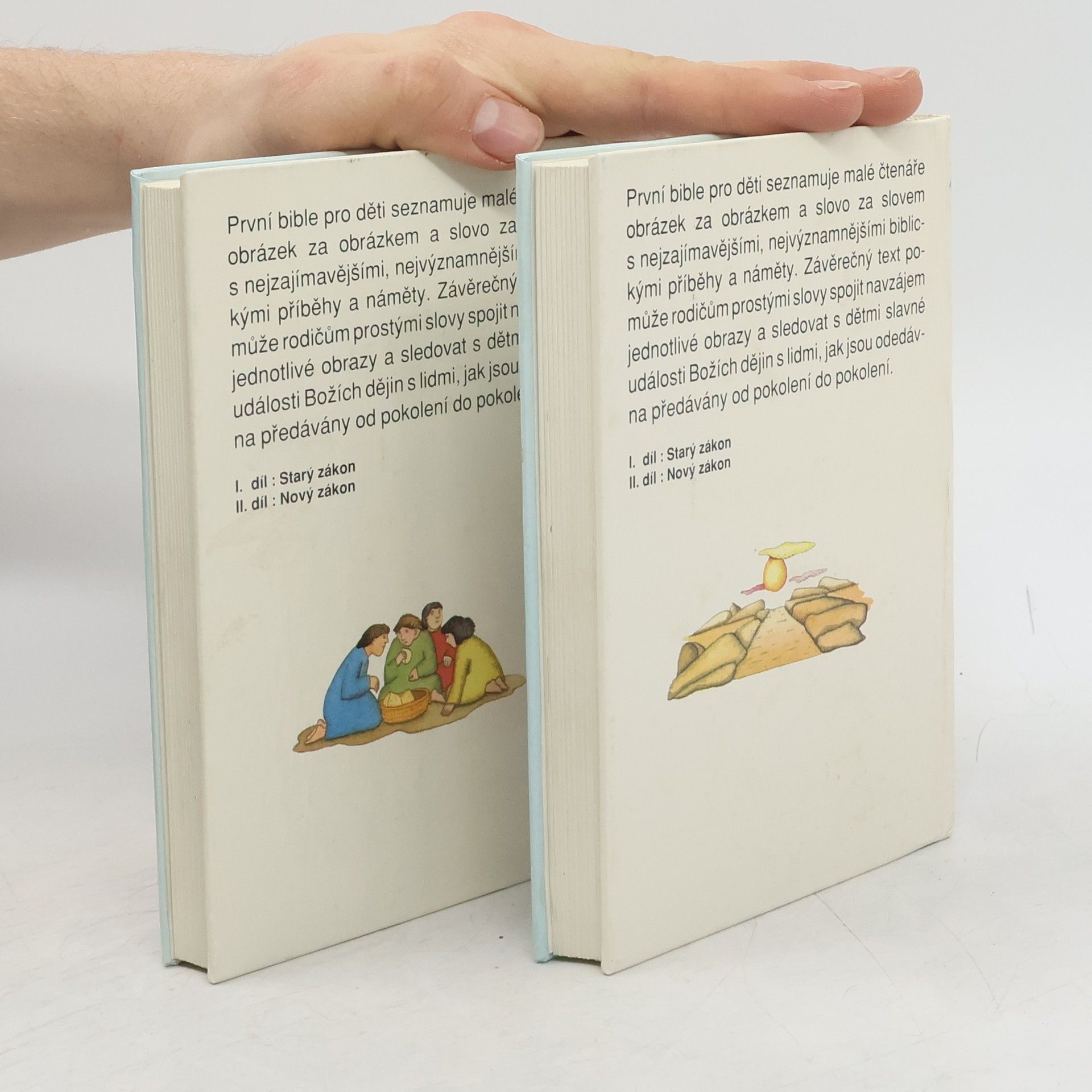 První bible pro děti seznamuje malé čtenáře obrázek za obrázkem a slovo za slovem s nezajímavějšími, nejvýznamnějšími biblickými příběhy a náměty. Závěrečný text pomůže rodičům prostými slovy spojit navzájem jednotlivé obrazy a sledovat s dětmi slavné události Božích dějin slidmi, jak jsou odedávna předávány od pokolení do pokolení.
