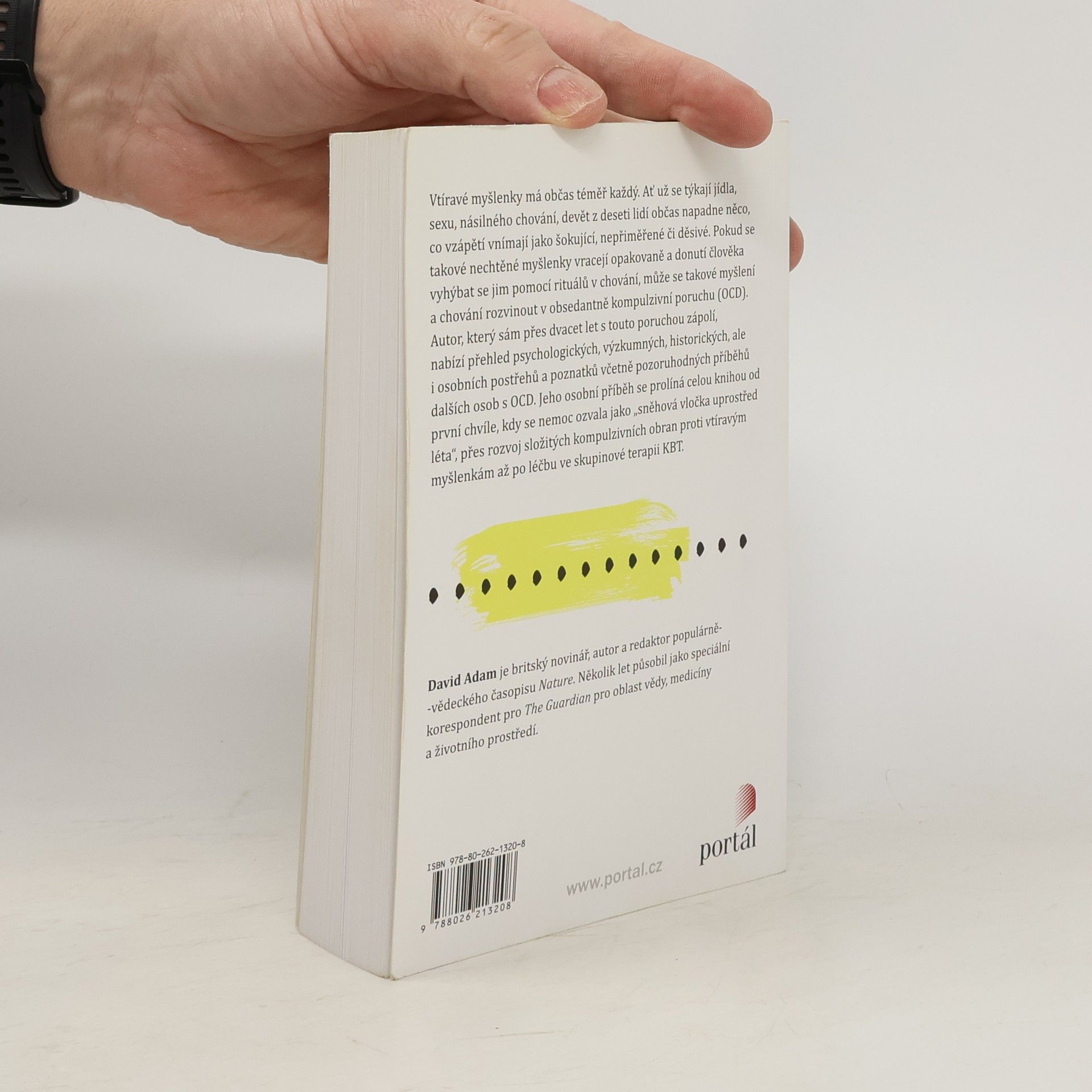 Podtitul: Život s obsedantně kompulzivní poruchou. „Řekněme, že stojíte blízko okraje útesu a užíváte si výhled. Není tu žádná bezpečnostní zábrana a část vašeho mozku, která hlídá možná nebezpečí a instinktivně se jim vyhýbá, znervózní a vyšle signál nohám, aby udělaly krok zpět, a riziko tím snížily. Jiná část mozku tento příkaz pohnout nohama zaznamená a snaží se ho vysvětlit tím, že porovná imaginární hrozbu s realitou. Žádná bezprostřední hrozba tu však není. Klidně stojíte. Proč tedy ustupovat zpět? V čem je problém? Mozek – generátor vtíravých myšlenek – vystřelí (iracionální) návrh: problém musí být v tom, že jsi chtěl skočit.“ Vtíravé myšlenky má občas téměř každý. Ať už se týkají jídla, sexu, násilného chování, devět z deseti lidí občas napadne něco, co vzápětí vnímají jako šokující, nepřiměřené či děsivé. Pokud se takové nechtěné myšlenky vracejí opakovaně a donutí člověka vyhýbat se jim pomocí rituálů v chování, může se takové myšlení a chování rozvinout v obsedatně kompulzivní poruchu. Autor, který sám přes dvacet let s touto poruchou zápolí, v upřímné snaze jí porozumět nabízí přehled psychologických, výzkumných, historických, ale i osobních postřehů a poznatků. Osobní příběh se prolíná celou knihou od prvního výskytu, kdy se nemoc ozvala jako „sněhová vločka uprostřed léta“, přes rozvoj složitých kompulzivních obran proti vtíravým myšlenkám, až po léčbu ve skupinové terapii KBT.