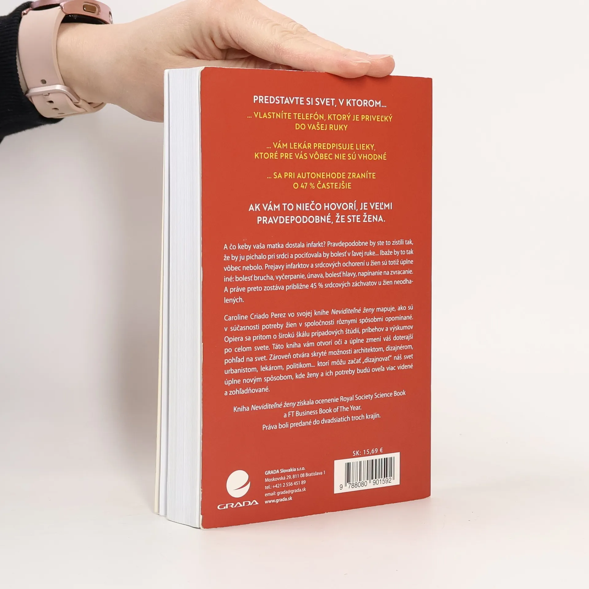 PREDSTAVTE SI SVET, V KTOROM… ... vlastníte telefón, ktorý je priveľký do vašej ruky ... vám lekár predpisuje lieky, ktoré pre vás vôbec nie sú vhodné ... sa pri autonehode zraníte o 47 % častejšie AK VÁM TO NIEČO HOVORÍ, JE VEĽMI PRAVDEPODOBNÉ, ŽE STE ŽENA. A čo keby vaša matka dostala infarkt? Pravdepodobne by ste to zistili tak, že by ju pichalo pri srdci a pociťovala by bolesť v ľavej ruke... Ibaže by to tak vôbec nebolo. Prejavy infarktov a srdcových ochorení u žien sú totiž úplne iné: bolesť brucha, vyčerpanie, únava, bolesť hlavy, napínanie na zvracanie. A práve preto zostáva približne 45 % srdcových záchvatov u žien neodhalených. Caroline Criado Perez vo svojej knihe Neviditeľné ženy mapuje, ako sú v súčasnosti potreby žien v spoločnosti rôznymi spôsobmi opomínané. Opiera sa pritom o širokú škálu prípadových štúdií, príbehov a výskumov naprieč celým svetom. Táto kniha vám otvorí oči a úplne zmení váš doterajší pohľad na svet. Zároveň otvára skryté možnosti architektom, dizajnérom, urbanistom, lekárom, politikom... ktorí môžu začať „dizajnovať“ náš svet úplne novým spôsobom, kde ženy a ich potreby budú oveľa viac videné a zohľadňované. Kniha Neviditeľné ženy získala ocenenie Royal Society Science Book a FT Business Book of The Year. Práva boli predané do dvadsiatich troch krajín.