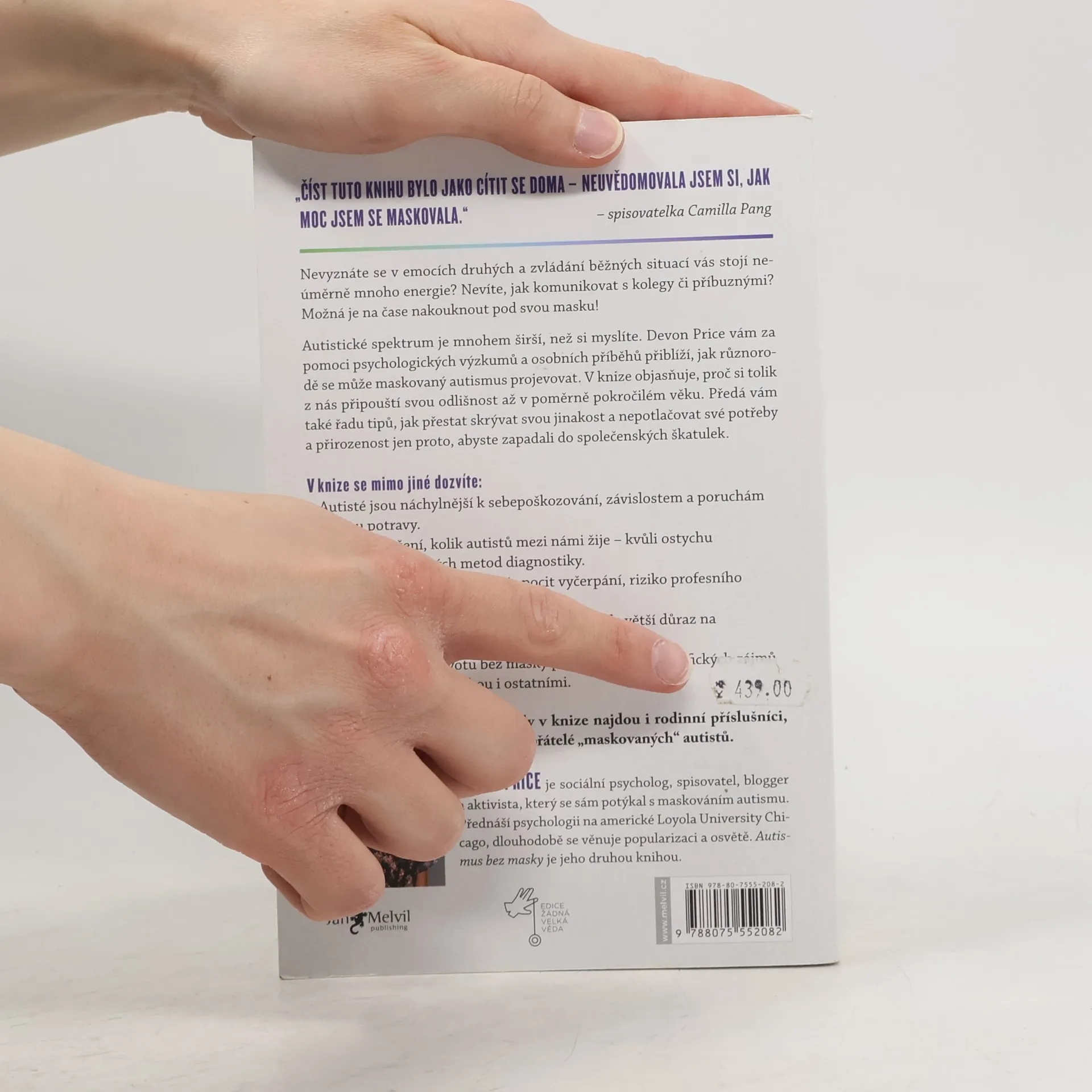 „Číst tuto knihu bylo jako cítit se doma – neuvědomovala jsem si, jak moc jsem se maskovala.“ — spisovatelka Camilla Pang. Cítíte se vyčerpaní z neustálého snažení porozumět emocím druhých a zvládat běžné situace? Možná je čas podívat se pod svou masku! Autistické spektrum je mnohem širší, než se zdá. Autor pomocí psychologických výzkumů a osobních příběhů ukazuje, jak se maskovaný autismus projevuje. Vysvětluje, proč si mnozí z nás uvědomují svou odlišnost až ve zralém věku, a nabízí tipy, jak přestat skrývat svou jinakost a potřeby kvůli společenským normám. Zjistíte, že autisté jsou náchylnější k sebepoškozování, závislostem a poruchám příjmu potravy, a že mnozí z nich žijí mezi námi neodhaleni kvůli ostychu a zastaralým diagnostickým metodám. Odmaskování autismu může snížit vyčerpání, riziko vyhoření, deprese a úzkosti. Společnost často upřednostňuje „poslušnost“ před psychickým zdravím autistů. K životu bez masky patří pěstování specifických zájmů a autenticita. Cenné rady najdou i rodinní příslušníci a přátelé „maskovaných“ autistů. Autor, sociální psycholog a aktivista, se sám potýkal s maskováním autismu a dlouhodobě se věnuje osvětě.