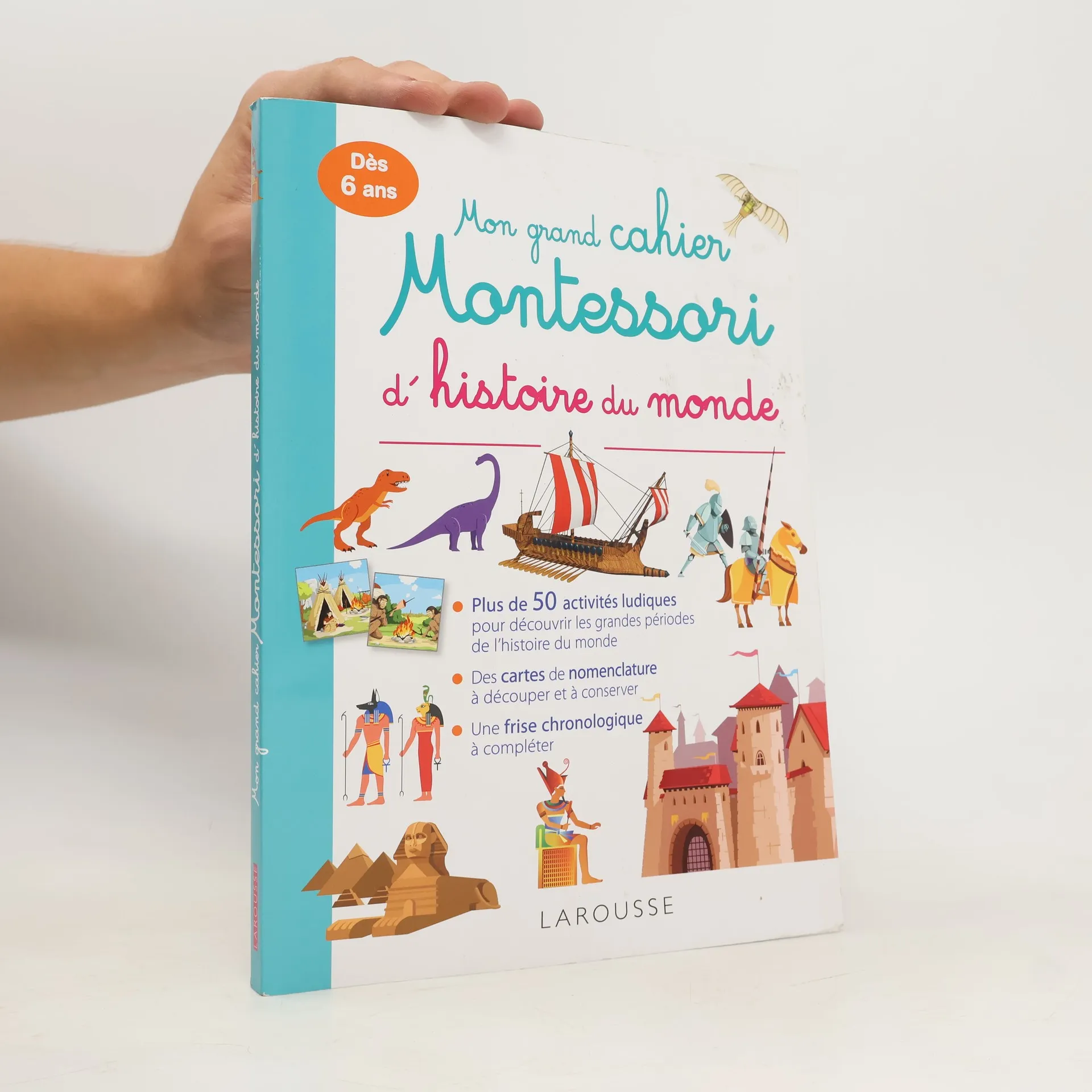 Grâce à plus de 50 activités pédagogiques et ludiques, les enfants pourront, dès 6 ans, découvrir les grandes périodes de l'histoire du monde, du big bang à la Déclaration des droits de l'homme et du citoyen ! Chaque période de l'histoire (la formation de la Terre, la préhistoire, l'Antiquité, le Moyen Age, les temps modernes...) est introduite par une activité de découverte, puis des jeux sont proposés à l'enfant pour aller plus avant dans la connaissance de la période et des événements qui l'ont marquée (des scènes à compléter, des images à trier, des voyages à tracer sur une carte, etc.). Le matériel à découper en fin de cahier favorise la manipulation et la mémorisation. La notion de chronologie est abordée grâce à une frise illustrée qui se poursuit tout au long du cahier, accompagne toutes les activités et permet à l'enfant de situer les personnages et les événements les uns par rapport aux autres. Conformément aux principes de la pédagogie Montessori, ce cahier propose des activités basées sur l'expérimentation sensorielle : l'enfant est notamment invité à fabriquer son propre papyrus, à enluminer une lettrine comme sur un manuscrit médiéval, à construire une des machines volantes de Léonard de Vinci... Avec : des images autocorrectives, des puzzles, des papertoys à monter soi-même.