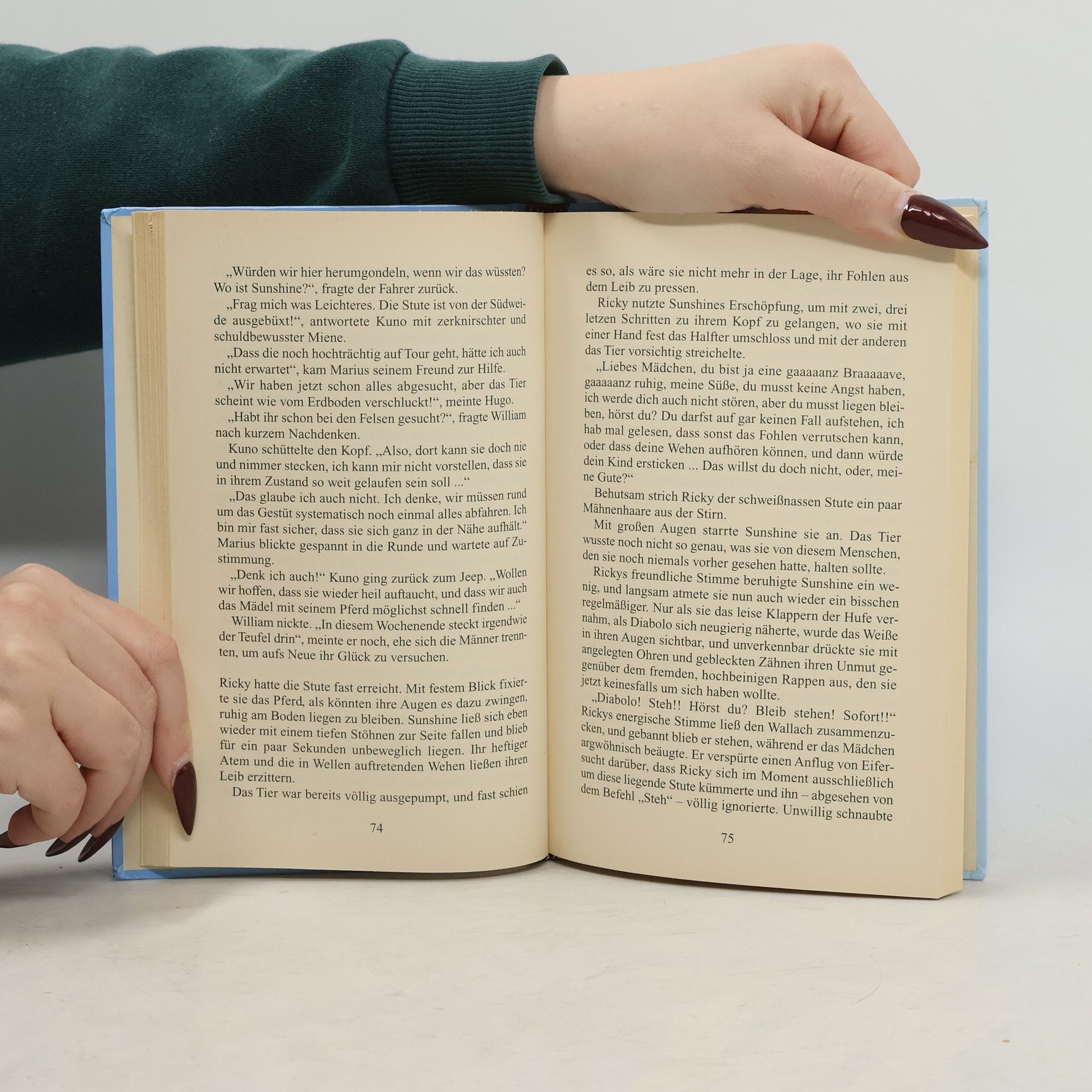 Ricky und ihre Freunde dürfen mit ihren Pferden ein Wochenende auf dem Gestüt Hohenhausen verbringen, doch schon die Hinfahrt erweist sich als problematisch. Als sie endlich dort sind, stellt sich heraus, dass sich die beste Zuchtstute des Gestüts, hochträchtig, von der Koppel selbstständig gemacht hat, und das zu einem Zeitpunkt, wo das Fohlen jederzeit zur Welt kommen könnte. Eine dramatische Suche nach dem Tier beginnt, und nachdem Ricky es endlich auf einem Felsplateau entdeckt hat, ist es noch keineswegs sicher, dass das Fohlen gesund das Licht der Welt erblicken wird, denn unbeabsichtigt lösen Ricky und Diabolo bei der Stute ein Schockerlebnis aus …