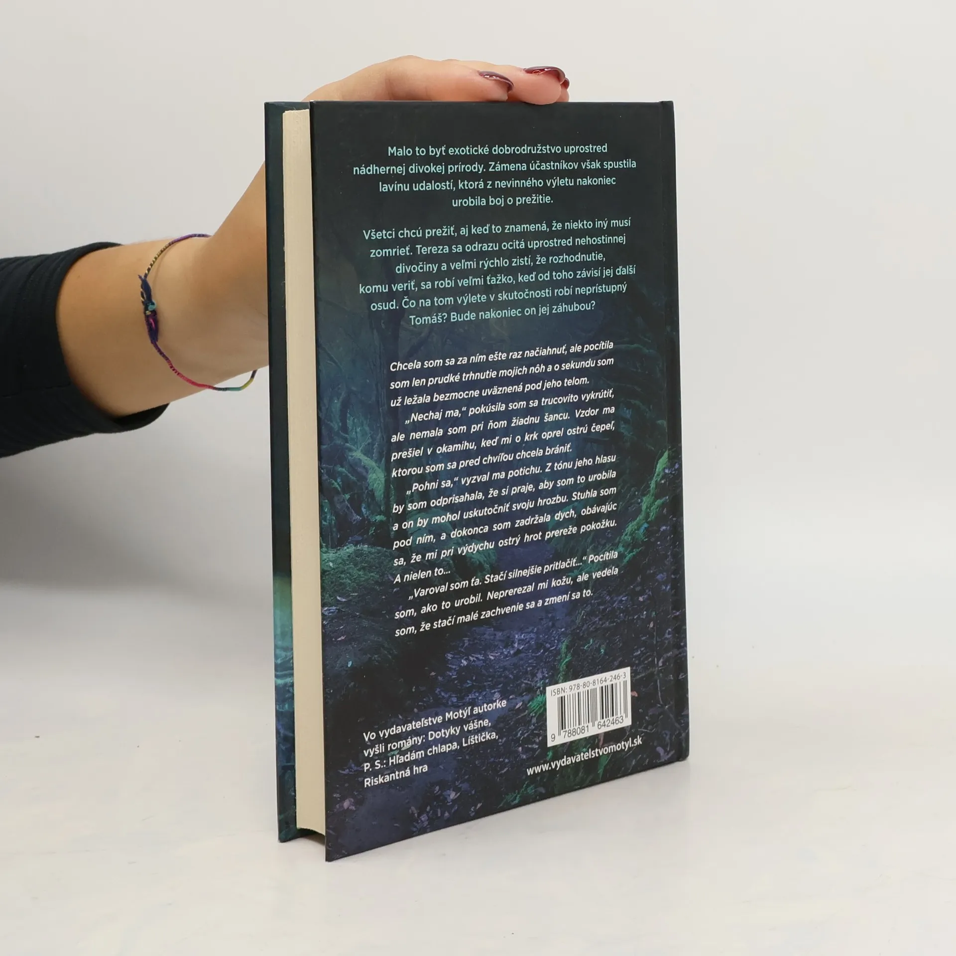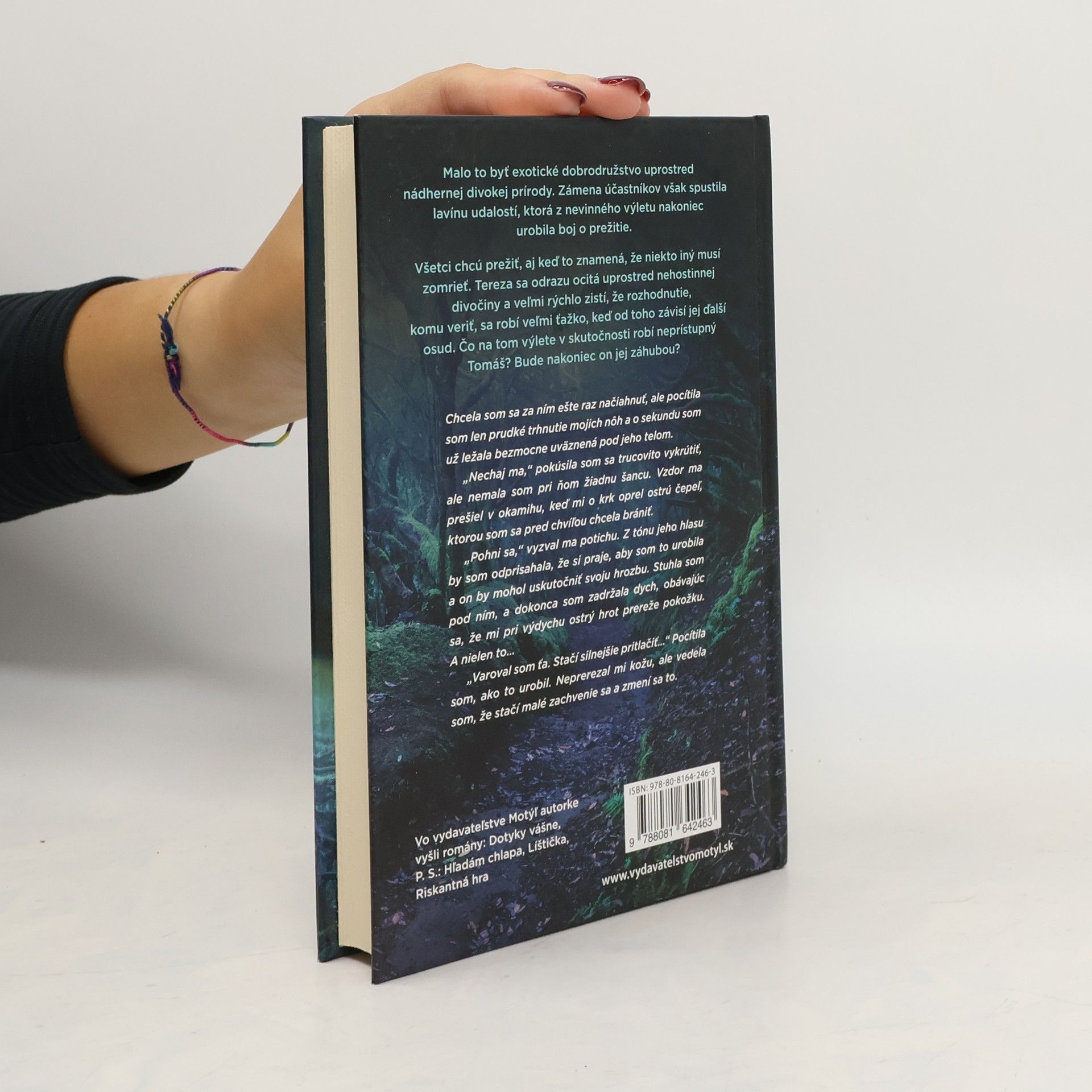 Malo to byť exotické dobrodružstvo uprostred nádhernej divokej prírody. Zámena účastníkov však spustila lavínu udalostí, ktorá z nevinného výletu nakoniec urobila boj o prežitie. Všetci chcú prežiť, aj keď to znamená, že niekto iný musí zomrieť. Tereza sa odrazu ocitá uprostred nehostinnej divočiny a veľmi rýchlo zistí, že rozhodnutie, komu veriť, sa robí veľmi ťažko, keď od toho závisí jej ďalší osud. Čo na tom výlete v skutočnosti robí neprístupný Tomáš? Bude nakoniec on jej záhubou? Chcela som sa za ním ešte raz načiahnuť, ale pocítila som len prudké trhnutie mojich nôh a o sekundu som už ležala bezmocne uväznená pod jeho telom. „Nechaj ma," pokúsila som sa trucovito vykrútiť, ale nemala som pri ňom žiadnu šancu. Vzdor ma prešiel v okamihu, keď mi o krk oprel ostrú čepeľ, ktorou som sa pred chvíľou chcela brániť. „Pohni sa," vyzval ma potichu. Z tónu jeho hlasu by som odprisahala, že si praje, aby som to urobila a on by mohol uskutočniť svoju hrozbu. Stuhla som pod ním, a dokonca som zadržala dych, obávajúc sa, že mi pri výdychu ostrý hrot prereže pokožku. A nielen to… „Varoval som ťa. Stačí silnejšie pritlačiť…" Pocítila som, ako to urobil. Neprerezal mi kožu, ale vedela som, že stačí malé zachvenie sa a zmení sa to.