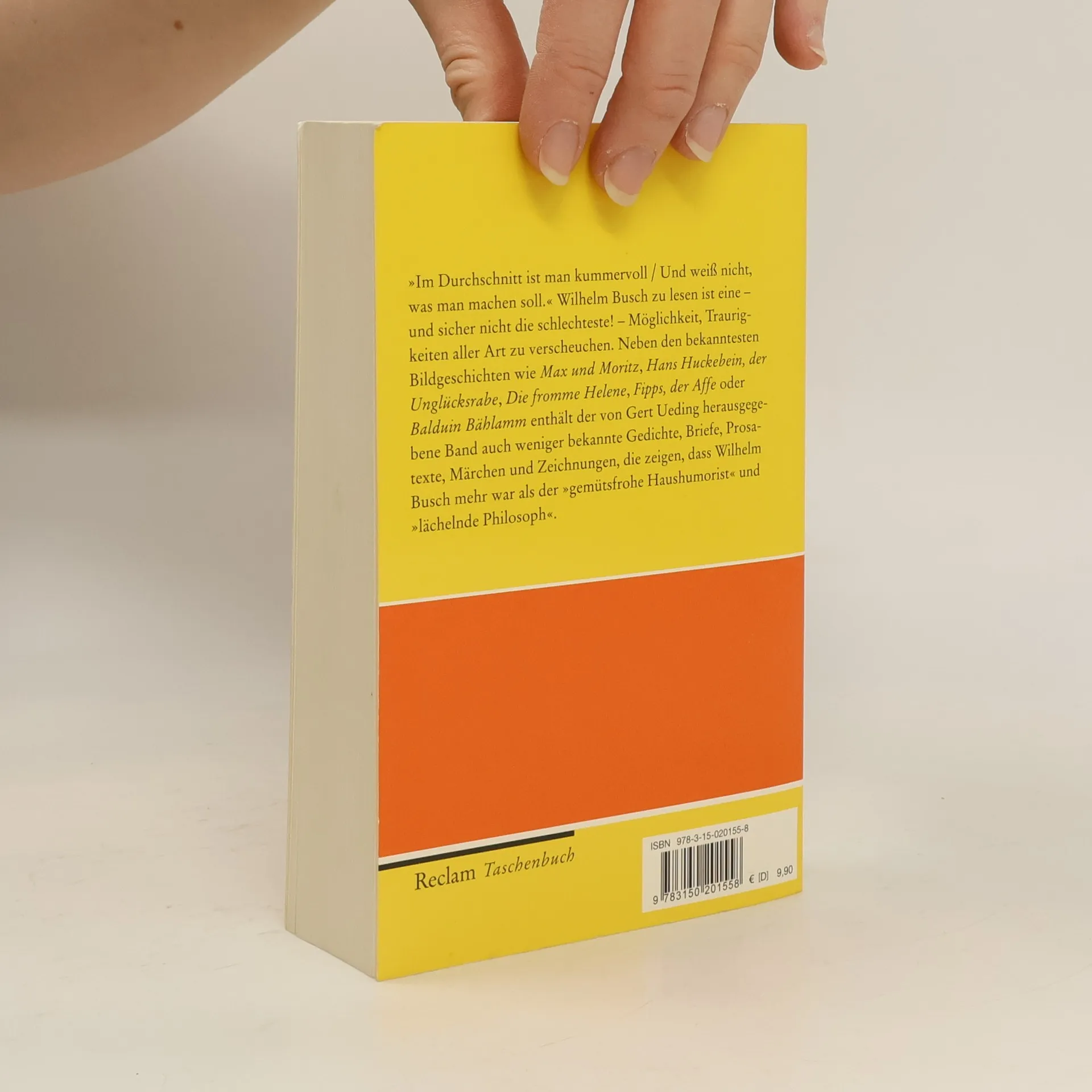 Neben den bekanntesten Bildgeschichten wie Max und Moritz, Hans Huckebein, der Unglücksrabe, Die fromme Helene, Fips, der Affe oder Balduin Bählamm enthält der von Gert Ueding herausgegebene Band auch weniger bekannte Gedichte, Briefe, Prosatexte, Märchen und Zeichnungen, die zeigen, dass Wilhelm Busch mehr war als der "gemütsfrohe Haushumorist" und "lächelnde Philosoph".
