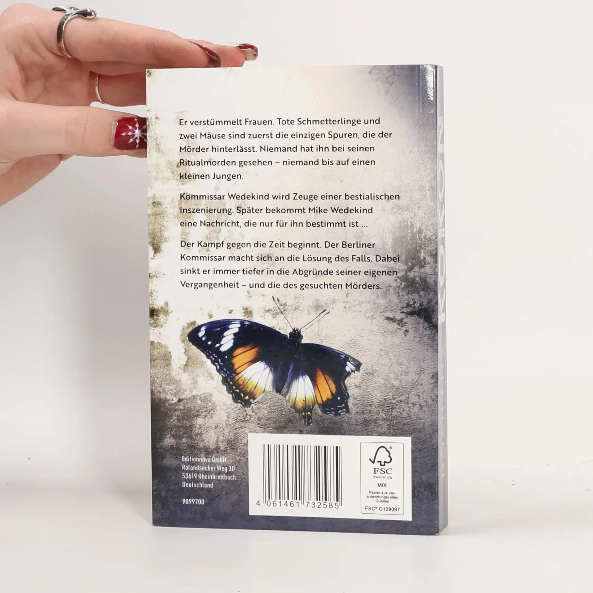 Er verstümmelt Frauen. Tote Schmetterlinge und zwei Mäuse sind zuerst die einzigen Spuren, die der Mörder hinterlässt. Niemand hat ihn bei seinen Ritualmorden gesehen - niemand bis auf einen kleinen Jungen. Kommissar Wedekind wird Zeuge einer bestialischen Inszenierung. Später bekommt Mike Wedekind eine Nachricht, die nur für ihn bestimmt ist ... Der Kampf gegen die Zeit beginnt. Der Berliner Kommissar macht sich an die Lösung des Falls. Dabei sinkt er immer tiefer in die Abgründe seiner eigenen Vergangenheit - und die des gesuchten Mörders.