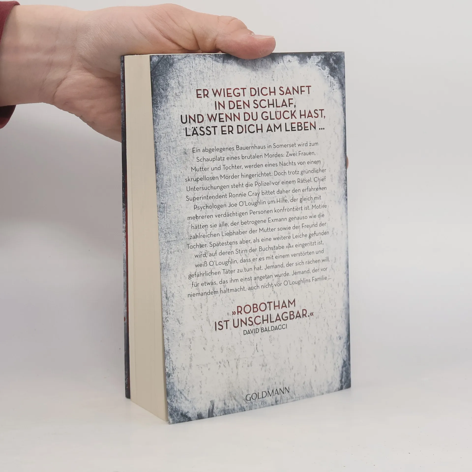 Er wiegt dich sanft in den Schlaf, und wenn du Glück hast, lässt er dich am Leben ... Ein abgelegenes Bauernhaus in Somerset wird zum Schauplatz eines brutalen Mordes: Zwei Frauen, Mutter und Tochter, werden eines Nachts von einem skrupellosen Mörder hingerichtet. Doch trotz gründlicher Untersuchungen steht die Polizei vor einem Rätsel. Chief Superintendent Ronnie Cray bittet daher den erfahrenen Psychologen Joe O’Loughlin um Hilfe, der gleich mit mehreren verdächtigen Personen konfrontiert ist. Motive hätten sie alle, der betrogene Exmann genauso wie die zahlreichen Liebhaber. Spätestens aber, als eine weitere Leiche gefunden wird, auf deren Stirn der Buchstabe „A“ eingeritzt ist, weiß O’Loughlin, dass er es mit einem verstörten und gefährlichen Täter zu tun hat. Jemand, der sich rächen will, für etwas, das ihm einst angetan wurde. Jemand, der vor niemandem haltmacht, auch nicht vor O’Loughlins Familie …