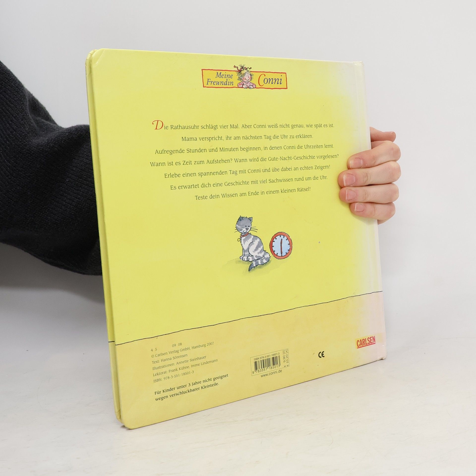 Die Rathausuhr schlägt vier Mal. Aber Conni weiß nicht genau, wie spät es ist. Doch Mama verspricht, ihr am nächsten Tag die Uhr zu erklären. Aufregende Stunden und Minuten beginnen, in denen Conni die Uhrzeiten lernt. Wann ist es Zeit zum Aufstehen? Wann wird die Gute-Nacht-Geschichte vorgelesen? Die Geschichte erzählt einen Tag in Connis Leben und liefert viele Informationen rund um die Uhr und ein kleines Rätsel! CE  Warnung! Nicht geeignet für Kinder unter 3 Jahren; Verschluckbare Kleinteile, Erstickungsgefahr