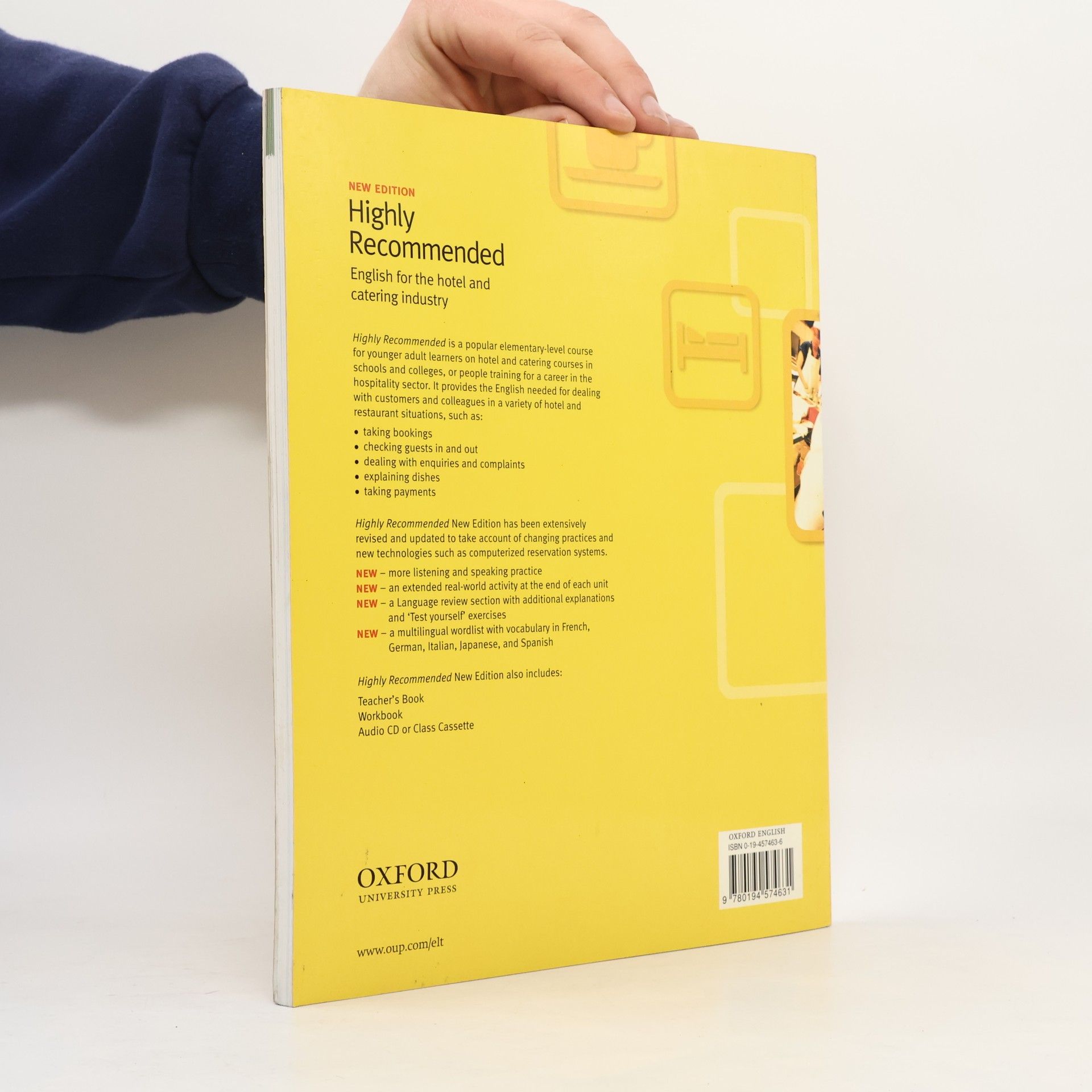 Highly Recommended is for younger trainees in the hospitality and catering industry who need English to deal with customers. This new edition has been completely revised to take account of innovations and changing practices within the sector. Key Features Topics reflect the real contexts trainees will encounter in their working lives. Emphasis on understanding and speaking English in practical situations. Two listening sections with accompanying tasks in every unit. Clear focus on key functional expressions and topic-related vocabulary. Activity section in each unit involving real-world communicative tasks. New review sections to check progress. Student's Book 28 topic-based units Tapescripts of the dialogues Six-language wordlist Language review section with exercises