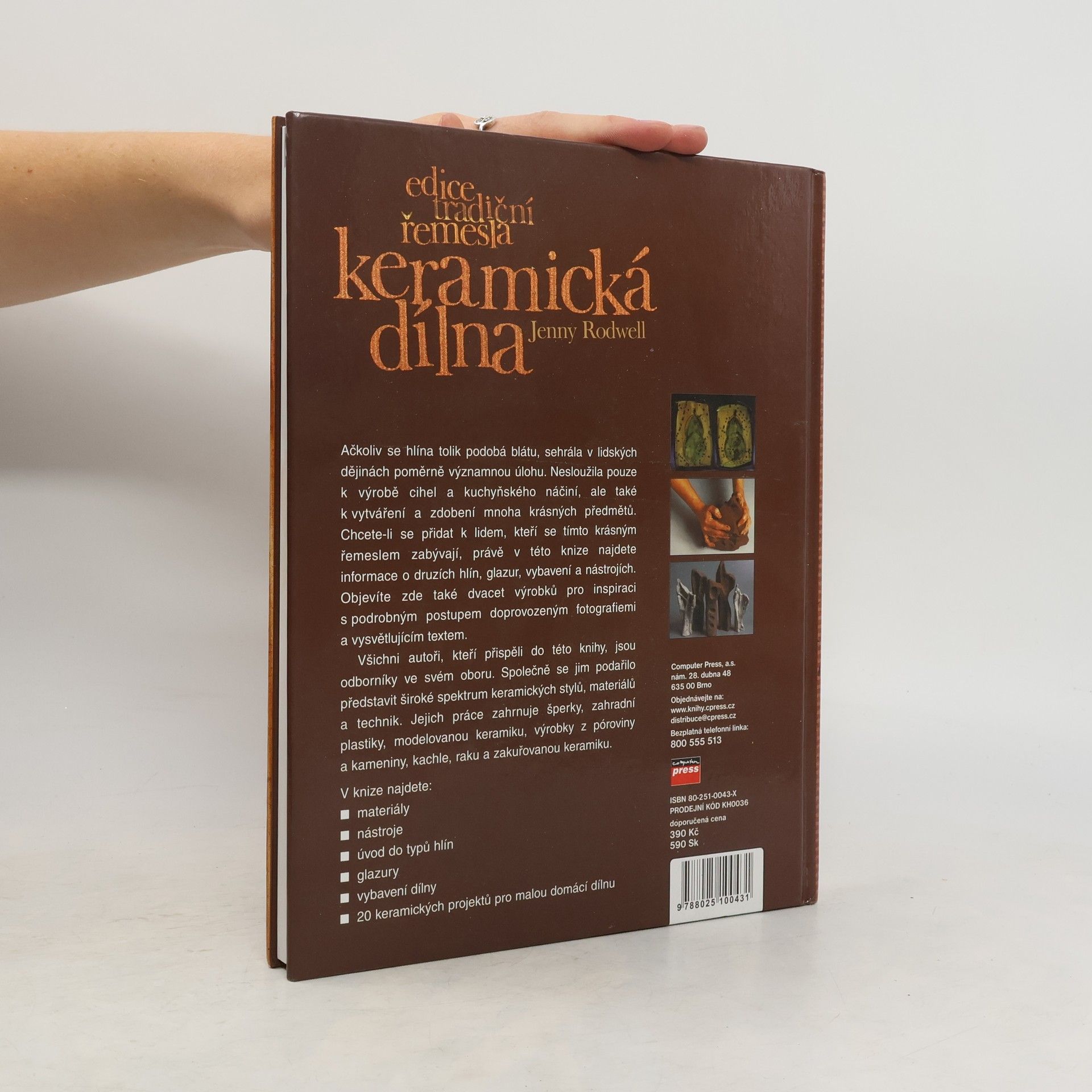 Ačkoliv se hlína tolik podobá blátu, sehrála v lidských dějinách poměrně významnou úlohu. Nesloužila pouze k výrobě cihel a kuchyňského náčiní, ale také k vytváření a zdobení mnoha krásných předmětů. Chcete-li se přidat k lidem, kteří se tímto krásným řemeslem zabývají, právě v této knize najdete informace o druzích hlín, glazur, vybavení a nástrojích. Objevíte zde také dvacet výrobků pro inspiraci s podrobným postupem doprovozeným fotografiemi a vysvětlujícím textem. Všichni autoři, kteří přispěli do této knihy, jsou odborníky ve svém oboru. Společně se jim podařilo představit široké spektrum keramických stylů, materiálů a technik. Jejich práce zahrnuje šperky, zahradní plastiky, modelovanou keramiku, výrobky z póroviny a kameniny, kachle, raku a zakuřovanou keramiku. V knize najdete: - materiály - nástroje - úvod do typů hlín - glazury - vybavení dílny - 20 keramických projektů pro malou domácí dílnu