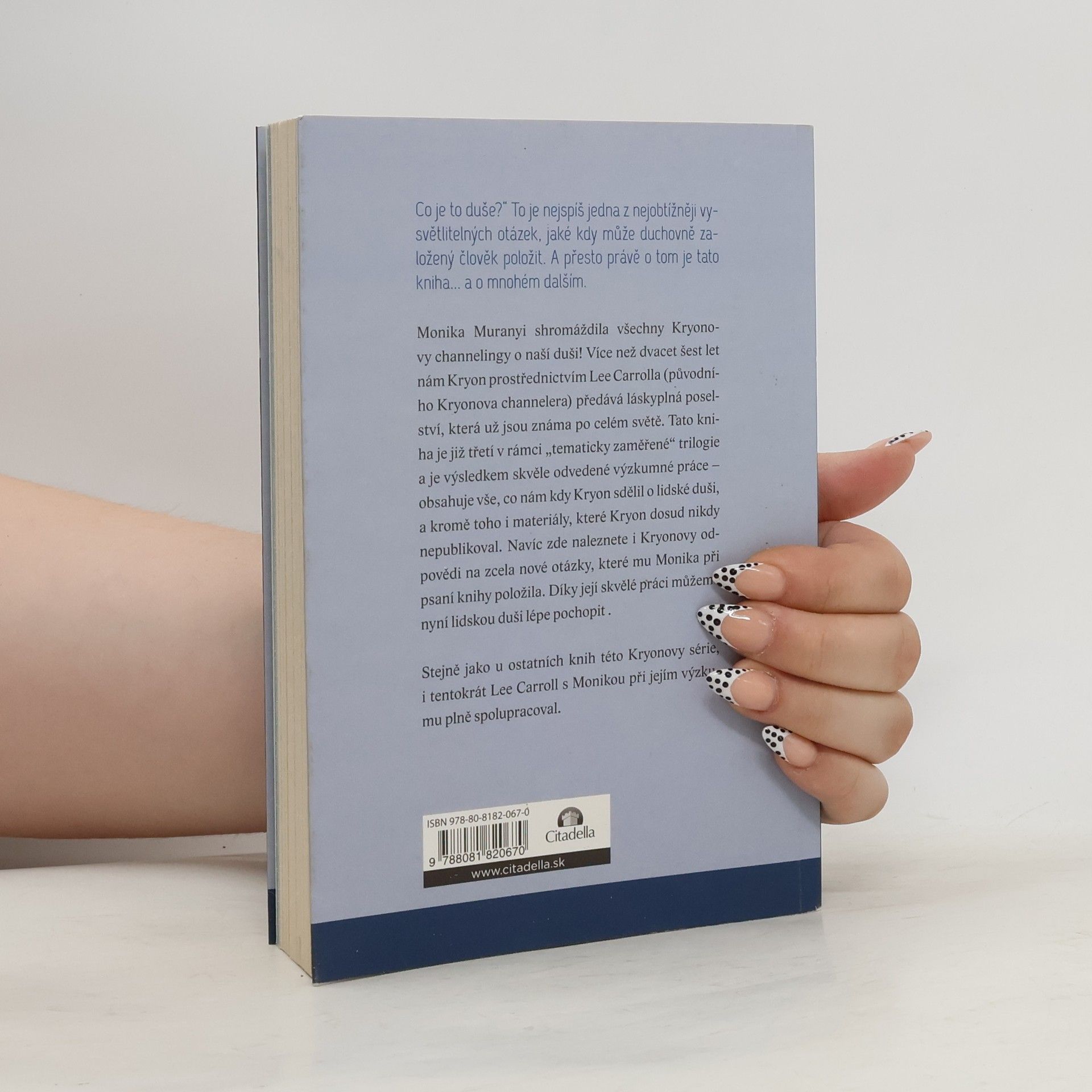 Co je to duše?“ To je nejspíš jedna z nejobtížněji vysvětlitelných otázek, jaké kdy může duchovně založený člověk položit. A přesto právě o tom je tato kniha... a o mnohém dalším. Monika Muranyi shromáždila všechny Kryonovy channelingy o naší duši! Více než dvacet šest let nám Kryon prostřednictvím Lee Carrolla (původního Kryonova channelera) předává láskyplná poselství, která už jsou známa po celém světě. Tato kniha je již třetí v rámci „tematicky zaměřené“ trilogie a je výsledkem skvěle odvedené výzkumné práce – obsahuje vše, co nám kdy Kryon sdělil o lidské duši, a kromě toho i materiály, které Kryon dosud nikdy nepublikoval. Navíc zde naleznete i Kryonovy odpovědi na zcela nové otázky, které mu Monika při psaní knihy položila. Díky její skvělé práci můžeme nyní lidskou duši lépe pochopit . Stejně jako u ostatních knih této Kryonovy série, i tentokrát Lee Carroll s Monikou při jejím výzkumu plně spolupracoval.